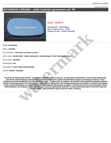 Informacje o produkcie Utworzono 07-03-2017 MITSUBISHI CARISMA - szkło lusterka ogrzewane asf. PR Cena : 30,00 zł MARKA: MITSUBISHI MODEL: CARISMA er m ar k Dostępność : Dostępny Stan magazynowy : niski Średnia ocena : brak recenzji LATA PRODUKCJI: 1995-2004 (wszystkie roczniki) PROFIL SZKŁA: ASFERYCZNE - OBRAZ ODDALONY, OGRANICZAJĄCY EFEKT MARTWEGO POLA KOLOR SZKŁA: SREBRNE OGRZEWANIE: TAK MOCOWANIE: TYLKO TAŚMA DWUSTRONNA STRONA: PRAWA - PASAŻER w at SZKIEŁKA SĄ PRODUKTEM NOWYM - KRAJOWYM (PRODUKOWANE W POLSCE), W FIRMOWYM OPAKOWANIU. POD SZKŁEM PODKLEJONA JEST MATA UMOŻLIWIAJĄCA OGRZEWANIE LUSTERKA, A POD MATĄ TAŚMA DWUSTRONNIE KLEJĄCA UŁATWIAJĄCA MONTAŻ. FOLIA GRZEWCZA MA DWA KONEKTORY DO PODPIĘCIA ZASILANIA - TRZEBA MIEĆ NA UWADZE, ŻE NIEKIEDY JEST KONIECZNA DROBNA KOREKTA WYCIĘĆ W ORYGINALNEJ PŁYTCE MONTAŻOWEJ, JEŚLI WYJŚCIA NOWEJ MATY NIE PASUJĄ IDEALNIE DO OTWORÓW W STARYM MOCOWANIU. SZKŁO Z MATĄ MONTUJEMY NA TAŚMĘ WE WŁASNE ORYGINALNE MOCOWANIE LUSTERKA. W KOMPLECIE NIE MA PLASTIKOWEGO SPODU MONTAŻOWEGO. NA PUDEŁKU PRODUCENT DOŁĄCZA KRÓTKĄ INSTRUKCJĘ MONTAŻU. W RAZIE JAKICHKOLWIEK PYTAŃ DOTYCZĄCYCH ZAMOCOWANIA, BĄDŹ WYMIANY SZKIEŁ SŁUŻYMY RADĄ I POMOCĄ.