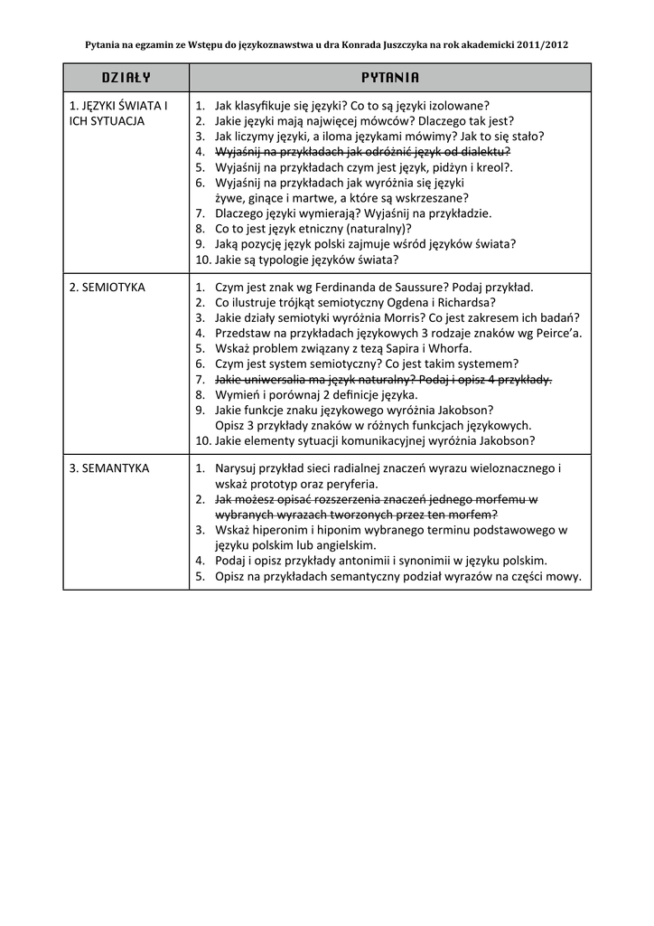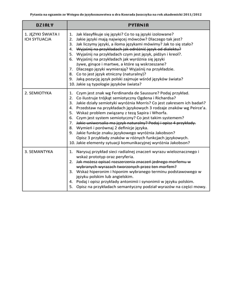 Pytania na egzamin ze Wstępu do językoznawstwa u dra Konrada Juszczyka na rok akademicki 2011/2012 DZIAŁY PYTANIA 1. JĘZYKI ŚWIATA I ICH SYTUACJA 1. 2. 3. 4. 5. 6. Jak klasyfikuje się języki? Co to są języki izolowane? Jakie języki mają najwięcej mówców? Dlaczego tak jest? Jak liczymy języki, a iloma językami mówimy? Jak to się stało? Wyjaśnij na przykładach jak odróżnić język od dialektu? Wyjaśnij na przykładach czym jest język, pidżyn i kreol?. Wyjaśnij na przykładach jak wyróżnia się języki żywe, ginące i martwe, a które są wskrzeszane? 7. Dlaczego języki wymierają? Wyjaśnij na przykładzie. 8. Co to jest język etniczny (naturalny)? 9. Jaką pozycję język polski zajmuje wśród języków świata? 10. Jakie są typologie języków świata? 2. SEMIOTYKA 1. 2. 3. 4. 5. 6. 7. 8. 9. 3. SEMANTYKA 1. Narysuj przykład sieci radialnej znaczeń wyrazu wieloznacznego i wskaż prototyp oraz peryferia. 2. Jak możesz opisać rozszerzenia znaczeń jednego morfemu w wybranych wyrazach tworzonych przez ten morfem? 3. Wskaż hiperonim i hiponim wybranego terminu podstawowego w języku polskim lub angielskim. 4. Podaj i opisz przykłady antonimii i synonimii w języku polskim. 5. Opisz na przykładach semantyczny podział wyrazów na części mowy. Czym jest znak wg Ferdinanda de Saussure? Podaj przykład. Co ilustruje trójkąt semiotyczny Ogdena i Richardsa? Jakie działy semiotyki wyróżnia Morris? Co jest zakresem ich badań? Przedstaw na przykładach językowych 3 rodzaje znaków wg Peirce’a. Wskaż problem związany z tezą Sapira i Whorfa. Czym jest system semiotyczny? Co jest takim systemem? Jakie uniwersalia ma język naturalny? Podaj i opisz 4 przykłady. Wymień i porównaj 2 definicje języka. Jakie funkcje znaku językowego wyróżnia Jakobson? Opisz 3 przykłady znaków w różnych funkcjach językowych. 10. Jakie elementy sytuacji komunikacyjnej wyróżnia Jakobson? Pytania na egzamin ze Wstępu do językoznawstwa u dra Konrada Juszczyka na rok akademicki 2011/2012 DZIAŁY PYTANIA 4. FONETYKA I FONOLOGIA 1. Wymień i opisz funkcje artykulacyjne 4 wybranych narządów mowy. Podaj głoski , w których artykulacji biorą udział wybrane narządy. 2. Wymień i opisz cechy artykulacyjne 4 samogłosek polskich. Podaj wyrazy, w których występują. 3. Wymień i opisz na przykładach 2 rodzaje dystrybucji głosek. Podaj wyrazy w języku polskim, w których występują. 4. Wymień i opisz 4 spółgłoski polskie. Podaj wyrazy, w których występują. 5. Wymień i opisz na przykładach 2 rodzaje procesów fonologicznych. Podaj wyrazy, w których występują. 6. Wymień i opisz na przykładach 2 rodzaje asymilacji. Podaj wyrazy w języku polskim, w których występują. 7. Wymień i opisz na przykładach 2 rodzaje akcentu. Podaj wyrazy , w których te 2 rodzaje akcentu występują. 8. Wymień i opisz na przykładach 2 rodzaje wariantów fonemu. Podaj wyrazy, w których występują te warianty. 9. Wymień i opisz zastosowanie 2 rodzajów transkrypcji. 10. Jakie głoski mogą być ośrodkiem sylaby? Wyjaśnij na przykładach. 5. MORFOLOGIA I MORFONOLOGIA 1. Opisz na 2 przykładach wyrazy złożone. Skąd się biorą takie wyrazy? 2. Opisz na 2 przykładach derywaty proste. Z jakich wyrazów wzięły się te wyrazy? 3. Opisz na 2 przykładach derywaty afiksalne i podaj wyrazy od jakich pochodzą. 4. Opisz na 2 przykładach derywaty alternacyjne (ilościowy i jakościowy) i podaj wyrazy od jakich pochodzą. 5. Opisz na 2 przykładach derywaty mieszane i/lub wsteczne oraz podaj wyrazy od jakich pochodzą. 6. Opisz na 2 przykładach zdrobnienia. Skąd się biorą takie jednostki w języku? 7. Opisz na 2 przykładach skrótowce. Skąd się biorą takie jednostki w języku? 8. Opisz na 2 przykładach wyrazowce, czyli kontaminacje (ang. blends). Skąd się biorą takie jednostki w języku? 9. Opisz na 2 przykładach derywaty składniowe, czyli konstrukcje, zwane także związkami frazeologicznymi. Skąd się biorą takie jednostki w języku? 10. Opisz na przykładach 2 wybrane typy morfemów słowotwórczych (afiksy). Podaj wyrazy, w których są te morfemy. Pytania na egzamin ze Wstępu do językoznawstwa u dra Konrada Juszczyka na rok akademicki 2011/2012 DZIAŁY PYTANIA 6. Morfologia (typologia) 1. Na czym polega analityczność w językach izolujących? W jakich językach występuje? Wyjaśnij na przykładach zdań. 2. Czym charakteryzuje się aglutynacyjność? W jakich językach występuje? Wyjaśnij na przykładach zdań. 3. Czym charakteryzują się języki fleksyjne? Podaj przykład takiego języka. 4. Jak opisuje się zdania w językach polisyntetycznych? Podaj przykład takiego języka. 5. Co wyróżnia języki alternacyjne na tle innych? Podaj przykład takiego języka. 7. SKŁADNIA 1. Podaj przykład zdania wg schematu zdarzeń BYCIE w języku polskim. Jakie role semantyczne odgrywają ich uczestnicy? Jakie części zdania i mowy możesz wyróżnić w wybranym zdaniu? 2. Podaj przykład zdania wg schematu zdarzeń WYDARZENIE w języku polskim. Jakie role semantyczne odgrywają ich uczestnicy? Jakie części zdania i mowy możesz wyróżnić w wybranym zdaniu? 3. Podaj przykład zdania wg schematu zdarzeń DZIAŁANIE w języku polskim. Jakie role semantyczne odgrywają ich uczestnicy? Jakie części zdania i mowy możesz wyróżnić w wybranym zdaniu? 4. Podaj przykład zdania wg schematu zdarzeń DOZNAWANIE w języku polskim. Jakie role semantyczne odgrywają ich uczestnicy? Jakie części zdania i mowy możesz wyróżnić w wybranym zdaniu? 5. Podaj przykład zdania wg schematu zdarzeń POSIADANIE w języku polskim. Jakie role semantyczne odgrywają ich uczestnicy? Jakie części zdania i mowy możesz wyróżnić w wybranym zdaniu? 6. Podaj przykład zdania wg schematu zdarzeń PRZEMIESZCZANIE w języku polskim. Jakie role semantyczne odgrywają ich uczestnicy? Jakie części zdania i mowy możesz wyróżnić w wybranym zdaniu? 7. Podaj przykł