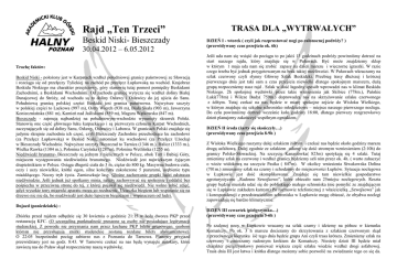Rajd „Ten Trzeci” Beskid Niski- Bieszczady 30.04.2012 – 6.05.2012 Trochę faktów: Beskid Niski - położony jest w Karpatach wzdłuż południowej granicy państwowej ze Słowacją i rozciąga się od przełęczy Tylickiej na zachód po przełęcz Łupkowską na wschód. Krajobraz Beskidu Niskiego ma charakter przejściowy, góry stanowią tutaj pomost pomiędzy Beskidami Zachodnimi, a Beskidami Wschodnimi. Od zachodu granicę wytycza się wzdłuż doliny Białej Dunajcowej do Stróży, od wschodu są to doliny Osławy i Osławicy do jej ujścia do Sanu. Południową granicą polskiej części Beskidu jest granica państwowa. Najwyższe szczyty w polskiej części to Lackowa (997 m), Ostry Wierch (938 m), Biała Skała (903 m), Jaworzyna Konieczniańska (881 m), Kamień nad Jaśliskami (859 m), Magura Wątkowska (847 m). Bieszczady - zajmują najbardziej na południowym-wschodzie wysunięty skrawek Polski. Stanowią one część głównego łuku karpackiego i są pierwszym członem Karpat Wschodnich, zaczynających się od doliny Sanu, Osławy, Osławicy i Laborca. W granicach Polski znajduje się jedynie skrajnie zachodnia ich częsć, czyli Bieszczady Zachodnie przechodzące ku zachodowi (za Przełęcz Łupkowską) w Beskid Niski, natomiast ku wschodowi (za Przełęcz Użocką) w Bieszczady Wschodnie. Najwyższe szczyty Bieszczad to Tarnica (1346 m.), Halicz (1333 m.), Wielka Rawka (1304 m.), Połonina Caryńska (1287m), Połonina Wetlińska (1255 m). Niedżwiedź brunatny- Bieszczady są jednym z nielicznych w Polsce, obok Tatr i Babiej Góry, miejscem występowania niedźwiedzia brunatnego. Niedźwiedź jest największym żyjącym drapieżnikiem w Polsce. Osiąga długość ciała do 3 m, ciężar do 800 kg. Masywna budowa ciała, oczy i uszy niewielkie, krótki ogon, silne kończyny zakończone 5 pazurami, uzębienie typu miażdżącego. Nocny tryb życia. Zamieszkuje lasy. Głośne zachowanie grupki ludzi odstrasza niedźwiedzie. Jeśli jednak już spotkamy misia, należy zachowywać się spokojnie i oddalić bez pośpiechu w przeciwną stronę do tej, z której pojawił się niedźwiedź. Nie wolno robić zdjęć, gdyż wysokie tony migawki aparatu mogą go rozdrażnić. Ucieczka biegiem lub wspinanie się na drzewo nic nie da, bo niedźwiedź jest dużo lepszym biegaczem i wspinaczem od ludzi. TRASA DLA „WYTRWAŁYCH” DZIEŃ I - wtorek ( czyli jak rozprostować nogi po całonocnej podróży? ) (przewidywany czas przejścia ok. 6h) Jeśli uda nam się wsiąść do pociągu to po jakiś 13 godzinach podróży powinniśmy dotrzeć na start naszego rajdu, który znajduje się w Puławach. Być może znajdziemy sklep w którym 1 maja uda nam się zrobić zapasy na dzień marszu i wieczorne igraszki. W razie czego trzeba być jednak przygotowanym na brak takiej możliwości. W Puławach wkraczamy na szlak czerwony czyli słynny Główny Szlak Beskidzki. Przebieg trasy dłuższej i krótszej pierwszego dnia jest taki sam a czas przejścia niewielki dlatego spokojnym marszem, dużą grupą rozpoczniemy nasz rajd . Szlak w dość łagodny sposób wprowadzi nas w klimat Beskidu Niskiego. 2h spokojnej wędrówki przez takie wzniesienia jak Skibice (778m.), Pańskie Łuki(778m) i Wilcze Budy( 759m.) doprowadzą nas na skrzyżowanie szlaku czerwonego z żółtym. Tutaj czekać na nas będzie w miarę spokojne zejście do Wisłoku Wielkiego, w którym znajduje się szkolne schronisko młodzieżowe – miejsce naszego pierwszego noclegu. Do celu powinniśmy dotrzeć wcześnie koło godziny 18:00, dlatego pierwszy rozgrzewkowy dzień planujemy zakończyć wspólnym ogniskiem. DZIEŃ II środa (żarty się skończyły…) (przewidywany czas przejścia 8-9h ) Z Wisłoka Wielkiego ruszymy dalej szlakiem żółtym i czekać nas będzie około godziny marszu drogą asfaltową. Dalej zgodnie ze szlakiem udamy się dość stromym wzniesieniem (2:10h) do granicy Polsko-Słowackiej. Na szczycie Kanasiówka( 823m) spotykają się 4 szlaki. Tutaj zmienimy szlak na czerwony i wzdłuż granicy będziemy szli nim przez ok. 4h. ( warto zahaczyć o wieże widokową na szczycie Pasika ( 847m). W okolicy wniesienia Siwakowska Dolina (701m.) zmieniamy szlak na czarny i schodzimy do miejscowości Łupków. Sytuacja noclegowa w Łupkowie jest dość skomplikowana. Znajduje się tam niewielkie gospodarstwo agroturystyczne „Radosne Szwejkowo”, które obiecało nam 25miejsc noclegowych. Reszta grupy będzie musiała udać się do pobliskiego małego schroniska (nie pomylić ze znajdującym się w Łupkowie zakładem karnym) Po rozmowie telefonicznej z właścicielką „Szwejkowa” jak i korespondencji z przedstawicielem schroniska w Łupkowie mogę obiecać, że obydwa noclegi zapowiadają się bardzo klimatycznie. Dojazd (poniedziałek) : Zbiórka przed rajdem odbędzie się 30 kwietnia o godzinie 21:15 w holu dworca PKP przed restauracją KFC. (O szczególną punktualność proszone są osoby nie posiadające legitymacji studenckiej. Z powodu nie przyznania nam przez kochane PKP biletu grupowego, osobom którym nie przysługują zniżki studenckie zostaną rozdane bilety abonamentowe). O 22:05 bezpośredni pociąg zabierze nas z Poznania do Tarnowa. Planowy przyjazd przewidziany jest na godz. 8:43. W Tarnowie czekać na nas będą wynajęte autokary, które zawiozą nas do Puław skąd rozpoczniemy naszą wędrówkę. DZIEŃ III czwartek (pielgrzymka…) (przewidywany czas przejścia 5-6h ) Po szalonej nocy w Łupkowie wracamy na szlak czarny i idziemy na północ w kierunku Komańczy. Po ok. 3 h marszu docieramy do skrzyżowania z szlakiem czerwonym skąd z przeciwnego kierunku iść tego dnia będzie grupa Ani czyli trasa krótsza. Zmieniamy szlak na czerwony i zmierzamy radosnym krokiem do Komańczy. Niestety dzień III będzie miał charakter pielgrzymkowy ponieważ większa część szlaku wiedzie wzdłuż drogi asfaltowej. Trasa dnia III jest łatwa i krótka dlatego możemy sobie pozwolić na z