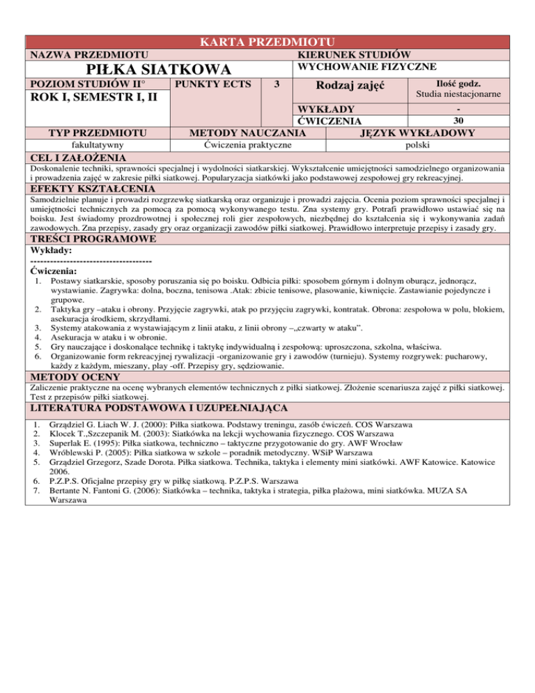 KARTA PRZEDMIOTU NAZWA PRZEDMIOTU KIERUNEK STUDIÓW WYCHOWANIE FIZYCZNE PIŁKA SIATKOWA POZIOM STUDIÓW II° PUNKTY ECTS 3 ROK I, SEMESTR I, II TYP PRZEDMIOTU fakultatywny Rodzaj zajęć Ilość godz. Studia niestacjonarne WYKŁADY 30 ĆWICZENIA METODY NAUCZANIA JĘZYK WYKŁADOWY Ćwiczenia praktyczne polski CEL I ZAŁOŻENIA Doskonalenie techniki, sprawności specjalnej i wydolności siatkarskiej. Wykształcenie umiejętności samodzielnego organizowania i prowadzenia zajęć w zakresie piłki siatkowej. Popularyzacja siatkówki jako podstawowej zespołowej gry rekreacyjnej. EFEKTY KSZTAŁCENIA Samodzielnie planuje i prowadzi rozgrzewkę siatkarską oraz organizuje i prowadzi zajęcia. Ocenia poziom sprawności specjalnej i umiejętności technicznych za pomocą za pomocą wykonywanego testu. Zna systemy gry. Potrafi prawidłowo ustawiać się na boisku. Jest świadomy prozdrowotnej i społecznej roli gier zespołowych, niezbędnej do kształcenia się i wykonywania zadań zawodowych. Zna przepisy, zasady gry oraz organizacji zawodów piłki siatkowej. Prawidłowo interpretuje przepisy i zasady gry. TREŚCI PROGRAMOWE Wykłady: ------------------------------------Ćwiczenia: 1. 2. 3. 4. 5. 6. Postawy siatkarskie, sposoby poruszania się po boisku. Odbicia piłki: sposobem górnym i dolnym oburącz, jednorącz, wystawianie. Zagrywka: dolna, boczna, tenisowa .Atak: zbicie tenisowe, plasowanie, kiwnięcie. Zastawianie pojedyncze i grupowe. Taktyka gry –ataku i obrony. Przyjęcie zagrywki, atak po przyjęciu zagrywki, kontratak. Obrona: zespołowa w polu, blokiem, asekuracja środkiem, skrzydłami. Systemy atakowania z wystawiającym z linii ataku, z linii obrony –„czwarty w ataku”. Asekuracja w ataku i w obronie. Gry nauczające i doskonalące technikę i taktykę indywidualną i zespołową: uproszczona, szkolna, właściwa. Organizowanie form rekreacyjnej rywalizacji -organizowanie gry i zawodów (turnieju). Systemy rozgrywek: pucharowy, każdy z każdym, mieszany, play -off. Przepisy gry, sędziowanie. METODY OCENY Zaliczenie praktyczne na ocenę wybranych elementów technicznych z piłki siatkowej. Złożenie scenariusza zajęć z piłki siatkowej. Test z przepisów piłki siatkowej. LITERATURA PODSTAWOWA I UZUPEŁNIAJĄCA 1. 2. 3. 4. 5. 6. 7. Grządziel G. Liach W. J. (2000): Piłka siatkowa. Podstawy treningu, zasób ćwiczeń. COS Warszawa Klocek T.,Szczepanik M. (2003): Siatkówka na lekcji wychowania fizycznego. COS Warszawa Superlak E. (1995): Piłka siatkowa, techniczno – taktyczne przygotowanie do gry. AWF Wrocław Wróblewski P. (2005): Piłka siatkowa w szkole – poradnik metodyczny. WSiP Warszawa Grządziel Grzegorz, Szade Dorota. Piłka siatkowa. Technika, taktyka i elementy mini siatkówki. AWF Katowice. Katowice 2006. P.Z.P.S. Oficjalne przepisy gry w piłkę siatkową. P.Z.P.S. Warszawa Bertante N. Fantoni G. (2006): Siatkówka – technika, taktyka i strategia, piłka plażowa, mini siatkówka. MUZA SA Warszawa
