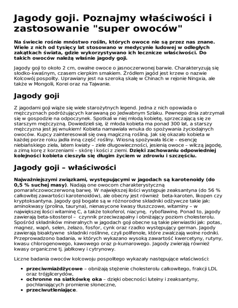 Jagody goji. Poznajmy właściwości i zastosowanie "super owoców" Na świecie rośnie mnóstwo roślin, których owoce nie są przez nas znane. Wiele z nich od tysięcy lat stosowano w medycynie ludowej w odległych zakątkach świata, gdzie wykorzystywano ich lecznicze właściwości. Do takich owoców należą właśnie jagody goji. Jagody goji to około 2 cm, owalne owoce o jasnoczerwonej barwie. Charakteryzują się słodko-kwaśnym, czasem cierpkim smakiem. Źródłem jagód jest krzew o nazwie Kolcowój pospolity. Uprawiany jest na szeroką skalę w Chinach w rejonie Ningxia, ale także w Mongolii, Korei oraz na Tajwanie. Jagody goji Z jagodami goji wiąże się wiele starożytnych legend. Jedna z nich opowiada o mężczyznach podróżujących karawaną po Jedwabnym Szlaku. Pewnego dnia zatrzymali się w gospodzie na odpoczynek. Spotkali w niej młodą kobietę, sprzeczającą się ze starszym mężczyzną. Dowiedzieli się, iż młoda kobieta ma ponad 300 lat, a starszy mężczyzna jest jej wnukiem! Kobieta namawiała wnuka do spożywania życiodajnych owoców. Kupcy zainteresowali się ową magiczną rośliną. Jak się okazało kobieta w każdej porze roku jadła inną część rośliny. Wiosną spożywała liście – esencję niebiańskiego ziela, latem kwiaty – ziele długowieczności, jesienią owoce – wilczą jagodę, a zimą korę z korzeniami – skórę i kości z ziemi. Dzięki zachowaniu odpowiedniej kolejności kobieta cieszyła się długim życiem w zdrowiu i szczęściu. Jagody goji – właściwości Najważniejszymi związkami, występującymi w jagodach są karotenoidy (do 0,5 % suchej masy). Nadają one owocom charakterystyczną pomarańczowoczerwoną barwę. W największej ilości występuje zeaksantyna (do 56 % całkowitej zawartości karotenoidów), ale obecny jest również beta-karoten, likopen czy kryptoksantyna. Jagody goji bogate są w różnorodne składniki odżywcze takie jak: aminokwasy (prolina, tauryna), nienasycone kwasy tłuszczowe, witaminy – w największej ilości witaminę C, a także tokoferol, niacynę, ryboflawinę. Ponad to, jagody zawierają beta-sitosterol – czynnik przeciwzapalny i obniżający poziom cholesterolu. Spośród składników mineralnych w jagodach goji obecne są takie pierwiastki jak: potas, magnez, wapń, selen, żelazo, fosfor, cynk oraz rzadko występujący german. Jagody zawierają bioaktywne składniki roślinne, czyli polifenole, które zwalczają wolne rodniki. Przeprowadzono badania, w których wykazano wysoką zawartość kwercetyny, rutyny, kwasu chlorogenowego, kawowego oraz p-kumarowego. Jagody zwierają również kwasy organiczne tj. jabłkowy i cytrynowy. Liczne badania owoców kolcowoju pospolitego wykazały następujące właściwości: przeciwmiażdżycowe – obniżają stężenie cholesterolu całkowitego, frakcji LDL oraz trójglicerydów, ochronne na siatkówkę oka – dzięki obecności luteiny i zeaksantyny, pochłaniających promienie słoneczne, przeciwutleniające. Jagody goji – zastosowanie W tradycyjnej medycynie i kuchni chińskiej jagody są znane od ponad 2000 lat. Wykorzystywano je jako dodatek do różnorodnych potraw warzywnych, mięsnych, a także do zup. Obecnie w kuchni chińskiej suszone jagody przed spożyciem poddawane są obróbce termicznej. Konsumowane są jako dodatek do ryżu, wieprzowiny oraz warzyw. Z jagód często sporządza się herbatkę z kwiatami chryzantem, jujubą lub dodaje się je do herbaty typu Pu-erh. W Chinach z owoców goji produkuje się wino, a nawet piwo. Owoce kolcowoju pospolitego dostępne są w sprzedaży na całym świecie. Najczęściej spożywa się je w postaci suszonej jako przekąskę. Na rynku dostępne są soki, olej z nasion, jagody w polewie jogurtowej lub czekoladowej oraz jagody sproszkowane. Jagody goji są postrzegane w wielu krajach, zwłaszcza w Stanach Zjednoczonych, jako wartościowy składnik diety prozdrowotnej. Od pewnego czasu zaliczane są do grona superowoców (super fruits), które charakteryzują się udowodnioną, wysoką aktywnością biologiczną. Należy jednak pamiętać, że mimo licznych zalet, jagody goji mają także wady. Kobiety w ciąży oraz karmiące powinny wystrzegać się diety, w której obecne są te owoce, ze względu na zawartość betainy. Warto również wspomnieć, że odnotowano przypadki reakcji alergicznych oraz interakcji składników goji z lekami przeciwzakrzepowymi. Kup jagody goji z rabatem 3% już teraz ! (wpisz bonavita w polu „kod specjalny” w koszyku) Author: Agnieszka Czapla Link do artykułu: http://bonavita.pl/jagody-goji-poznajmy-wlasciwosci-i-zastosowaniesuper-owocow