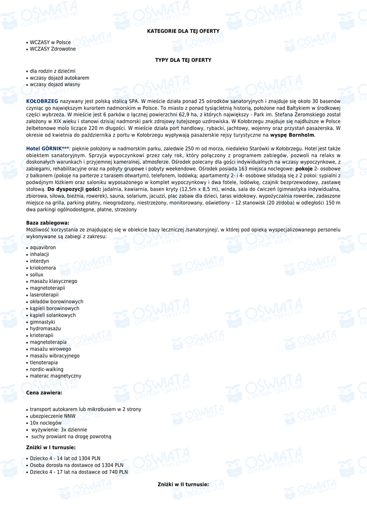 KATEGORIE DLA TEJ OFERTY ● ● WCZASY w Polsce WCZASY Zdrowotne TYPY DLA TEJ OFERTY ● ● ● dla rodzin z dziećmi wczasy dojazd autokarem wczasy dojazd własny KOŁOBRZEG nazywany jest polską stolicą SPA. W mieście działa ponad 25 ośrodków sanatoryjnych i znajduje się około 30 basenów czyniąc go największym kurortem nadmorskim w Polsce. To miasto z ponad tysiącletnią historią, położone nad Bałtykiem w środkowej części wybrzeża. W mieście jest 6 parków o łącznej powierzchni 62,9 ha, z których największy - Park im. Stefana Żeromskiego został założony w XIX wieku i stanowi dzisiaj nadmorski park zdrojowy tutejszego uzdrowiska. W Kołobrzegu znajduje się najdłuższe w Polsce żelbetonowe molo liczące 220 m długości. W mieście działa port handlowy, rybacki, jachtowy, wojenny oraz przystań pasażerska. W okresie od kwietnia do października z portu w Kołobrzegu wypływają pasażerskie rejsy turystyczne na wyspę Bornholm. Hotel GÓRNIK***: pięknie położony w nadmorskim parku, zaledwie 250 m od morza, niedaleko Starówki w Kołobrzegu. Hotel jest także obiektem sanatoryjnym. Sprzyja wypoczynkowi przez cały rok, który połączony z programem zabiegów, pozwoli na relaks w doskonałych warunkach i przyjemnej kameralnej, atmosferze. Ośrodek polecany dla gości indywidualnych na wczasy wypoczynkowe, z zabiegami, rehabilitacyjne oraz na pobyty grupowe i pobyty weekendowe. Ośrodek posiada 163 miejsca noclegowe: pokoje 2- osobowe z balkonem (pokoje na parterze z tarasem otwartym), telefonem, lodówką; apartamenty 2- i 4- osobowe składają się z 2 pokoi: sypialni z podwójnym łóżkiem oraz saloniku wyposażonego w komplet wypoczynkowy i dwa fotele, lodówkę, czajnik bezprzewodowy, zastawę stołową. Do dyspozycji gości: jadalnia, kawiarnia, basen kryty (12,5m x 8,5 m), winda, sala do ćwiczeń (gimnastyka indywidualna, zbiorowa, siłowa, bieżnia, rowerek), sauna, solarium, jacuzzi, plac zabaw dla dzieci, taras widokowy, wypożyczalnia rowerów, zadaszone miejsce na grilla, parking płatny, nieogrodzony, niestrzeżony, monitorowany, oświetlony – 12 stanowisk (20 zł/doba) w odległości 150 m dwa parkingi ogólnodostępne, płatne, strzeżony Baza zabiegowa: Możliwość korzystania ze znajdującej się w obiekcie bazy leczniczej /sanatoryjnej/, w której pod opieką wyspecjalizowanego personelu wykonywane są zabiegi z zakresu: ● ● ● ● ● ● ● ● ● ● ● ● ● ● ● ● ● ● ● ● aquavibron inhalacji interdyn kriokomora sollux masażu klasycznego magnetoterapii laseroterapii okładów borowinowych kąpieli borowinowych kąpieli solankowych gimnastyki hydromasażu krioterapii magnetoterapia masażu wirowego masażu wibracyjnego tlenoterapia nordic-walking materac magnetyczny Cena zawiera: ● ● ● ● ● transport autokarem lub mikrobusem w 2 strony ubezpieczenie NNW 10x noclegów wyżywienie: 3x dziennie suchy prowiant na drogę powrotną Zniżki w I turnusie: ● ● ● Dziecko 4 - 14 lat od 1304 PLN Osoba dorosła na dostawce od 1304 PLN Dziecko 4 - 17 lat na dostawce od 740 PLN Zniżki w II turnusie: ● ● ● Dziecko 4 - 14 lat od 1800 PLN Osoba dorosła na dostawce od 1800 PLN Dziecko 4 - 17 lat na dostawce od 790 PLN Zniżki w III turnusie: ● ● ● Dziecko 4 - 14 lat od 2072 PLN Osoba dorosła na dostawce od 2072 PLN Dziecko 4 - 17 lat na dostawce od 890 PLN Pobyt rozpoczyna się kolacją w dniu przyjazdu i kończy śniadaniem w dniu wyjazdu. WAŻNE INFORMACJE: ● ● ● ● ● ● ● ● ● ● ● ● niewykorzystanie któregokolwiek świadczenia nie powoduje zmiany ceny. przy zakupie więcej niż jednego turnusu obiad miedzy turnusami GRATIS. doba hotelowa rozpoczyna się od godziny 17.00 (w dniu wyjazdu pokój należy opuścić do godz. 10.00) uczestniczy są zobowiązani do przestrzegania regulaminu obiektu. oferta całoroczna, dodatkowych informacji o terminach i cenach udzielamy w biurze. prosimy o przybywanie na miejsce zbiórek 15 minut przed planowanym czasem odjazdu organizator nie ponosi odpowiedzialności za spóźnienia spowodowane złymi warunkami drogowymi, atmosferycznymi, dużym natężeniem ruchu postoje w trakcie podróży są organizowane w miejscach do tego przystosowanych (z toaletami) na miejscu pobierana jest dodatkowo meldunkowa opłata klimatyczna godziny i miejsca wyjazdów należy potwierdzić na 24 godziny przed planowanym wyjazdem, organizator zastrzega sobie możliwość odwołania transportu w przypadku małej ilości osób, obowiązują warunki uczestnictwa organizatora imprezy. Możliwe terminy wyjazdu Lp. Data początku Data końca Cena Wolne miejsca 1. 19-05-2017 29-05-2017 1570 zł termin jest niedostępny 2. 30-05-2017 10-06-2017 2190 zł termin jest niedostępny 3. 11-06-2017 24-06-2017 2530 zł termin jest niedostępny Możliwe miejsca wyjazdu Lp. Miasto Adres Dopłata Wyjazd 1. Bieruń Plac autobusowy przy KWK "Piast", ul. Granitowa +0 zł 07:00 2. Lędziny Plac autobusowy przy KWK "Ziemowit", ul. Pokoju +0 zł 07:30 3. Tychy Parking przy Urzędzie Miejskim, Al. Niepodległości 49 +0 zł 08:00 4. Katowice Stacj BP, Aleja Górnośląska obok Praktikera, kierunek Wrocław +0 zł 08:30