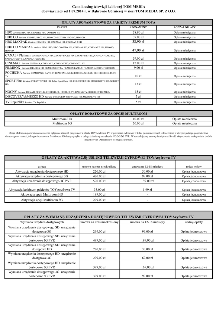 Cennik usług telewizji kablowej TOM MEDIA obowiązujący od 1.07.2014 r. w Dąbrowie Górniczej w sieci TOM MEDIA SP. Z O.O. OPŁATY ABONAMENTOWE ZA PAKIETY PREMIUM TOYA ABONAMENT RODZAJ OPŁATY 28.90 zł 37.00 zł Opłata miesięczna 38,90 zł Opłata miesięczna 47,00 zł Opłata miesięczna 59.00 zł 12.00 zł 9.90 zł Opłata miesięczna 10 zł Opłata miesięczna HD 13 zł Opłata miesięczna NOCNY Zawiera: PRIVATE SPICE, BLUE HUSTLER, HUSTLER TV, DARING!TV, REDLIGHT PREMIUM DISCOVERY&MEZZO HD Zawiera: DISCOVERY SHOWCASE HD, MEZZO LIVE HD 15 zł 5 zł Opłata miesięczna TV Republika Zawiera: TV Republika 5 zł Opłata miesięczna PAKIET HBO Zawiera: HBO HD, HBO2 HD, HBO COMEDY HD HBO GO Zawiera: HBO HD, HBO2 HD, HBO COMEDY HD, HBO GO, HBO OD HBO MAXPAK Zawiera: COMEDY HD, CINEMAX HD, CINEMAX 2 HD HBO GO MAXPAK zawiera: HBO 2 HD, HBO COMEDY HD, CINEMAX HD, CINEMAX 2 HD, HBO GO, HBO OD CANAL+ Platinum Zawiera: CANAL+ HD, CANAL+ SPORT HD, CANAL+ FILM HD, CANAL+ FILM 2 HD, CANAL+ Family HD, CANAL+ Family2 HD CINEMAX Zawiera: CINEMAX, CINEMAX 2, CINEMAX HD, CINEMAX 2 HD FILMBOX Zawiera: FILMBOX HD, FILMBOX EXTRA, FILMBOX FAMILY, FILMBOX ACTION, FIGHTBOX POCIECHA Zawiera: BOMERANG, DA VINCI LEARNING, NICKELODEON, NICK JR, BBC CBEEBIES, DUCK TV SPORT Plus Zawiera: POLSAT SPORT HD, Polsat Sport Extra HD, EUROSPORT HD, EUROSPORT 2 HD, NSPORT Opłata miesięczna Opłata miesięczna Opłata miesięczna Opłata miesięczna OPŁATY DODATKOWE ZA OPCJĘ MULTIROOM 10.00 zł 20.00 zł Multiroom HD Multiroom 3G Opłata miesięczna Opłata miesięczna Opcja Multiroom pozwala na niezależne oglądanie różnych programów z oferty TOYAcyfrowa TV w przekazie cyfrowym w kilku pomieszczeniach jednocześnie w obrębie jednego gospodarstwa domowego w ramach jednego abonamentu. Multiroom 3G dostępny tylko z usługą dzierżawy urządzenia HD/3G/3G PVR. W ramach jednej umowy istnieje możliwość aktywowania maksymalnie dwóch dodatkowych Odbiorników w opcji Multiroom. OPŁATY ZA AKTYWACJĘ USŁUGI TELEWIZJI CYFROWEJ TOYAcyfrowa TV usługa umowa na czas nieokreślony umowa na 12-18 miesięcy rodzaj opłaty Aktywacja urządzenia dostępowego HD Aktywacja urządzenia dostępowego 3G Aktywacja urządzenia dostępowego 3G PVR 220.00 zł 420.00 zł 520.00 zł 30.00 zł 99.00 zł 199.00 zł Opłata jednorazowa Aktywacja kolejnych pakietów TOYAcyfrowa TV Aktywacja opcji Multiroom HD 35.00 zł 199.00 zł 1.99 zł - Opłata jednorazowa Aktywacja opcji Multiroom 3G 299.00 zł - Opłata jednorazowa Opłata jednorazowa Opłata jednorazowa Opłata jednorazowa OPŁATY ZA WYMIANĘ URZĄDZENIA DOSTĘPOWEGO TELEWIZJI CYFROWEJ TOYAcyfrowa TV Wymiana urządzeń dostępowych Wymiana urządzenia dostępowego SD dostępowe 3G Wymiana urządzenia dostępowego SD dostępowe 3G PVR Wymiana urządzenia dostępowego SD dostępowe HD Wymiana urządzenia dostępowego HD dostępowe 3G umowa na czas nieokreślony umowa na 12-18 miesięcy rodzaj opłaty 299,00 zł 99,00 zł Opłata jednorazowa 499,00 zł 199,00 zł Opłata jednorazowa 220,00 zł 30,00 zł Opłata jednorazowa 299,00 zł 69,00 zł Opłata jednorazowa 399,00 zł 169,00 zł Opłata jednorazowa 399.00 zł 99.00 zł Opłata jednorazowa urządzenie urządzenie urządzenie urządzenie Wymiana urządzenia dostępowego HD urządzenie dostępowe 3G PVR Wymiana urządzenia dostępowego 3G urządzenie dostępowe 3G PVR INNE OPŁATY kwota Zawieszenie usługi TOYAcyfrowa TV bezpłatnie Wznowienie usługi TOYAcyfrowa TV 35.00 zł Jednorazowa opłata za powiadomienie wynikające z przekroczenia terminu płatności lub płatności w zaniżonej wysokości 5.00 zł Zmiana Abonenta w lokalu: · gdy w mieszkaniu jest wykonana instalacja Stowarzyszenia „TOM” , a nowy lokator kontynuuje usługi TOYA – bezpłatnie, · gdy w mieszkaniu jest wykonana instalacja Stowarzyszenia „TOM”, a nowy lokator wznawia usługi TOYA – 35.00 zł. Zmiana miejsca świadczenia Usług: · gdy w mieszkaniu brak jest Przyłącza Stowarzyszenia „TOM”, które jest możliwe do wykonania, a Abonent w poprzednim mieszkaniu posiadał Przyłącze - wg stawki wykonania Przyłącza do sieci Stowarzyszenia „TOM” , · gdy w mieszkaniu jest Przyłącze Stowarzyszenia „TOM” – 35.00 zł Konserwacja Przyłącza · usterki (awarie z winy TOYA/ Stowarzyszenia „TOM” lub niezależne od TOYA/ Stowarzyszenia „TOM”) - bezpłatnie, · usterki w mieszkaniu z winy Abonenta – 30.00 – 50.00 zł, · dewastacje z winy Abonenta - wg rzeczywistych kosztów. Opłaty za zwrot niekompletnego zestawu TOYAcyfrowa TV nazwa kwota Urządzenie dostępowe HD (wraz z osprzętem) 400.00 zł Urządzenie dostępowe HD MOTOROLLA (wraz z osprzętem) 600.00 zł Urządzenie dostępowe 3G, 3G PVR (wraz z osprzętem) Pilot do Urządzenia dostępowego Karta aktywacyjna 1000.00 zł 35.00 zł 100.00 zł Przewód HDMI 15.00 zł Przewód Euro 10.00 zł Przewód Cinch Przewód RF Zasilacz 10.00 zł 15.00 zł 100.00 zł