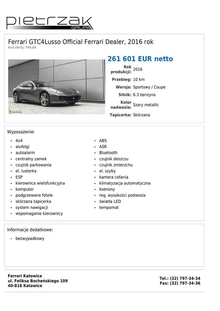 Ferrari GTC4Lusso Official Ferrari Dealer, 2016 rok Kod oferty: FRK-84 261 601 EUR netto Rok 2016 produkcji: Przebieg: 10 km Wersja: Sportowy / Coupe Silnik: 6.3 benzyna Kolor Szary metallic nadwozia: Tapicerka: Skórzana Wyposażenie: - 4x4 alufelgi autoalarm centralny zamek czujnik parkowania el. lusterka ESP kierownica wielofunkcyjna komputer podgrzewane fotele skórzana tapicerka system nawigacji wspomaganie kierownicy - ABS ASR Bluetooth czujnik deszczu czujnik zmierzchu el. szyby kamera cofania klimatyzacja automatyczna ksenony reg. wysokości podwozia światła LED tempomat Informacje dodatkowe: - bezwypadkowy Ferrari Katowice ul. Feliksa Bocheńskiego 109 40-816 Katowice Tel.: (32) 797-34-34 Fax: (32) 797-34-36