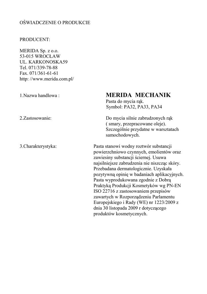 OŚWIADCZENIE O PRODUKCIE PRODUCENT: MERIDA Sp. z o.o. 53-015 WROCŁAW UL. KARKONOSKA59 Tel. 071/339-78-88 Fax. 071/361-61-61 http: //www.merida.com.pl/ 1.Nazwa handlowa : MERIDA MECHANIK Pasta do mycia rąk. Symbol: PA32, PA33, PA34 2.Zastosowanie: 3.Charakterystyka: Do mycia silnie zabrudzonych rąk ( smary, przepracowane oleje). Szczególnie przydatne w warsztatach samochodowych. Pasta stanowi wodny roztwór substancji powierzchniowo czynnych, emolientów oraz zawiesiny substancji ściernej. Usuwa najsilniejsze zabrudzenia nie niszcząc skóry. Przebadana dermatologicznie. Uzyskała pozytywną opinię w badaniach aplikacyjnych. Pasta wyprodukowana zgodnie z Dobrą Praktyką Produkcji Kosmetyków wg PN-EN ISO 22716 z zastosowaniem przepisów zawartych w Rozporządzeniu Parlamentu Europejskiego i Rady (WE) nr 1223/2009 z dnia 30 listopada 2009 r dotyczącego produktów kosmetycznych. 4. Składniki zawarte w mydle w/g I.N.C.I. Water, Decyl Glucoside, Acrylates/Vinyl Neodecanoate Crosspolymer, PEG -75 Lanolin, Polyurethane gran, Polyethylene gran, Mineral Oil, Glycereth-2 cocoate, Glyceryl Oleate, Coco Glucoside, Sodium Hydroxide, DMDM Hydantoin, Tetra sodium EDTA, CI 45100, Parfum: Cytral, Limonene 5. Wymagania techniczne zgodnie z normą ZN 2001/MRD-0010 Wygląd zewnętrzny pH 10% wodnego roztworu Zawartość substancji rozpuszczalnych w alkoholu etylowym 6. Pozostałe własności fizykochemiczne: Lepka nieprzezroczysta pasta o różowej barwie. 7,0– 9,0 ≥ 30 % Gęstość w 20ºC 0,95 g/cm³ Lepkość w 20ºC 5000÷10000 mPa·s Palność Produkt niepalny * UWAGA – po rozmrożeniu i wymieszaniu pasta odzyskuje pierwotną postać i właściwości. 7.Oznakowanie opakowań: Opakowania jednostkowe nie wymagają znakowania ostrzegawczego. 8.Opakowania handlowe: Puszki polietylenowe 500 g, Kanistry polietylenowe 5 l, Wiadra polietylenowe 5 kg, 10 kg, 20 kg, 30 kg. 9. Przechowywanie: Przechowywać w szczelnie zamkniętych kanistrach w temperaturze 5÷30ºC w nienasłonecznionych pomieszczeniach. Okres trwałości wynosi 12 miesięcy od daty wyprodukowania. 10. Transport: Nie podlega ograniczeniom przepisów ADR, RID, IMDG. MERIDA MECHANIK DATA : 2013-07-13