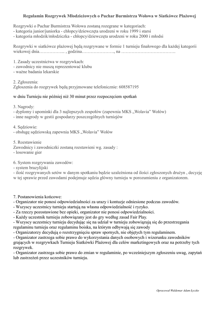 Regulamin Rozgrywek Młodzieżowych o Puchar Burmistrza Wołowa w Siatkówce Plażowej