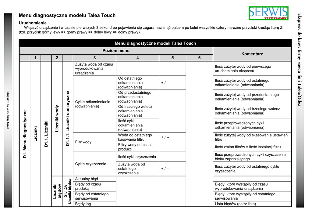 Uruchomienie Włączyć urządzenie i w czasie pierwszych 3 sekund po pojawieniu się zegara nacisnąć palcem po kolei wszystkie cztery narożne przyciski kreśląc literę Z (tzn. przycisk górny lewy => górny prawy => dolny lewy => dolny prawy). MenudiagnostycznemodeliTaleaTouch Poziommenu 1 2 3 4 5 D1.1.1.Licznikisumaryczne Licznikiwody Cykle odkamieniania (odwapniania) Filtr wody D1.1.2A Licznikibłędów Cykle czyszczenia Aktualny błąd Błędy od czasu produkcji Błędy od ostatniego serwisowania Błędy log Komentarz Ilość zużytej wody od pierwszego uruchomienia ekspresu Od ostatniego odkamieniania (odwapniania) Od przedostatniego odkamieniania (odwapniania) Od trzeciego wstecz odkamieniania (odwapniania) Ilość cykli odkamieniania (odwapniania) Woda od ostatniego kasowania filtru Filtry wody od czasu produkcji +/– Zużyta woda od ostatniego czyszczenia Ilość zużytej wody od ostatniego odkamieniania (odwapniania) Ilość zużytej wody od przedostatniego odkamieniania (odwapniania) Ilość zużytej wody od trzeciego wstecz odkamieniania (odwapniania) Ilość przeprowadzonych cykli odkamieniania (odwapniania) +/– Ilość zużytej wody od skasowania ustawień filtru Ilość zmian filtrów = ilość instalacji filtru Ilość przeprowadzonych cykli czyszczenia bloku zaparzającego Ilość cykli czyszczenia Liczniki błędów D1.1.Liczniki Liczniki Ekspresy do kawy firmy Saeco D1.Menudiagnostyczne Zużyta woda od czasu wyprodukowania urządzenia 6 +/– Ilość zużytej wody od ostatniego cyklu czyszczenia Błędy, które wystąpiły od czasu wyprodukowania urządzenia Błędy, które wystąpiły od ostatniego serwisowania Lista błędów (patrz lista) Ekspresy do kawy firmy Saeco linii Talea/Odea Menu diagnostyczne modelu Talea Touch Poziommenu D1.1.3Liczniki produktów D1.1.2ALiczniki produktów D1.1.Liczniki Liczniki Kasowanie błędów od ostatniego serwisowania Kasowanie błędów log 4 5 Tak / nie Kasowanie błędów Tak / nie Kasowanie błędów Espresso Licznik produktów Kawa Licznik produktów Kawa duża Licznik produktów Łączna ilość produktów Licznik produktów D1.2.1AUstawienia urządzenia Ustawienia urządzenia Zaparzanie wstępne Ustawienia Komentarz 6 Espresso Kawa Kawa duża Temperatura Aromat Ustawienia zaparzania Ilość kawy Zaparzanie wstępne Płukanie Temperatura Aromat Ilość kawy Średnie Mocne Wyłączone Niska Średnia Wysoka Łagodny Średni Mocny Wstępnie zmielona +/– Brak funkcji Niska Średnia Wysoka Brak funkcji +/– Ustawienia zaparzania wstępnego Temperatura kawy w filiżance Ilość dawkowania kawy Pojemność filiżanki Brak funkcji Temperatura kawy do płukania Brak funkcji Ilość wody do płukania Ekspresy do kawy firmy Saeco linii Talea/Odea Ekspresy do kawy firmy Saeco D1.Menudiagnostyczne 3 j.w 2 jw. 1 1 2 3 4 D1.2.1AUstawienia urządzenia D1.2.1B Ustawienia urządzenia Ustawienia daty Ustawienia czasu / daty Ustawienia trybu standby Urządzenie wł./wył. Ustawienia konserwacji Liczniki produktów Ustawienia specjalne Ustawienia fabryczne D1.2.2AUstawienia systemowe Ogranicznik fusów Ustawieniasystemowe Ustawienia Ekspresy do kawy firmy Saeco D1.Menudiagnostyczne Ustawienia zegara Aktualne fusy Ustawienia fusów i osadu 5 Bieżący czas Format godziny Bieżąca data Format daty 15 min 30 min 1 godz. 3 godz. Odstęp 1 Odstęp 2 Odstęp 3 Ustawienie dnia tygodnia Komentarz 6 h/min 24 godz. – AM/PM rr/mm/dd Wybrać (3) godz./min godz./min godz./min Poniedziałek - niedziela Czas aktualnego programowania Programowanie wyświetlania godziny w formacie 12 h lub 24 h Programowanie daty rok/miesiąc/dzień Programowanie formatu daty Tryb standby 15 min po użyciu Tryb standby 30 min po użyciu Tryb standby 1 godz. po użyciu Tryb standby 3 godz. po użyciu Czas włączenia 1 (czas wł./wył.) Czas włączenia 2 (czas wł./wył.) Czas włączenia 3 (czas wł./wył.) Przydział czasu włączenia dla poszczególnych dni Inicjalizacyjne ustawienia fabryczne (13) +/- (liczy się od 13 w górę) Ostrzeżenia o fusach (8) Opóźnienie kasowania fusów +/- (1 - 100) 50 = 5s Maksymalna wielkość ziaren fusów +/- (1 - 26) +/- (1 - 13) Licznik fusów Jeśli wartość jest taka sama jak licznik fusów, pojawi się komunikat „opróżnić szufladkę fusów”. Kawa pozostaje do rozlania. Licznik zostaje skasowany po opróżnieniu. Czas, po którym powinien zostać skasowany licznik fusów, gdy szufladka fusów została wyjęta. Ekspresy do kawy firmy Saeco linii Talea/Odea Poziommenu Poziommenu 1 2 3 4 Temperatura filiżanki D1.2.2AUstawieniasystemu D1.2.2B Ustawieniasystemowe Ustawienia Ustawienia grzania Temperatura pary (78) Aktywna temperatura (112) Nieaktywna temperatura (105) Aktywna temperatura (145) Nieaktywna temperatura (120) Komentarz 6 +/- (70 - 85) Temperatura kawy (w filiżance) +/- (80 - 140) Temperatura bojlera, gdy kawa jest rozlana +/- (80 - 140) Temperatura bojlera, gdy kawa nie jest rozlana +/- (130 150) Temperatura bojlera, gdy używana jest para +/- (130 150) Bez funkcji Temperatura gorącej wody (90) +/- (70 - 120) Temperatura bojlera, gdy rozlewana jest gorąca woda Ustawienia młynka Średnia dawka (80100)/(dawka automatyczn a) +/- (50 - 150) Młynek pulsuje ze średnią dawką od V … do dawki automatycznej (ustawienie automatyczne) Ustawienia przepływomierza Współczynnik przepływu gorącej wody +/- (13 - 18) (18) Dane serwisowe Wł./wył. (wł. Przejmuje dane bieżące Komunikaty o błędach Grupa funkcyjna M3: Error log Na tym poziomie menu wyświetlane są następujące informacje: ● ostatnie 20 błędy, ● data, kiedy wystąpił błąd. Współczynnik przepływu Serwis ustawień danych Ekspresy do kawy firmy Saeco linii Talea/Odea Ekspresy do kawy firmy Saeco D1.Menudiagnostyczne Temperatura kawy 5 Ekspresy do kawy firmy Saeco linii Talea/Odea Kod Krótkiopis Opis/Potencjalneuszkodzenia Nieprawidłowości w pracy młynka kawy 01 Brak impulsów czujnika Halla: • Uszkodzone czujnik / przewody •