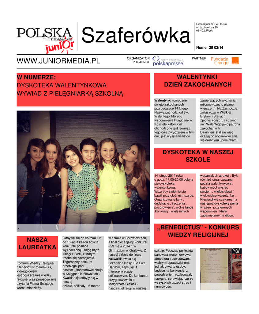 Szaferówka WWW.JUNIORMEDIA.PL ORGANIZATOR PROJEKTU Gimnazjum nr 6 w Płocku ul. Jachowicza 20 09-402, Płock Numer 29 02/14 PARTNER WALENTYNKI DZIEŃ ZAKOCHANYCH W NUMERZE: DYSKOTEKA WALENTYNKOWA WYWIAD Z PIELĘGNIARKĄ SZKOLNĄ Walentynki -coroczne święto zakochanych przypadające 14 lutego. Nazwa pochodzi od św. Walentego, którego wspomnienie liturgiczne w Kościele katolickim obchodzone jest również tego dnia.Zwyczajem w tym dniu jest wysyłanie listów zawierających wyznania miłosne (często pisane wierszem). Na Zachodzie, zwłaszcza w Wielkiej Brytanii i Stanach Zjednoczonych, czczono św. Walentego jako patrona zakochanych. Dzień ten stał się więc okazją do obdarowywania się drobnymi upominkami. DYSKOTEKA W NASZEJ SZKOLE 14 lutego 2014 roku , o godz. 17.00-20.00 odbyła się dyskoteka walentynkowa. Wszyscy świetnie się bawili przy głośnej muzyce. Organizowane były : dedykacje , życzenia , pozdrowienia , wolne tańce ,konkursy i wiele innych . NASZA LAUREATKA Konkurs Wiedzy Religijnej "Benedictus" to konkurs, którego celem jest poszerzanie wiedzy religijnej oraz propagowanie czytania Pisma Świętego wśród młodzieży. . Odbywa się on co roku już od 15 lat, a każda edycja konkursu posiada wyznaczoną księgę bądź księgi z Biblii, z którymi trzeba się zaznajomić. Tegoroczny konkurs przebiegał pod hasłem ,,Bohaterowie biblijni w Księgach Królewskich". Kwalifikacje odbyły się w naszej szkole, półfinały - 6 marca w szkole w Borowiczkach, a finał diecezjalny konkursu - 23 maja 2014 r. w Gimnazjum w Gralewie. Z naszej szkoły do finału zakwalifikowała się uczennica klasy III e Ewa Daniłow, zajmując 1. miejsce w etapie półfinałowym. Do konkursu przygotowywała p. Małgorzata Cieślak nauczyciel religii w naszej wspaniałych atrakcji . Była również organizowana poczta walentynkowa , każdy mógł wysłać swojemu wielbicielowi / wielbicielce walentynkę . Niecierpliwie czekamy na następną dyskotekę pełną wrażeń i przyjemnych wspomnień , które zapamiętamy na długo. ,,BENEDICTUS" - KONKURS WIEDZY RELIGIJNEJ szkole. Podczas półfinałów panowała nieco nerwowa atmosfera spowodowana ważnym sprawdzianem, jednak otwarte osoby, będące na konkursie, z powodzeniem rozładowały napięcie, sprawiając, że ze wszystkich uszedł stres i nerwowość. Polska The Times | Numer 29 03/2014 | Strona 2 www.polskatimes.pl Szaferówka Redakcja: Gimnazjum nr 6 w Płocku Ewa Daniłow redaktor naczelna; Zespół redakcyjny: Agnieszka Chudzik, Dagmara Strzałkowska, Ola Kosińska, Natalia Napora, Adrian Mikołajczyk, Justyna Jarzyńska, Ola Izblicka, Igor Nowak, Kasia Żaglewska. WWW.JUNIORMEDIA.PL Marzec to czas, kiedy wszystko budzi się do życia. Pąki rozkwitają, zwierzęta się budzą z zimowego snu, a ptaki przylatują z ciepłych krajów. Dni robią się coraz dłuższe i cieplejsze, jednak noce nadal są chłodne. Na dworze coraz więcej zieleni. My także budzimy się do życia, coraz częściej wychodzimy na dwór, więcej w nas radości. Oczywiście, każdy miesiąc na swoje święta, tak samo marzec. Mamy w nim między innymi Dzień Lasu i Wody, a także słynną Godzinę dla Ziemi, kiedy wszyscy gasimy na godzinę światła w domach, by ulżyć naszej ukochanej planecie. Miłej lektury życzy Ewa Daniłow, redaktor naczelna Jak spędzasz pierwszy dzień wiosny? spacer za miasto 25% topienie marzanny 21% ide do szkoły 19% wyjście z grupą koleżeńską 18% ,,świętuje" 17% Opieka nad zespołem p.Magdalena Michalska. JAK ZROBIĆ NIEWIDZIALNY LIST? Czy można stworzyć domowym sposobem niewidzialny list...? Oczywiście ze można! Potrzebujemy dwóch kartek papieru, długopis, i suszarkę. Zanurzamy jedną z kartek w wodzie na dwie sekundy, Ulubione kwiaty wiosenne tulipany 43% przebiśniegi 35% krokusy 22% Ulubiony kolor wiosenny ? zielony 36% żółty 27% pomarańczowy 23% różowy 14% wyciągamy i kładziemy na kafelki. Przykrywamy ją drugą kartką i delikatnie piszemy po niej długopisem. Następnie zabieramy suchą kartkę a mokrą suszymy suszarką, dopóki nie znikną prześwitujące napisy. Po wysuszeniu kartka jest oczywiście pomarszczona, jak zawsze bywa po zamoczeniu kartki. Gdy jednak zamoczymy ją ponownie, pojawi się na niej wypisywany wcześniej napis. JAK POWSTAJE PIŁKA-JAJKO? Do przeprowadzenia tego doświadczenia potrzebne nam będą: jedno surowe jajko, szklanka bądź kubek, do którego można zmieścić jajo, ocet oraz spodek pod filiżanki. Wlewamy ocet do szklanki bądź kubka mniej więcej do połowy wysokości, a następnie ostrożnie wkładamy jajko i przykrywamy spodkiem, by zapach octu nie roznosił się po domu. Już po paru minutach widać oddziaływanie cieczy na skorupkę jajka. Następnie trzeba WIOSNA W BIAŁOWIEŻY Nadchodzi wiosna, czas wielkich zmian w świecie przyrody. Trawniki zaczynają porastać trawą i pierwszymi kwiatami. Część z was jednak zastanawia się, jak wygląda ta pora roku w takim miejscu, jak Puszcza Białowieska. Jak niektórym już wiadomo, Białowieża to 150 582 ha lasów, które w okresie wiosennym odzyskują zieloną barwę. Najliczniejszym królestwem w Białowieskim Parku Narodowym są rośliny. Niektóre z kwiatów rozkwitają wcześniej, drugie później, a wszystko to zależy od umiejscowienia danej rośliny. Jeśli ma ona stały dostęp do światła i wody rozkwita szybko w odpowiedniej temperaturze. Inne muszą poczekać na bardziej sprzyjające warunki środowiska, np. na inną porę roku. zostawić przygotowywane doświadczenie na mniej więcej dwadzieścia cztery godziny, a potem ostrożnie wyjąć jajko z kubka bądź szklanki. Ostrożnie zdjąć skorupkę z jajka i spróbować odbić na małej wysokości o twardą powierzchnię utrzymaną w poziomie. Aby zwiększyć efekt i uczynić naszą piłkę bardziej wytrzymałą, należy wcześniej zostawić jajko na dłużej w occie. Należy uważać, by przechowywać nową piłkę w odpowiedniej temperaturze