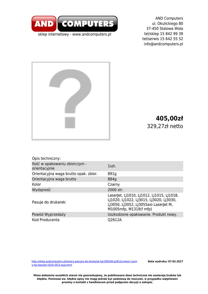 sklep internetowy - www.andcomputers.pl AND Computers ul. Okulickiego 80 37-450 Stalowa Wola tel/sklep 15 842 99 39 tel/serwis 15 642 55 52 [email protected] 405,00zł 329,27zł netto Opis techniczny: Ilość w opakowaniu zbiorczym orientacyjnie Orientacyjna waga brutto opak. zbior. Orientacyjna waga brutto Kolor Wydajność Pasuje do drukarek: Powód Wyprzedaży Kod Producenta 1szt. 891g 884g Czarny 2000 str. LaserJet, LJ1010, LJ1012, LJ1015, LJ1018, LJ1020, LJ1022, LJ3015, LJ3020, LJ3030, LJ3050, LJ3052, LJ3055aio LaserJet M, M1005mfp, M1319(f mfp) Uszkodzone opakowanie. Produkt nowy. Q2612A http://sklep.andcomputers.pl/tonery-pasujce-do-drukarek-hp/190248-q2612a-toner-czarn y-hp-laserjet-1010-1012-wyp.html Data wydruku: 07.03.2017 Mimo dołożenia wszelkich starań nie gwarantujemy, że publikowane dane techniczne nie zawierają braków lub błędów. Ponieważ ew. błędne opisy nie mogą jednak być podstawą do roszczeń, w przypadku wątpliwości prosimy o kontakt z handlowcem przed podjęciem decyzji o zakupie. http://sklep.andcomputers.pl/tonery-pasujce-do-drukarek-hp/190248-q2612a-toner-czarn y-hp-laserjet-1010-1012-wyp.html Data wydruku: 07.03.2017 Mimo dołożenia wszelkich starań nie gwarantujemy, że publikowane dane techniczne nie zawierają braków lub błędów. Ponieważ ew. błędne opisy nie mogą jednak być podstawą do roszczeń, w przypadku wątpliwości prosimy o kontakt z handlowcem przed podjęciem decyzji o zakupie.