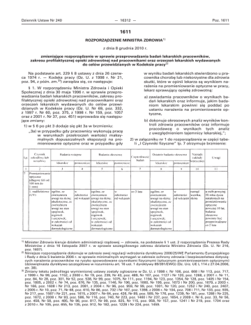 Dziennik Ustaw Nr 240 — 16312 — Poz. 1611 1611 ROZPORZĄDZENIE MINISTRA ZDROWIA1) z dnia 8 grudnia 2010 r. zmieniające rozporządzenie w sprawie przeprowadzania badań lekarskich pracowników, zakresu profilaktycznej opieki zdrowotnej nad pracownikami oraz orzeczeń lekarskich wydawanych do celów przewidzianych w Kodeksie pracy2) Na podstawie art. 229 § 8 ustawy z dnia 26 czerwca 1974 r. — Kodeks pracy (Dz. U. z 1998 r. Nr 21, poz. 94, z późn. zm.3)) zarządza się, co następuje: § 1. W rozporządzeniu Ministra Zdrowia i Opieki Społecznej z dnia 30 maja 1996 r. w sprawie przeprowadzania badań lekarskich pracowników, zakresu profilaktycznej opieki zdrowotnej nad pracownikami oraz orzeczeń lekarskich wydawanych do celów przewidzianych w Kodeksie pracy (Dz. U. Nr 69, poz. 332, z 1997 r. Nr 60, poz. 375, z 1998 r. Nr 159, poz. 1057 oraz z 2001 r. Nr 37, poz. 451) wprowadza się następujące zmiany: 1) w § 6 po pkt 3 dodaje się pkt 3a w brzmieniu: „3a) w przypadku gdy pracownicy wykonują pracę w warunkach przekroczeń wartości maksymalnych dopuszczalnych ekspozycji na promieniowanie optyczne oraz w przypadku gdy 1) w wyniku badań lekarskich stwierdzono u pracownika chorobę lub niekorzystne dla zdrowia skutki, które w opinii lekarza są wynikiem narażenia na promieniowanie optyczne w pracy, lekarz sprawujący opiekę zdrowotną: a) zawiadamia pracowników o wynikach badań lekarskich oraz informuje, jakim badaniom lekarskim powinni się poddać po ustaniu narażenia na promieniowanie optyczne, b) dokonuje okresowych analiz wyników kontroli zdrowia pracowników oraz informuje pracodawcę o wynikach tych analiz z uwzględnieniem tajemnicy lekarskiej,”; 2) w załączniku nr 1 do rozporządzenia w części tabeli „I Czynniki fizyczne” lp. 7 otrzymuje brzmienie: Minister Zdrowia kieruje działem administracji rządowej — zdrowie, na podstawie § 1 ust. 2 rozporządzenia Prezesa Rady Ministrów z dnia 16 listopada 2007 r. w sprawie szczegółowego zakresu działania Ministra Zdrowia (Dz. U. Nr 216, poz. 1607). 2) Niniejsze rozporządzenie dokonuje w zakresie swej regulacji wdrożenia dyrektywy 2006/25/WE Parlamentu Europejskiego i Rady z dnia 5 kwietnia 2006 r. w sprawie minimalnych wymagań w zakresie ochrony zdrowia i bezpieczeństwa dotyczących narażenia pracowników na ryzyko spowodowane czynnikami fizycznymi (sztucznym promieniowaniem optycznym) (dziewiętnasta dyrektywa szczegółowa w rozumieniu art. 16 ust. 1 dyrektywy 89/391/EWG) (Dz. Urz. UE L 114 z 27.04.2006, str. 38). 3) Zmiany tekstu jednolitego wymienionej ustawy zostały ogłoszone w Dz. U. z 1998 r. Nr 106, poz. 668 i Nr 113, poz. 717, z 1999 r. Nr 99, poz. 1152, z 2000 r. Nr 19, poz. 239, Nr 43, poz. 489, Nr 107, poz. 1127 i Nr 120, poz. 1268, z 2001 r. Nr 11, poz. 84, Nr 28, poz. 301, Nr 52, poz. 538, Nr 99, poz. 1075, Nr 111, poz. 1194, Nr 123, poz. 1354, Nr 128, poz. 1405 i Nr 154, poz. 1805, z 2002 r. Nr 74, poz. 676, Nr 135, poz. 1146, Nr 196, poz. 1660, Nr 199, poz. 1673 i Nr 200, poz. 1679, z 2003 r. Nr 166, poz. 1608 i Nr 213, poz. 2081, z 2004 r. Nr 96, poz. 959, Nr 99, poz. 1001, Nr 120, poz. 1252 i Nr 240, poz. 2407, z 2005 r. Nr 10, poz. 71, Nr 68, poz. 610, Nr 86, poz. 732 i Nr 167, poz. 1398, z 2006 r. Nr 104, poz. 708 i 711, Nr 133, poz. 935, Nr 217, poz. 1587 i Nr 221, poz. 1615, z 2007 r. Nr 64, poz. 426, Nr 89, poz. 589, Nr 176, poz. 1239, Nr 181, poz. 1288 i Nr 225, poz. 1672, z 2008 r. Nr 93, poz. 586, Nr 116, poz. 740, Nr 223, poz. 1460 i Nr 237, poz. 1654, z 2009 r. Nr 6, poz. 33, Nr 56, poz. 458, Nr 58, poz. 485, Nr 98, poz. 817, Nr 99, poz. 825, Nr 115, poz. 958, Nr 157, poz. 1241 i Nr 219, poz. 1704 oraz z 2010 r. Nr 105, poz. 655, Nr 135, poz. 912, Nr 182, poz. 1228 i Nr 224, poz. 1459. Dziennik Ustaw Nr 240 — 16313 — Poz. 1611 3) w załączniku nr 1 do rozporządzenia w części tabeli „I Czynniki fizyczne” uchyla się lp. 8, 9 i 11. § 2. Rozporządzenie wchodzi w życie z dniem ogłoszenia. Minister Zdrowia: w z. J. Szulc