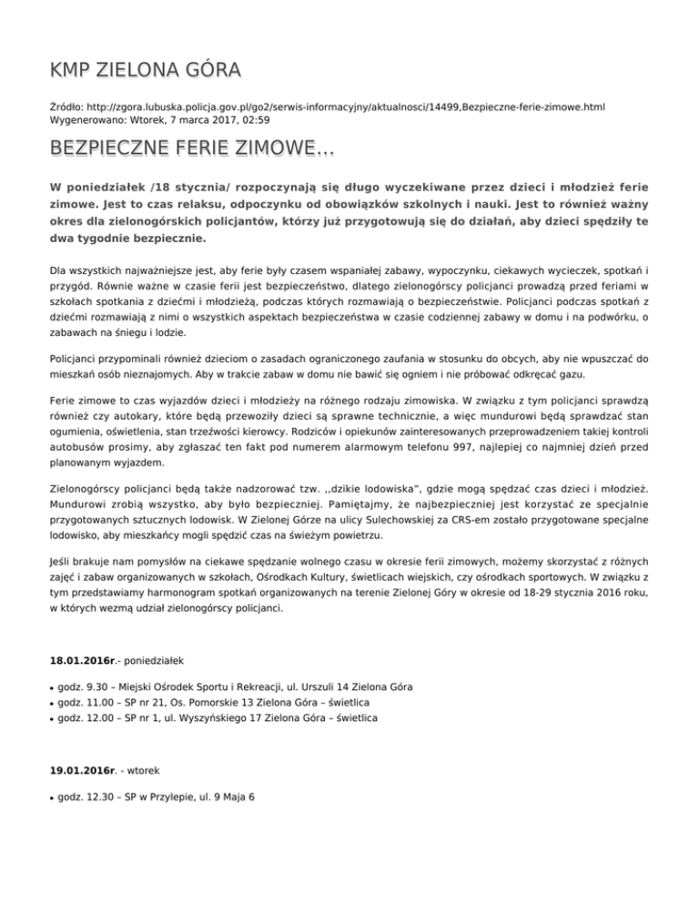 KMP ZIELONA GÓRA Źródło: http://zgora.lubuska.policja.gov.pl/go2/serwis-informacyjny/aktualnosci/14499,Bezpieczne-ferie-zimowe.html Wygenerowano: Wtorek, 7 marca 2017, 02:59 BEZPIECZNE FERIE ZIMOWE… W poniedziałek /18 stycznia/ rozpoczynają się długo wyczekiwane przez dzieci i młodzież ferie zimowe. Jest to czas relaksu, odpoczynku od obowiązków szkolnych i nauki. Jest to również ważny okres dla zielonogórskich policjantów, którzy już przygotowują się do działań, aby dzieci spędziły te dwa tygodnie bezpiecznie. Dla wszystkich najważniejsze jest, aby ferie były czasem wspaniałej zabawy, wypoczynku, ciekawych wycieczek, spotkań i przygód. Równie ważne w czasie ferii jest bezpieczeństwo, dlatego zielonogórscy policjanci prowadzą przed feriami w szkołach spotkania z dziećmi i młodzieżą, podczas których rozmawiają o bezpieczeństwie. Policjanci podczas spotkań z dziećmi rozmawiają z nimi o wszystkich aspektach bezpieczeństwa w czasie codziennej zabawy w domu i na podwórku, o zabawach na śniegu i lodzie. Policjanci przypominali również dzieciom o zasadach ograniczonego zaufania w stosunku do obcych, aby nie wpuszczać do mieszkań osób nieznajomych. Aby w trakcie zabaw w domu nie bawić się ogniem i nie próbować odkręcać gazu. Ferie zimowe to czas wyjazdów dzieci i młodzieży na różnego rodzaju zimowiska. W związku z tym policjanci sprawdzą również czy autokary, które będą przewoziły dzieci są sprawne technicznie, a więc mundurowi będą sprawdzać stan ogumienia, oświetlenia, stan trzeźwości kierowcy. Rodziców i opiekunów zainteresowanych przeprowadzeniem takiej kontroli autobusów prosimy, aby zgłaszać ten fakt pod numerem alarmowym telefonu 997, najlepiej co najmniej dzień przed planowanym wyjazdem. Zielonogórscy policjanci będą także nadzorować tzw. ,,dzikie lodowiska”, gdzie mogą spędzać czas dzieci i młodzież. Mundurowi zrobią wszystko, aby było bezpieczniej. Pamiętajmy, że najbezpieczniej jest korzystać ze specjalnie przygotowanych sztucznych lodowisk. W Zielonej Górze na ulicy Sulechowskiej za CRS-em zostało przygotowane specjalne lodowisko, aby mieszkańcy mogli spędzić czas na świeżym powietrzu. Jeśli brakuje nam pomysłów na ciekawe spędzanie wolnego czasu w okresie ferii zimowych, możemy skorzystać z różnych zajęć i zabaw organizowanych w szkołach, Ośrodkach Kultury, świetlicach wiejskich, czy ośrodkach sportowych. W związku z tym przedstawiamy harmonogram spotkań organizowanych na terenie Zielonej Góry w okresie od 18-29 stycznia 2016 roku, w których wezmą udział zielonogórscy policjanci. 18.01.2016r.- poniedziałek ● godz. 9.30 – Miejski Ośrodek Sportu i Rekreacji, ul. Urszuli 14 Zielona Góra ● godz. 11.00 – SP nr 21, Os. Pomorskie 13 Zielona Góra – świetlica ● godz. 12.00 – SP nr 1, ul. Wyszyńskiego 17 Zielona Góra – świetlica 19.01.2016r. - wtorek ● godz. 12.30 – SP w Przylepie, ul. 9 Maja 6 20.01.2016r.- środa ● godz. 9.00 – SP 22, ul. Słowacka 4 Zielona Góra ● godz. 14.00 – SP 11, ul. Spawaczy 3d Zielona Góra 21.01.2016r. - czwartek ● godz. 9.30 – SP "Salomon", Os. Pomorskie 13 Zielona Góra 22.01.2016r. - piątek ● godz. 10.00 - „Promyk” Ośrodek Rehabilitacji Dzieci i Młodzieży, ul. Głowackiego Zielona Góra 25.01.2016r. - poniedziałek ● godz. 9.30 - Miejski Ośrodek Sportu i Rekreacji, ul. Ursz uli 14 Zielona Góra 27.01.2016r. - środa ● godz. 10.00 - Młodzieżowe Centrum Kultury i Edukacji „Dom Harcerza”, ul. Dzika 6 Zielona Góra 28.01.2016r. - czwartek ● godz. 10.00 - Wojewódzki Ośrodek Sportu i Rekreacji w Drzonkowie, ul. Olimpijska 20 Ocena: 0/5 (0) Tweetnij