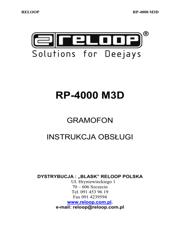 RELOOP RP-4000 M3D RP-4000 M3D GRAMOFON INSTRUKCJA OBSŁUGI DYSTRYBUCJA : „BLASK” RELOOP POLSKA Ul. Hryniewieckiego 1 70 – 606 Szczecin Tel. 091 453 96 19 Fax 091 4239594 www.reloop.com.pl. e-mail: [email protected] RELOOP RP-4000 M3D Gratulacje !!! Nabyłeś gramofon Reloop RP-4000 MK3. Dziękujemy Tobie za zaufanie naszym sprzętem dla DJ’ów. Przed uŜyciem prosimy Ciebie o uwaŜne przestudiowanie poniŜszej instrukcji. Proszę wyjąć Reloop RP-4000 MK3 z opakowania. Sprawdź przed pierwszym uŜyciem, aby się upewnić, Ŝe urządzenie nie zostało uszkodzone podczas transportu, jeśli wykryjesz jakieś uszkodzenia kabla zasilającego lub obudowy nie uŜywaj tego urządzenia. Skontaktuj się ze sprzedawcą. Instrukcje bezpieczeństwa UWAGA! Proszę zachowaj szczególną ostroŜność podczas pracy z napięciem 230 V. Takie napięcie moŜe prowadzić do powaŜnego poraŜenia prądem. Jakiekolwiek uszkodzenia spowodowane poprzez nieostroŜne i niepoprawne uŜycie nie podlega gwarancji. Producent nie jest odpowiedzialny za jakiekolwiek uszkodzenia własności lub szkody osobowe spowodowane przez niewłaściwe uŜycie lub niedotrzymanie zasad bezpieczeństwa. - To urządzenie opuściło fabrykę w idealnym stanie. Aby utrzymać ten stan oraz aby nie było jakiegokolwiek zagroŜenia uŜytkownik musi przestrzegać instrukcji bezpieczeństwa oraz ostrzeŜeń zawartych w tej instrukcji. - Z powodów bezpieczeństwa oraz certyfikacji (CE) nieautoryzowane przerabianie lub/i modyfikacja tego urządzenia jest zabroniona. - Zawartość tego urządzenia nie zawiera Ŝadnych części, które wymagają konserwacji za wyjątkiem zewnętrznych części, które moŜna wymienić z zewnętrz. Wyspecjalizowane osoby mogą prowadzić konserwacje w przeciwnym razie gwarancja nie zostanie uznana. - Upewnij się, Ŝe zasilanie będzie podłączone tylko wtedy, gdy urządzenie będzie przygotowane do pracy. Zawsze podłączaj główny kabel zasilający jako ostatni. Upewnij się, Ŝe główny włącznik jest w pozycji „OFF” gdy podłączasz urządzenie do sieci. - UŜywaj tylko takich kabli, które uwzględnione są w zaleceniach. Sprawdź czy wszystkie połączenia typu „Jack” i inne wtyki są dociśnięte i poprawnie podpięte. Zgłoś się do sprzedawcy jeśli masz jakiś wątpliwości. - Upewnij się podczas uruchamiania urządzenia, Ŝe główny kabel nie jest zgnieciony lub uszkodzony ostrym narzędziem, - Unikaj kontaktu głównego przewodu z innymi kablami. Obchodź się z naleŜytą ostroŜnością podczas operowania kablami i stykami. Nigdy nie dotykaj tych części mokrymi rękoma, - Upewnij się Ŝe przełącznik -3- jest ustawiony w odpowiedniej pozycji zgodnie z odpowiednim napięciem w danym kraju (230 V, 50 Hz lub 115 V, 60 Hz, przy FRG: 230 V, 50 Hz). Producent nie jest odpowiedzialny za szkody powstałe w wyniku niewłaściwego ustawienia napięcia. W takim wypadku gwarancja nie będzie uznana. - Podłączaj kabel zasilający wyłącznie do odpowiednich gniazd zabezpieczonych przed przepięciem. Jedynymi gniazdami zasilania są punkty zgodne ze specyfikacją publicznej sieci. - Odłącz urządzenie z sieci, kiedy nie jest uŜywane oraz przed czyszczeniem! Trzymaj przewód za wtyczkę. Nigdy nie ciągnij za główny przewód. - Ustaw urządzenie w pozycji poziomej i stabilnej, na niepalnym podłoŜu. Gdy następuje sprzęŜenie zwrotne ustaw pole działania twoich głośników z dala od urządzenia. - Unikaj wstrząsów oraz mocnych uderzeń podczas instalacji i uŜytkowania sprzętu. - Podczas wyboru miejsca instalacji urządzenia, upewnij się, Ŝe urządzenie nie będzie poddawane działaniu wysokiego ciepła, wilgotności oraz zanieczyszczeń. Upewnij się, Ŝe Ŝaden kabel nie leŜy dookoła urządzenia. Narazisz swoje bezpieczeństwo oraz innych!! - Nie kładź Ŝadnych pojemników wypełnionych cieczą, która mogłaby się łatwo rozlać na urządzenie lub w jego najbliŜszym sąsiedztwie. Jeśli jednakŜe płyny dostaną się do środka urządzenia, natychmiast odłącz główny przewód zasilający. Sprzęt musi zostać sprawdzony przez wykwalifikowany personel serwisowy przed kolejnym uŜyciem. Szkody powstałe z tytułu dostania się płynów do urządzenia nie są objęte gwarancją. - Nie uŜywaj urządzenia podczas wysokich temperatur (jeśli przekracza 35◦C) oraz niskich temperatur (poniŜej 5◦C). Nie wystawiaj urządzenia na bezpośrednie działanie promieni słonecznych oraz źródeł ciepła jak np.: radiatory, piekarniki itp. (nawet podczas transportu w zamkniętym pojeździe). Nigdy nie zakrywaj wiatraków chłodzących lub szczelin wentylacyjnych. Zawsze zapewniaj odpowiednią wentylacje. - Urządzenie nie moŜe być uŜywane zaraz po zmianie środowiska np.: z zimnego na ciepłe. Skroplenia mogą spowodować uszkodzenie urządzenia. Nie włączaj ani nie uŜywaj urządzenia dopóki nie osiągnie temperatury otoczenia. - Przełączniki oraz suwaki nie powinny być traktowane sprayami czyszczącymi ani smarami. Urządzenie naleŜy czyścić tylko wilgotną ściereczką. Nigdy nie uŜywaj rozpuszczalników ani płynów czyszczących na bazie benzyny do czyszczenia. - Podczas przenoszenia urządzenia powinno ono znajdować się w swoim oryginalnym opakowaniu. - Podczas uruchamiania urządzenia Crossfadery oraz poziomy głośności twojego wzmacniacza powinny być ustawione na minimum. Ustaw swoje głośniki w pozycji „OFF”. Poczekaj od 8 do 10 sekund przed zwiększeniem głośności, aby uniknąć strzałów w głośniku, które mogą doprowadzić do uszkodzenia głośników oraz zwrotnicy. - Zawsze upewniaj się Ŝe miejsce w którym uŜywasz urządzenia nie spowoduje niechcianych zadrapań ani nie ubrudzi płyt kompaktowych. Kiedy wkładasz płytę do odtwarzacza naleŜy mieć czyste ręce. - Aby utrzymać głowice lasera zawsze zamykaj tackę odtwarzacza. - Urządzenie zasilane prądem nie powinno być uŜywane przez dzieci. Zachowaj szczególną o