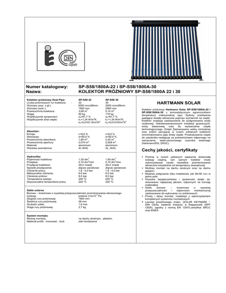 Numer katalogowy: Nazwa: Kolektor próŜniowy Heat Pipe: Liczba próŜniowych rur kolektora Wymiary (wys. x gł.): Wymiary (szer.): Powierzchnia kolektora: Waga: Współczynnik sprawności: Współczynnik strat ciepła: SP-S58/1800A-22 i SP-S58/1800A-30 KOLEKTOR PRÓśNIOWY SP-S58/1800A 22 i 30 SP-S58 22 22 2000 mmx58mm 1920 mm 2 3,68 m 82 kg η0=61,7 % 2 k1=1,34 W/m K k2=0,0101 W/m2K2 SP-S58 30 30 2000 mmx58mm 2560 mm 2 5,10 m 110 kg η0=61,7 % 2 k1=1,34 W/m K k2=0,0101W/m2K2 Absorber: Emisja: Absorpcja: Powierzchnia absorbera: Powierzchnia apertury: Materiał: Warstwa zewnętrzna: ε=8,0 % α=92,0 % 1,80 m2 2,074 m2 aluminium Al.-N/AL ε=8,0 % α=92,0 % 2,45 m2 2,828 m2 aluminium AL.-N/AL Hydraulika Pojemność kolektora: Przepływ: Przyłącze kolektora: Sposób przyłączenia: Ciśnienie pracy: Maksymalne ciśnienie: Ciśnienie próbne: Temperatura zastoju: Dopuszczalna temperatura pracy 1,30 dm3 3 0,10 dm /min 22x1 miedź złącze zaciskowe 1,8 - 5,0 bar 6,0 bar 8,0 bar 245 oC 220 oC 1,90 dm3 0,10 dm3/min 22x1 miedź złącze zaciskowe 1,8 - 5,0 bar 6,0 bar 8,0 bar 245 oC 220 oC : Szkło solarne Borowo – krzemowe o wysokiej przepuszczalności promieniowania słonecznego Izolacja: próŜnia 3,5x10-3 Pa Długość rury próŜniowej: 1800 mm Średnica rury próŜniowej: 58 mm Grubość szkła: 1,6 mm Waga rury próŜniowej: 2,7 kg System montaŜu Rodzaj montaŜu Materiał profili, mocowań, śrub na dachu skośnym, płaskim, stal nierdzewna HARTMANN SOLAR Kolektor próŜniowy Hartmann Solar SP-S58/1800A-22 i SP-S58/1800A-30 z termostatycznym ogranicznikiem temperatury maksymalnej typu Sydney przetwarza padające światło słoneczne poprzez wymiennik na ciepło. Kolektor znajduje zastosowanie do podgrzewania wody uŜytkowej, niskotemperaturowych instalacji grzewczych, wody basenowej oraz do wytwarzania ciepła technologicznego. Dzięki Zastosowaniu wełny mineralnej oraz próŜni panującej w rurach szklanych kolektora zminimalizowano jego straty ciepła. Przekazywanie ciepła do zasobnika następuje za pośrednictwem odpornego na zamarzanie, wielo-sezonowego czynnika solarnego (HartmannSOL 250°C). Cechy jakości, certyfikaty PróŜnia w rurach szklanych zapewnia doskonałą izolację cieplną, tym samym kolektor moŜe wykorzystywać nawet niewielkie promieniowanie słoneczne niezaleŜnie od temperatury zewnętrznej. MoŜliwy montaŜ na dachu skośnym oraz na dachu płaskim. MoŜliwe połączenie kilku kolektorów (do 80-90 rur) w jedno pole. Wysokie bezpieczeństwo i sprawność dzięki zastosowaniu najlepszej jakości, odpornych na korozję materiałów. Szkło borowo – krzemowe o wysokiej przepuszczalności i odporności mechanicznej zastosowane do wykonania rur próŜniowych. Prosty i łatwy montaŜ, instalacja z wykorzystaniem kompletnych systemów montaŜowych. Laureat prestiŜowego znaku „SOLAR KEYMARK ”, DIN CErto, badania Instytutu w Rapperswill (SPF C829), zgodny z normą EN 12975,certyfikat SRCC oraz ENEA.