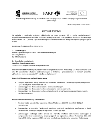 Projekt współfinansowany ze środków Unii Europejskiej w ramach Europejskiego Funduszu Społecznego Warszawa; dnia 27-12-2011 r. ZAPYTANIE OFERTOWE W związku z realizacją projektu „@kademia na rzecz rozwoju ICT – studia podyplomowe”, współfinansowanego ze środków Unii Europejskiej w ramach Europejskiego Funduszu Społecznego Poddziałanie 2.1.1 „Rozwój kapitału ludzkiego w przedsiębiorstwach” Programu Operacyjnego Kapitał Ludzki zwracamy się z zapytaniem ofertowym: 1. Zamawiający Polsko-Japońska Wyższa Szkoła Technik Komputerowych ul. Koszykowa 86 02-008 Warszawa 2. Przedmiot zamówienia Wspólny słownik zamówień: 72260000-5 Usługi w zakresie oprogramowania Przedmiotem zamówienia jest przeprowadzenie egzaminu Adobe Photoshop CS5 ACE Exam 9A0-150 dla 29 uczestników studiów podyplomowych w Bytomiu prowadzonych w ramach projektu „@kademia na rzecz rozwoju ICT – studia podyplomowe” Kryteria jakie powinny spełniać Wykonawcy : Miejsce wykonania usługi powinno być oddalone od siedziby Zamawiającego Aleja Legionów 2; 41-902 Bytom maksymalnie 9 km. Zamawiający nie dopuszcza składania ofert wariantowych. Zamawiający nie dopuszcza możliwości składania ofert częściowych. Zamawiający nie dopuszcza możliwości powierzenia przez Wykonawcę części zamówienia podwykonawcom. Pozostałe warunki realizacji zamówienia: Podana liczba uczestników egzaminu Adobe Photoshop CS5 ACE Exam 9A0-150 jest szacunkowa. Zamawiający w terminie 7 dni przed terminem realizacji zamówienia poinformuje o ilości uczestników, którzy przystąpią do egzaminu certyfikującego Zamawiający zastrzega sobie prawo do wzrostu wartości zamówienia wynikający z zwiększenia ilości uczestników przystępujących do egzaminu Adobe Photoshop CS5 ACE Exam 9A0-150 w wysokości 50% wartości zamówienia określonej w umowie z Wykonawcą Projekt współfinansowany ze środków Unii Europejskiej w ramach Europejskiego Funduszu Społecznego 3. Terminy realizacji zamówienia: od 19 stycznia 2012 r do 15 marca 2012 roku 4. Kryterium oceny ofert: Kryterium wyboru oferty stanowi najniższa cena. 5. Opis sposobu przygotowania oferty Oferent powinien sporządzić ofertę w języku polskim na formularzu ofertowym załączonym do niniejszego zapytania. Oferta musi zawierać: pełną nazwę oferenta adres lub siedzibę oferenta, numer telefonu oraz numer NIP cena musi być podana w PLN cyfrowo i słownie oraz być wartością brutto. złożona oferta musi uwzględniać wszystkie zobowiązania, obejmować wszystkie koszty i składniki związane z wykonaniem zamówienia. Cena ta będzie obowiązującą przez cały okres ważności oferty. sporządzona na załączonym formularzu wraz z podpisanym oświadczeniem (Załącznik 1 i 2) oferta musi być podpisana przez osobę lub osoby uprawnione do reprezentowania oferenta termin związania ofertą 30 dni od terminu składania ofert W przypadku składnia oferty w siedzibie Zamawiającego lub pocztą na kopercie należy umieścić napis: „Oferta na przeprowadzenie egzaminu Adobe Photoshop CS5 ACE Exam 9A0-150 – Bytom na potrzeby realizacji projektu „@kademia na rzecz rozwoju ICT – studia podyplomowe” dla PolskoJapońskiej Wyższej Szkoły Technik Komputerowych”. Ofertę można złożyć osobiście u Zamawiającego, pocztą na adres Zamawiającego, faksem nr 022 58 44 502 lub mail’owo na adres [email protected]. W przypadku braku zainteresowania z Państwa strony ofertą, uprzejmie prosimy o potwierdzenie rezygnacji udziału w zapytaniu ofertowym faksem, mailem, listownie bądź osobiście. Kontakt: Polsko-Japońska Wyższa Szkoła Technik Komputerowych Komórka ds Projektów pokój 312 ul. Koszykowa 86 02-008 Warszawa e-mail: [email protected]; tel. 22 5844536 6. W postępowaniu mogą wziąć udział Oferenci, którzy: • Posiadają uprawnienia do wykonywania określonej działalności lub czynności, jeżeli ustawy nakładają obowiązek posiadania takich uprawnień; Projekt współfinansowany ze środków Unii Europejskiej w ramach Europejskiego Funduszu Społecznego • Posiadają niezbędną wiedzę i doświadczenie oraz dysponują potencjałem technicznym i osobami zdolnymi do wykonania zamówienia • Znajdują się w sytuacji ekonomicznej i finansowej zapewniającej wykonanie zamówienia • Nie otwarto wobec nich likwidacji ani nie ogłoszono upadłości • Nie zalęgają z uiszczeniem podatków, opłat lub składek na ubezpieczenia społeczne lub zdrowotne • Nie zostali prawomocnie skazani za przestępstwo popełnione w związku z postępowaniem o udzielenie zamówienia, przestępstwo przekupstwa, przestępstwo przeciwko obrotowi gospodarczemu lub inne przestępstwo popełnione w celu osiągnięcia korzyści majątkowych • W przypadku których, wspólnik spółki jawnej, partner lub członek zarządu spółki partnerskiej; komplementariusz spółki komandytowej oraz spółki komandytowo-akcyjnej; członek organu zarządzającego osoby prawnej nie został prawomocnie skazany za przestępstwo popełnione w związku z postępowaniem o udzielenie zamówienia, przestępstwo przekupstwa, przestępstwo przeciwko obrotowi gospodarczemu lub inne przestępstwo popełnione w celu osiągnięcia korzyści majątkowych • Wobec których, sąd nie orzekł zakazu ubiegania się o zamówienia, na podstawie przepisów o odpowiedzialności podmiotów zbiorowych za czyny zabronione pod groźba kary Dokumentem potwierdzającym spełnienie powyższych warunków jest „Oświadczenie” (zał. 1 do zapytania ofertowego) 7. Termin złożenia oferty Ofertę złożyć należy do dnia 11 stycznia 2012 r. do godz. 16.00 – decyduje data dostarczenia oferty do Zamawiającego. 8. Informacje o formalnościach po wyborze oferty w celu realizacji dostawy Wykonawca, którego oferta zostanie wybrana zostanie niezwłocznie powiadomiony przez Zamawiającego. Osoba uprawniona do kontaktu z wykonawcami – mgr Rafał Muniak mail. [email protected] tel 22