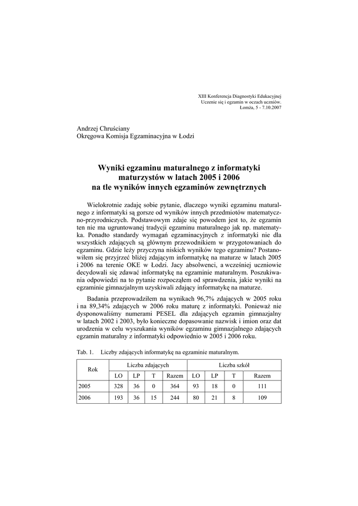XIII Konferencja Diagnostyki Edukacyjnej Uczenie się i egzamin w oczach uczniów. Łomża, 5 - 7.10.2007 Andrzej Chruściany Okręgowa Komisja Egzaminacyjna w Łodzi Wyniki egzaminu maturalnego z informatyki maturzystów w latach 2005 i 2006 na tle wyników innych egzaminów zewnętrznych Wielokrotnie zadaję sobie pytanie, dlaczego wyniki egzaminu maturalnego z informatyki są gorsze od wyników innych przedmiotów matematyczno-przyrodniczych. Podstawowym zdaje się powodem jest to, że egzamin ten nie ma ugruntowanej tradycji egzaminu maturalnego jak np. matematyka. Ponadto standardy wymagań egzaminacyjnych z informatyki nie dla wszystkich zdających są głównym przewodnikiem w przygotowaniach do egzaminu. Gdzie leży przyczyna niskich wyników tego egzaminu? Postanowiłem się przyjrzeć bliżej zdającym informatykę na maturze w latach 2005 i 2006 na terenie OKE w Łodzi. Jacy absolwenci, a wcześniej uczniowie decydowali się zdawać informatykę na egzaminie maturalnym. Poszukiwania odpowiedzi na to pytanie rozpocząłem od sprawdzenia, jakie wyniki na egzaminie gimnazjalnym uzyskiwali zdający informatykę na maturze. Badania przeprowadziłem na wynikach 96,7% zdających w 2005 roku i na 89,34% zdających w 2006 roku maturę z informatyki. Ponieważ nie dysponowaliśmy numerami PESEL dla zdających egzamin gimnazjalny w latach 2002 i 2003, było konieczne dopasowanie nazwisk i imion oraz dat urodzenia w celu wyszukania wyników egzaminu gimnazjalnego zdających egzamin maturalny z informatyki odpowiednio w 2005 i 2006 roku. Tab. 1. Rok Liczby zdających informatykę na egzaminie maturalnym. Liczba zdających Liczba szkół LO LP T Razem LO LP T Razem 2005 328 36 0 364 93 18 0 111 2006 193 36 15 244 80 21 8 109 Liczby zdających informatykę w latach 2005 i 2006 na terenie OKE w Łodzi oraz liczby szkół z jakich pochodzili przedstawia tabela 1. Jak widać z przytoczonych danych liczba zdających dość wyraźnie spadła w 2006 roku, gdy zdający, a po części i nauczyciele, zapoznali się z formułą egzaminu. Liczba absolwentów liceów profilowanych zdających informatykę nieznacznie maleje. Zapewne będzie rosła liczba absolwentów techników zainteresowanych egzaminem z informatyki. Maturzyści obu roczników osiągnęli podobne wyniki na egzaminie gimnazjalnym. Dane statystyczne wyników z egzaminu gimnazjalnego i części matematycznoprzyrodniczej tego egzaminu zdających informatykę na maturze przedstawia tabela 2. Tab. 2. Parametry statystyczne wyników egzaminu gimnazjalnego maturzystów egzaminu z informatyki w roku 2005 i 2006 . Parametr statystyczny wyniki w 2002 r. wyniki w 2003 r. Egz. gim. GMP Egz. gim. GMP średni wynik 73,49 37,45 75 37,89 odchylenie standardowe 10,87 6,52 11,99 8,22 min. wynik 41 19 41 13 maks. wynik 96 50 96 50 rozstęp 55 31 55 37 liczba analizowanych wyników 352 352 218 218 Na poniższych wykresach współrzędne punktu przedstawiają wyniki egzaminu gimnazjalnego (egzaminu gimnazjalnego w części matematycznoprzyrodniczej) - oś odciętych oraz wyniki egzaminu z informatyki - oś rzędnych - dla każdego z maturzystów przystępujących do tego egzaminu odpowiednio w 2005 i 2006 roku. Wyniki zarówno egzaminu gimnazjalnego jako całości jak i części matematyczno-przyrodniczej wykazują większą dyspersję w 2003 roku. Na wykresach naniosłem narzędziami Excela linie trendu przechodzącą przez punkt (0,0). Współczynnik kierunkowy linii trendu stanowi statystyczną prognozę dla danego rocznika maturzystów wyniku z informatyki w odniesieniu do wyniku egzaminu gimnazjalnego. 100 90 Wyniki egzaminu z informatyki w 2005 r. 80 70 60 50 40 30 20 y = 0,3852x 10 0 0 10 20 30 40 50 60 70 80 90 100 Wyniki egzaminu gimnazjalnego w 2002 r. Rys. 1. Wyniki egzaminu z informatyki w zależności od wyników egzaminu gimnazjalnego maturzystów w 2005 roku 100 90 Wynik z informatyki 2005 80 70 60 50 40 30 20 y = 0,3774x 10 0 0 10 20 30 40 50 60 70 80 90 100 Wynik egzaminu gimnazjalnego w części mat.-przyr. 2002 w % Rys. 2. Wyniki egzaminu z informatyki w zależności od wyników na egzaminie gimnazjalnym w części matematyczno-przyrodniczej zdających maturę w 2005 roku. Maturzyści 2005 roku na egzaminie gimnazjalnym łącznie nie osiągali maksymalnych wyników, ale w części matematyczno-przyrodniczej dwóch z nich uzyskało 50 punktów. Wyniki z informatyki 2006 100 90 80 70 60 50 40 30 20 10 0 y = 0,3079x 0 10 20 30 40 50 60 70 80 90 100 Wyniki egzaminu gimnazjalnego 2003 Rys. 3. Wyniki egzaminu z informatyki maturzystów 2006 roku w zależności od ich wyników egzaminu gimnazjalnego. 100 Wyniki informatyki 2006 w% 90 80 70 60 50 y = 0,3025x 40 30 20 10 0 0 10 20 30 40 50 60 70 80 90 100 Wyniki egzaminu gimnazjalnego część mat.-przyr. 2003 w % Rys. 4. Wyniki egzaminu z informatyki maturzystów w 2006 roku w zależności od ich wyników na egzaminie gimnazjalnym w części matematycznoprzyrodniczej. Maturzyści 2006 roku zdający informatykę również nie uzyskali maksymalnego wyniku z egzaminu gimnazjalnego, lecz w części matematycznoprzyrodniczej dziewięciu z nich osiągnęło 50 punktów. Wyniki matematyki poz. podst. 2006 Analizując rozkład wyników dla maturzystów rocznika 2006 r., zaobserwować można również, że wyniki z informatyki powyżej 40% osiągali jedynie ci, którzy uzyskali na egzaminie gimnazjalnym co najmniej 78 punktów (w części matematyczno-przyrodniczej od 84%, czyli od 42 punktów). Ta granica była niższa dla maturzystów 2005 roku. 100 80 y = 0,4407x 60 40 20 0 0 20 40 60 80 100 Wyniki egzaminu gimnazjalnego 2003 Rys. 5. Wyniki egzaminu z matematyki poziom podst. maturzystów w 2006 roku w zależności od ich wyników na egzaminie gimnazjalnym Biorąc współczynnik kierunkowy linii trendu powyższego wykresu i wykresu na rys. 3., można powiedzieć, iż ten sam wynik na egzaminie gimnazjalny statystycznie prognozuje wyższy wynik o powyżej 10% z egzaminu maturalnego z matematyki na pozio