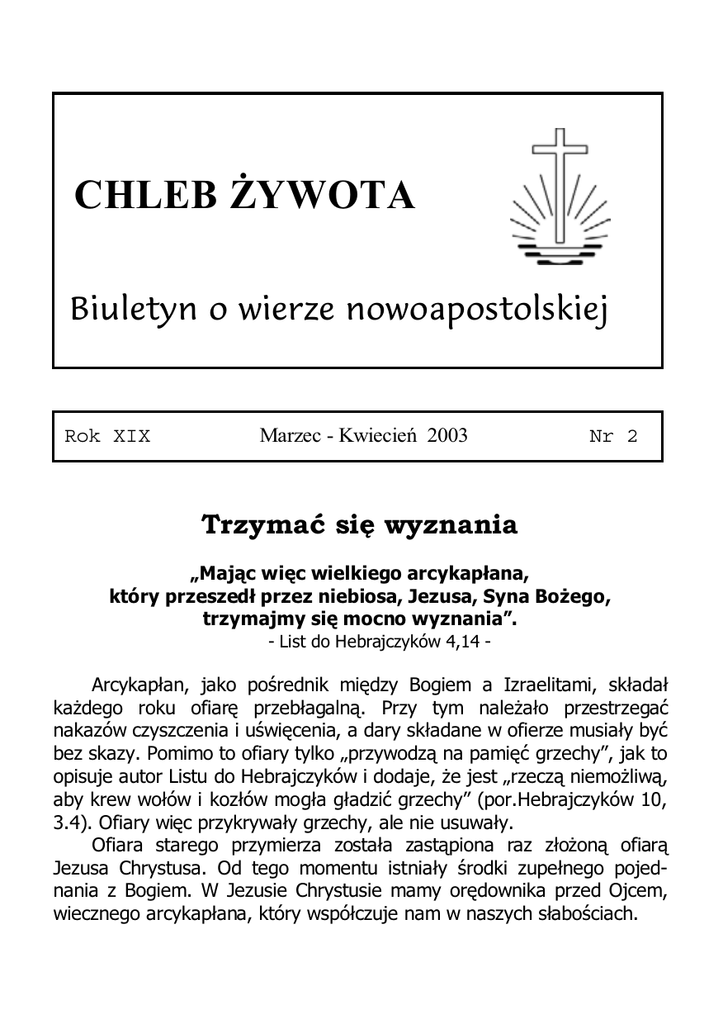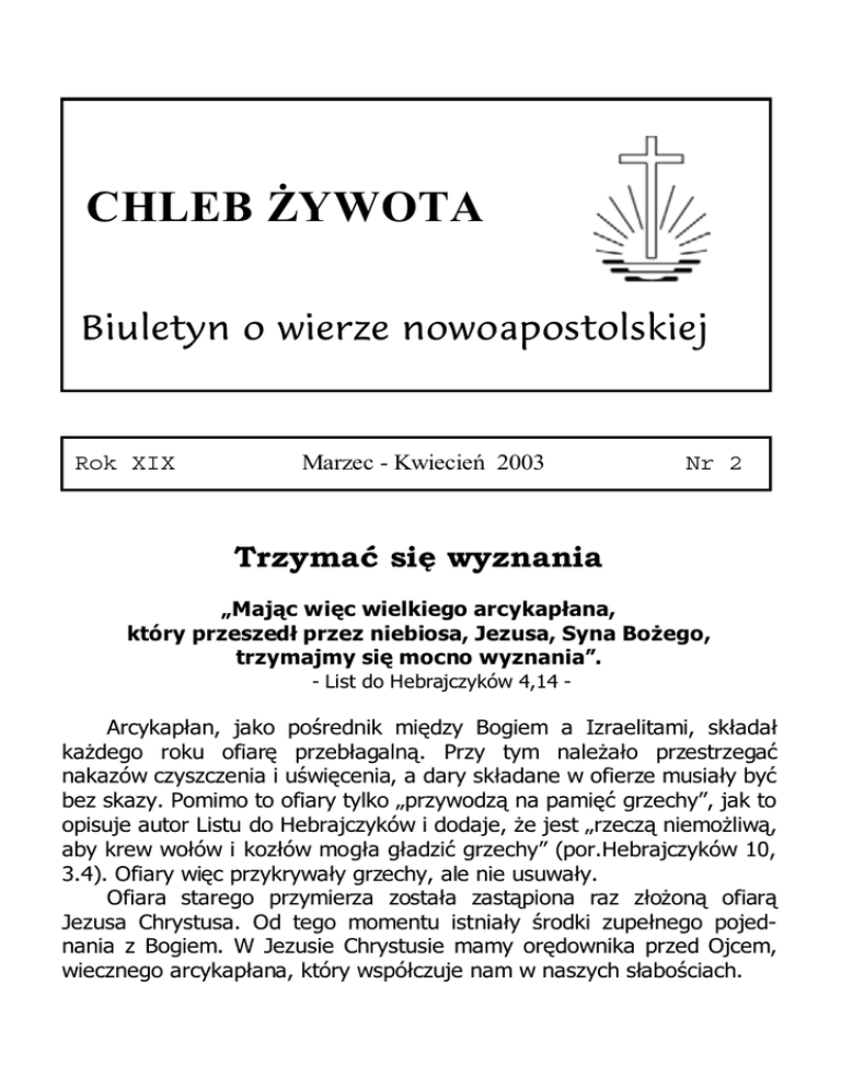 CHLEB ŻYWOTA Biuletyn o wierze nowoapostolskiej Rok XIX Marzec - Kwiecień 2003 Nr 2 Trzymać się wyznania „Mając więc wielkiego arcykapłana, który przeszedł przez niebiosa, Jezusa, Syna Bożego, trzymajmy się mocno wyznania”. - List do Hebrajczyków 4,14 - Arcykapłan, jako pośrednik między Bogiem a Izraelitami, składał każdego roku ofiarę przebłagalną. Przy tym należało przestrzegać nakazów czyszczenia i uświęcenia, a dary składane w ofierze musiały być bez skazy. Pomimo to ofiary tylko „przywodzą na pamięć grzechy”, jak to opisuje autor Listu do Hebrajczyków i dodaje, że jest „rzeczą niemożliwą, aby krew wołów i kozłów mogła gładzić grzechy” (por.Hebrajczyków 10, 3.4). Ofiary więc przykrywały grzechy, ale nie usuwały. Ofiara starego przymierza została zastąpiona raz złożoną ofiarą Jezusa Chrystusa. Od tego momentu istniały środki zupełnego pojednania z Bogiem. W Jezusie Chrystusie mamy orędownika przed Ojcem, wiecznego arcykapłana, który współczuje nam w naszych słabościach. O tym Sprawiedliwym świadczy Szczepan, mąż pełen wiary i Ducha Świętego. On nawet „ujrzał chwałę Bożą i Jezusa stojącego po prawicy Boga” (Dzieje Ap. 7,55). Jako dzieci Boże, pełne Ducha Świętego, chciejmy również trzymać się wyznania, a mianowicie ewangelii Syna Bożego, „który przeszedł przez niebiosa” (Hebrajczyków 4,14), idąc do swego Ojca. Ten, któremu dana jest wszelka moc na niebie i na ziemi, „wstąpił wysoko ponad wszystkie niebiosa” (por.Efezjan 4,10). Stąd przyjdzie ponownie, aby zabrać swoich do siebie. Nasza wytrwałość w trzymaniu się wyznania, dla której inni mają mało zrozumienia, niech będzie dowodem naszej szczerości, która się okazuje w tym, że • przyjmujemy posłańców Chrystusa, żyjących apostołów (por. Ew.Jana 20,21). Tym samym przyjmujemy Syna oraz też Ojca, który Jego posłał. Tak więc ten, który się trzyma wyznania, mieszka w Bogu, a Bóg w nim, • ustawicznie szukamy łaski, a tym samym bliskości Bożej i pragniemy przystąpić z ufną odwagą do tronu łaski, aby dostąpić miłosierdzia (por.Hebrajczyków 4,16). Doświadczając bowiem miłości, dobroci i miłosierdzia Bożego i Jego Syna, jesteśmy w stanie cierpliwie znieść niedoskonałości innych, • słuchamy rady: „Czuwajcie i módlcie się!” (por.Ew.Mateusza 26,41). Jeżeli pewność bliskiego ponownego przyjścia Chrystusa cechuje nasze postępowanie, unikamy pospolitej pustej mowy i wszelkiego niedobrego pozoru. Natomiast staramy się o to, co w górze, gdzie Chrystus siedzi po prawicy Bożej. Wejrzeć na Jezusa „A Jezus zaraz wyciągnął rękę, uchwycił go i rzekł mu: O małowierny, czemu zwątpiłeś?”. - Ew.Mateusza 14,31 - Pismo Święte donosi, że Piotr i pozostali uczniowie płynęli łodzią. Czytamy, że „łódź miotana przez fale oddaliła się już od brzegu o wiele stadiów; wiatr bowiem był przeciwny” (Ew.Mateusza 14,24). Nader dobrze można rozumieć, że człowiek, znajdujący się w takiej sytuacji, niepokoi się o swoje życie i bezpieczeństwo. Tak też uczniowie mieli 2 obawy. Wtedy jednak zdarzyło się coś nadzwyczajnego: Jezus przyszedł do nich, idąc po morzu. Widząc to, oczywiście przestraszyli się. Z daleka nie poznali swojego Mistrza i myśleli, że to jakaś zjawa. Jezus zauważył, że się bali, i pocieszył ich słowami: „Ufajcie, Ja jestem, nie bójcie się!” (Ew.Mateusza 14,27). Na to rzekł Piotr: „Panie, jeśli to Ty jesteś, każ mi przyjść do siebie po wodzie!” Z tych słów poznajemy najpierw wielką ufność Piotra, z jaką zwrócił się do Pana. Jezus kazał mu przyjść. W ten sposób Piotr miał praktycznie udowodnić swoją ufność. Uczeń Jezusa opuścił łódź i szedł po wodzie na spotkanie z Mistrzem. Wtem spostrzegł porywisty wiatr, zląkł się i zaczął tonąć. Ogarnęła go wielka panika, tak że zawołał: „Panie, ratuj mnie!” (Ew.Mateusza 14,30). Jezus wyciągnął rękę i uratował Piotra. Także i my znajdujemy się czasem na morzu, to znaczy, przechodzimy zmienne koleje życia. Na początku wykazujemy ufność, a potem boimy się, gdy musimy walczyć z falami trosk i smutku. Ponadto ostre wiatry potęgują strach w naszej duszy. Pan wciąż na nowo mówi do nas: „Przyjdź do Mnie!” Przyjmowanie tego zaproszenia jest tylko pierwszym krokiem. Ważne jest też zważać na to, co następuje potem. Nieodzowne jest pełne ufności wejrzenie na Jezusa. W tym musimy też trwać, kiedy należy zdobyć się na czyn i wypełniać słowo i wolę Pana. Również wśród wysokich fal i ostrych wiatrów chciejmy wejrzeć na Pana, chwycić się Jego ręki wyciągniętej w apostolacie oraz w służbie słowa i sakramentu. Oto w tym nasz ratunek! Pan jest naszym zbawieniem! Dział duszpasterski dla dzieci Biskupi piszą do dzieci: W ramach cyklu listów biskupów tym razem zapoznamy się z tym, co pisze biskup Thomas Matthes z Saksonii-Turyngii/Niemcy. Szczególne zadania... Miłe Dzieci! Mały Franciszek cieszy się z nadchodzącej niedzieli, w której to apostoł chce odwiedzić jego zbór. Zawsze jest to szczególne wydarzenie. 3 W ostatnim nabożeństwie, poprzedzającym wizytę apostoła, przewodniczący zboru powiedział, żeby wszyscy bracia i siostry modlili się, aby apostoł mógł przyjechać, bo dopiero co powrócił z długiej i wyczerpującej podróży. Franek się zastanawia: „Tak naprawdę, co jest takiego szczególnego w nabożeństwie apostoła?” Pyta się więc mamę, która mu wyjaśnia, że apostoł będzie pieczętował małą Anię, którą przewodniczący zboru przed trzema tygodniami ochrzcił. Także pan Darek, który od dłuższego czasu bierze udział w nabożeństwach, chce zostać dzieckiem Bożym. „Pieczętować Duchem Świętym może tylko apostoł” - mówi mama. Chłopiec nie pamięta i nie może sobie przypomnieć, kiedy ostatnio apostoł przeprowadzał takie świ
