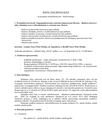 OPIS TECHNICZNY do projektu architektoniczno - budowlanego 1. Przedmiot inwestycji: Zagospodarowanie centrum miejscowości Brzoza – Budowa skweru i ulicy Szkolnej wraz z odwodnieniem w centrum msc. Brzoza - budowa jezdni kostki betonowej typu polbruk - budowa chodnika, skweru z kostki betonowej typu polbruk - budowa zjazdów na posesję z kostki betonowej typu polbruk - budowa nawierzchni utwardzonych z kostki betonowej typu polbruk - budowa projektowanej kan. deszczowej podłączonej do istniejącej sprawnej sieci kan. deszczowej - rekultywacja zieleni Inwestor : Gmina Nowa Wieś Wielka, ul. Ogrodowa 2, 86-060 Nowa Wieś Wielka Jednostka projektowa ; Zakład Usług „DAN” spółka z o.o., ul. Kopernika 4c/22, 14-200 Iława 2. Podstawa opracowania. - podkłady geodezyjne – mapa sytuacyjno wysokościowa w skali 1:500, pomiary uzupełniające w terenie, Rozporządzenie MTiGM Dz. U 43/99 poz. 430/199 z dnia 02.03.1999r. w sprawie warunków technicznych, jakim powinny odpowiadać drogi publiczne i ich usytuowanie, założenia projektowania dróg. uzgodnienia z inwestorem, właścicielami sieci 3. Stan istniejący. Istniejąca ulica zaliczana jest do klasy drogi „D”. Na odcinku istniejącej ulicy od km 0+000,00 do km 0+225,00 (ul. Szkolna A-B), od km 0+000,00 do km 0+045,00 (ul. Szkolna C-D), występuje nawierzchnia gruntowa. Nawierzchnia jest nierówna, pofałdowana, spadki podłużne i poprzeczne wymagają korekt. Średnia szerokość istniejących ulic od 6,00 do 9,00 m. Ruch pieszy w terenie zabudowanym odbywa się po istniejących ulicach o nawierzchni gruntowej. Szerokość pasa drogowego na w/w ulicach od 7,00 do 45,00 m (plac pod skwer). W ciągu ulic woda odprowadzana jest na przyległy teren. Istniejąca ulice leżą w terenie zabudowanym - zabudowa jednorodzinna. Kategoria ruchu ulic – KR2 (ze względu na ruch autobusów szkolnych po w/w ulicy). W/w ulice obsługują okoliczne posesje, a także znajdującą się w pobliżu szkołę, przeważają samochody osobowe, autobusy szkolne. Na projektowanych ulicach występuje spory ruch pieszy. Istniejące podłoże gruntowe zakwalifikowano do grupy nośności G1: piaski drobne, piaski średnie, piaski grube. 4. Warunki gruntowo – wodne. 4.1. Gruntowe. - kat. gruntu G1 : piaski drobne, piaski średnie, piaski grube. 4.2. Wodne. - do 2,0 m nie stwierdzono wód gruntowych 5. Układ projektowy. 5.1. Parametry techniczne projektowanej ulicy - kategoria ruchu – KR2 (ze względu na ruch autobusów szkolnych na w/w ulicy) klasa drogi – „D” prędkość projektowa – Vp = 30 km/h 6. Plan sytuacyjny. 6.1. Jezdnia Zaprojektowano jezdnię o nawierzchni z kostki betonowej typu polbruk gr. 8 cmkoloru szarego Projektowana szerokość jezdni 5,00 m. - szerokość jezdni spadek poprzeczny 5,00 m 2,0 % - daszkowy, jednostronny 6.2. Chodnik, skwer Przy jezdni zaprojektowano chodnik, natomiast na działce 57/5 zaprojektowano skwer, z kostki betonowej typu polbruk gr. 6 cm koloru szarego (30% kolor) obsługujący ruch pieszy. Szerokość chodnika, skweru od 1,25 do 3,00 m - szerokość – 1,25 do 3,00 m spadek 2 % jednostronny w stronę jezdni 6.3. Zjazdy Na całym odcinku projektowanej ulicy należy wybudować zjazdy na posesję. Nawierzchnię zjazdów zaprojektowano z kostki betonowej typu polbruk gr. 8 cm koloru czerwonego (100% kolor). Wszystkie zjazdy należy wykonać do granic pasa drogowego. W ciągu projektowanej ulicy zaprojektowano także nawierzchnie utwardzone z kostki betonowej typu polbruk gr. 8 cm koloru czarnego/czerwonego (100% kolor) - szerokość zjazdu uzależniona od szerokości bramy szerokość nawierzchni utwardzonych zaznaczona na planie zagospodarowania 6.4. Odwodnienie ulicy Odwodnienie projektowanego zadania przewidziano poprzez spadki podłużne i poprzeczne, do projektowanej kanalizacji deszczowej podłączonej do istniejącej sprawnej kanalizacji deszczowej. - wpusty uliczne śr. 500 mm - studnie rewizyjne śr. 1200 mm - kanalizacja deszczowa śr. 200/300 mm szt. 12 szt. 11 7. Profil podłużny. 7.1. Niweletę jezdni zaprojektowano w nawiązaniu do istniejącego terenu oraz rzędnych zjazdów. 7.2. Spadki. - min max 0,53 % 2,36 % 7.3. Łuki pionowe: od 600 do 1000 8. Przekrój normalny. - spadek poprzeczny 2,0 % - daszkowy, jednostronny 9. Przekroje konstrukcyjne. 9.1. Jezdnia: - grunt G1 głębokość przemarzania 0,40 * 1,00 = 0,40m - kostka betonowa typu polbruk szara gr. 8 cm - podsypka piaskowa gr. 4 cm - podbudowa z chudego betonu Rm=6-9 MPa gr. 24 cm - warstwa odsączająca z piasku gr. 10 cm - przyjęto obciążenia wg KR2 przyjęto gr. konstrukcji 46 cm > 40 cm - krawężniki najazdowe 15 x 25 x 100 cm na ławie betonowej C 12/15 + 6 cm 9.2. Ściek: - kostka betonowa typu polbruk szara gr. 6 cm podsypka cementowo-piaskowa 1:4 gr. 4 cm ława betonowa C 12/15 gr. 24 cm warstwa odsączająca z piasku gr 10 cm przyjęto obciążenia wg KR2 przyjęto gr. konstrukcji 44 cm > 40 cm 9.3. Chodnik: - grunt G1 głębokość przemarzania 0,40 * 1,00 = 0,40m - kostka betonowa typu polbruk szara (30% kolor) podsypka piaskowa podbudowa z chudego betonu Rm=6-9 MPa warstwa odsączająca z piasku gr. gr. gr. gr. 6 cm 4 cm 10 cm 10 cm - krawężniki najazdowe 15 x 25 x 100 cm na ławie betonowej C 12/15 + 6 cm - obrzeża betonowe 8 x 30 x 100 cm na ławie betonowej C 12/15 + 2 cm 9.4. Zjazdy - grunt G1 głębokość przemarzania 0,40 * 1,00 = 0,40m - kostka betonowa typu polbruk czerwona (100% kolor) gr. podsypka piaskowa gr. podbudowa z chudego betonu Rm=6-9 MPa gr. warstwa odsączająca z piasku gr. - krawężnik betonowe 15 x 25 x 100 cm na ławie betonowej C 12/15 – wtopiony + 3 cm obrzeża betonowe 8 x 30 x 100 cm na ławie betonowej C 12/15 + 0 cm 8 cm 4 cm 15 cm 10 cm 9.5. Nawierzchnie utwardzone - grunt G1 głębokość przemarzania 0,40 * 1,00 = 0,40m - kostka betonowa typu polbruk czarna/czerwona (100% kolor) podsypka piaskowa podbudowa z chudego betonu Rm=6-9 MPa warstwa odsączająca z piasku - krawę