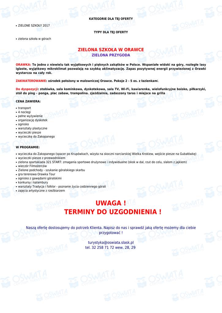 KATEGORIE DLA TEJ OFERTY ● ZIELONE SZKOŁY 2017 TYPY DLA TEJ OFERTY ● zielona szkoła w górach ZIELONA SZKOŁA W ORAWCE ZIELONA PRZYGODA ORAWKA: To jedno z niewielu tak wyjątkowych i pięknych zakątków w Polsce. Wspaniałe widoki na góry, rozległe lasy iglaste, wyjątkowy mikroklimat pozwalają na szybką aklimatyzację. Zapas pozytywnej energii przywiezionej z Orawki wystarcza na cały rok. ZAKWATEROWANIE: ośrodek położony w malowniczej Orawce. Pokoje 2 - 5 os. z łazienkami. Do dyspozycji: stołówka, sala kominkowa, dyskotekowa, sala TV, Wi-Fi, kawiarenka, wielofunkcyjne boisko, piłkarzyki, stół do ping - ponga, plac zabaw, trampolina. zjeżdżalnia, zadaszony taras i miejsce na grilla CENA ZAWIERA: ● ● ● ● ● ● ● ● transport 4 noclegi pełne wyżywienie organizację dyskotek ognisko warsztaty plastyczne wycieczki piesze wycieczkę do Zakopanego W PROGRAMIE: ● ● ● ● ● ● ● ● ● ● wycieczka do Zakopanego (spacer po Krupówkach, wizyta na skoczni narciarskiej Wielka Krokiew, wejście piesze na Gubałówkę) wycieczki piesze z przewodnikiem zielona spartakiada 321 START: zmagania sportowe drużynowe i indywidualne (skok w dal, rzut do celu, slalom z jajkiem) wieczór Filmożerców Zielone podchody - szukanie góralskiego skarbu gra terenowa Orawka Tour ognisko z gawędami góralskimi konkursy i kalambury warsztaty Tradycja i folklor - poznanie życia codziennego górali zajęcia artystyczne z rzeźbiarzem UWAGA ! TERMINY DO UZGODNIENIA ! Naszą ofertę dostosujemy do potrzeb Klienta. Napisz do nas i sprawdź jaką ofertę możemy dla ciebie przygotować ! [email protected] tel. 32 258 71 72 wew. 28, 29