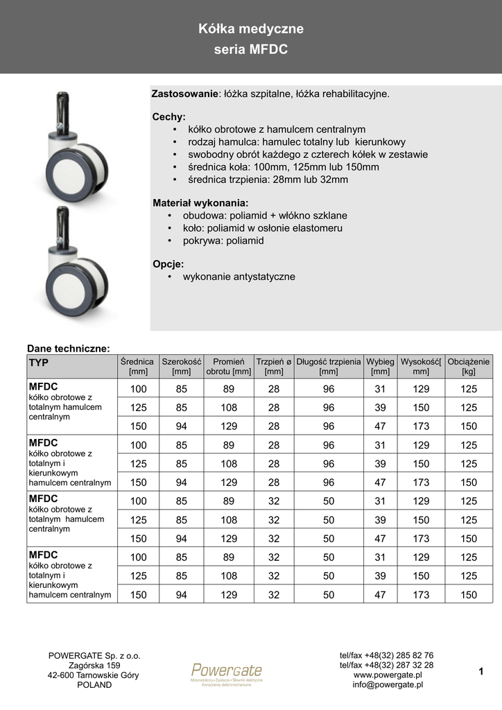 Kółka medyczne seria MFDC Zastosowanie: łóżka szpitalne, łóżka rehabilitacyjne. Cechy: • kółko obrotowe z hamulcem centralnym • rodzaj hamulca: hamulec totalny lub kierunkowy • swobodny obrót każdego z czterech kółek w zestawie • średnica koła: 100mm, 125mm lub 150mm • średnica trzpienia: 28mm lub 32mm Materiał wykonania: • obudowa: poliamid + włókno szklane • koło: poliamid w osłonie elastomeru • pokrywa: poliamid Opcje: • wykonanie antystatyczne Dane techniczne: TYP MFDC kółko obrotowe z totalnym hamulcem centralnym MFDC kółko obrotowe z totalnym i kierunkowym hamulcem centralnym MFDC kółko obrotowe z totalnym hamulcem centralnym MFDC kółko obrotowe z totalnym i kierunkowym hamulcem centralnym Średnica Szerokość Promień Trzpień ø Długość trzpienia Wybieg Wysokość[ Obciążenie [mm] [mm] obrotu [mm] [mm] [mm] [mm] mm] [kg] 100 85 89 28 96 31 129 125 125 85 108 28 96 39 150 125 150 94 129 28 96 47 173 150 100 85 89 28 96 31 129 125 125 85 108 28 96 39 150 125 150 94 129 28 96 47 173 150 100 85 89 32 50 31 129 125 125 85 108 32 50 39 150 125 150 94 129 32 50 47 173 150 100 85 89 32 50 31 129 125 125 85 108 32 50 39 150 125 150 94 129 32 50 47 173 150 POWERGATE Sp. z o.o. Zagórska 159 42-600 Tarnowskie Góry POLAND tel/fax +48(32) 285 82 76 tel/fax +48(32) 287 32 28 www.powergate.pl [email protected] 1 Kółka medyczne seria MFDC Rodzaje zamocowań: Trzpień z hamulcem centralnym Trzpień zwykły Trzpień gwintowany Płytka mocująca POWERGATE Sp. z o.o. Zagórska 159 42-600 Tarnowskie Góry POLAND tel/fax +48(32) 285 82 76 tel/fax +48(32) 287 32 28 www.powergate.pl [email protected] 2