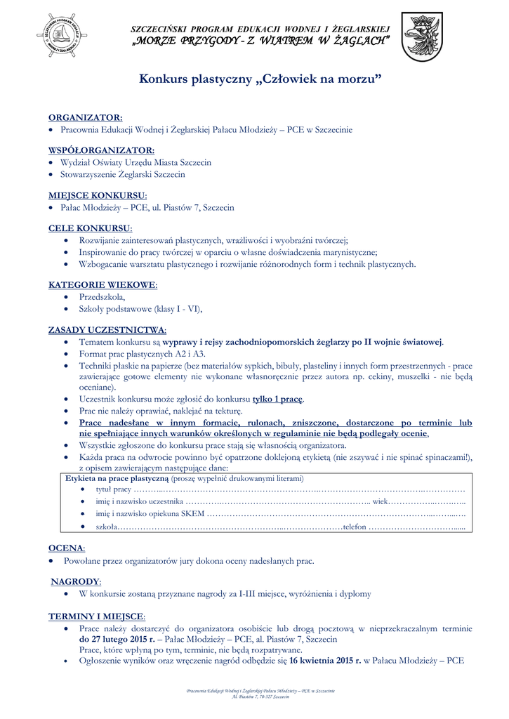 SZCZECIŃSKI PROGRAM EDUKACJI WODNEJ I ŻEGLARSKIEJ „MORZE PRZYGODY - Z WIATREM W ŻAGLACH” Konkurs plastyczny „Człowiek na morzu” ORGANIZATOR: Pracownia Edukacji Wodnej i Żeglarskiej Pałacu Młodzieży – PCE w Szczecinie WSPÓŁORGANIZATOR: Wydział Oświaty Urzędu Miasta Szczecin Stowarzyszenie Żeglarski Szczecin MIEJSCE KONKURSU: Pałac Młodzieży – PCE, ul. Piastów 7, Szczecin CELE KONKURSU: Rozwijanie zainteresowań plastycznych, wrażliwości i wyobraźni twórczej; Inspirowanie do pracy twórczej w oparciu o własne doświadczenia marynistyczne; Wzbogacanie warsztatu plastycznego i rozwijanie różnorodnych form i technik plastycznych. KATEGORIE WIEKOWE: Przedszkola, Szkoły podstawowe (klasy I - VI), ZASADY UCZESTNICTWA: Tematem konkursu są wyprawy i rejsy zachodniopomorskich żeglarzy po II wojnie światowej. Format prac plastycznych A2 i A3. Techniki płaskie na papierze (bez materiałów sypkich, bibuły, plasteliny i innych form przestrzennych - prace zawierające gotowe elementy nie wykonane własnoręcznie przez autora np. cekiny, muszelki - nie będą oceniane). Uczestnik konkursu może zgłosić do konkursu tylko 1 pracę. Prac nie należy oprawiać, naklejać na tekturę. Prace nadesłane w innym formacie, rulonach, zniszczone, dostarczone po terminie lub nie spełniające innych warunków określonych w regulaminie nie będą podlegały ocenie, Wszystkie zgłoszone do konkursu prace stają się własnością organizatora. Każda praca na odwrocie powinno być opatrzone doklejoną etykietą (nie zszywać i nie spinać spinaczami!), z opisem zawierającym następujące dane: Etykieta na prace plastyczną (proszę wypełnić drukowanymi literami) tytuł pracy ………..……………………………………………….……………………………….…………… imię i nazwisko uczestnika ………….…………………………………………….. wiek……………..…….….. imię i nazwisko opiekuna SKEM ……………………………………………………………………..……...…. szkoła…………………………………………………..…………………telefon …………………………...... OCENA: Powołane przez organizatorów jury dokona oceny nadesłanych prac. NAGRODY: W konkursie zostaną przyznane nagrody za I-III miejsce, wyróżnienia i dyplomy TERMINY I MIEJSCE: Prace należy dostarczyć do organizatora osobiście lub drogą pocztową w nieprzekraczalnym terminie do 27 lutego 2015 r. – Pałac Młodzieży – PCE, al. Piastów 7, Szczecin Prace, które wpłyną po tym, terminie, nie będą rozpatrywane. Ogłoszenie wyników oraz wręczenie nagród odbędzie się 16 kwietnia 2015 r. w Pałacu Młodzieży – PCE Pracownia Edukacji Wodnej i Żeglarskiej Pałacu Młodzieży – PCE w Szczecinie Al. Piastów 7, 70-327 Szczecin