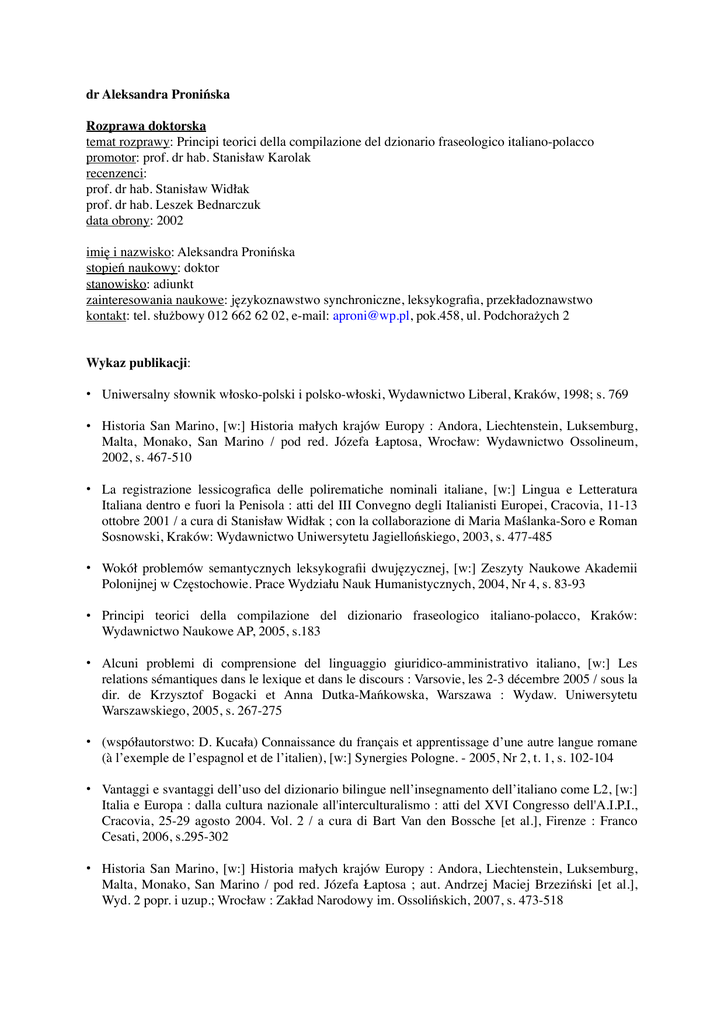 dr Aleksandra Pronińska Rozprawa doktorska temat rozprawy: Principi teorici della compilazione del dzionario fraseologico italiano-polacco promotor: prof. dr hab. Stanisław Karolak recenzenci: prof. dr hab. Stanisław Widłak prof. dr hab. Leszek Bednarczuk data obrony: 2002 imię i nazwisko: Aleksandra Pronińska stopień naukowy: doktor stanowisko: adiunkt zainteresowania naukowe: językoznawstwo synchroniczne, leksykografia, przekładoznawstwo kontakt: tel. służbowy 012 662 62 02, e-mail: [email protected], pok.458, ul. Podchorażych 2 Wykaz publikacji: • Uniwersalny słownik włosko-polski i polsko-włoski, Wydawnictwo Liberal, Kraków, 1998; s. 769 • Historia San Marino, [w:] Historia małych krajów Europy : Andora, Liechtenstein, Luksemburg, Malta, Monako, San Marino / pod red. Józefa Łaptosa, Wrocław: Wydawnictwo Ossolineum, 2002, s. 467-510 • La registrazione lessicografica delle polirematiche nominali italiane, [w:] Lingua e Letteratura Italiana dentro e fuori la Penisola : atti del III Convegno degli Italianisti Europei, Cracovia, 11-13 ottobre 2001 / a cura di Stanisław Widłak ; con la collaborazione di Maria Maślanka-Soro e Roman Sosnowski, Kraków: Wydawnictwo Uniwersytetu Jagiellońskiego, 2003, s. 477-485 • Wokół problemów semantycznych leksykografii dwujęzycznej, [w:] Zeszyty Naukowe Akademii Polonijnej w Częstochowie. Prace Wydziału Nauk Humanistycznych, 2004, Nr 4, s. 83-93 • Principi teorici della compilazione del dizionario fraseologico italiano-polacco, Kraków: Wydawnictwo Naukowe AP, 2005, s.183 • Alcuni problemi di comprensione del linguaggio giuridico-amministrativo italiano, [w:] Les relations sémantiques dans le lexique et dans le discours : Varsovie, les 2-3 décembre 2005 / sous la dir. de Krzysztof Bogacki et Anna Dutka-Mańkowska, Warszawa : Wydaw. Uniwersytetu Warszawskiego, 2005, s. 267-275 • (współautorstwo: D. Kucała) Connaissance du français et apprentissage d’une autre langue romane (à l’exemple de l’espagnol et de l’italien), [w:] Synergies Pologne. - 2005, Nr 2, t. 1, s. 102-104 • Vantaggi e svantaggi dell’uso del dizionario bilingue nell’insegnamento dell’italiano come L2, [w:] Italia e Europa : dalla cultura nazionale all'interculturalismo : atti del XVI Congresso dell'A.I.P.I., Cracovia, 25-29 agosto 2004. Vol. 2 / a cura di Bart Van den Bossche [et al.], Firenze : Franco Cesati, 2006, s.295-302 • Historia San Marino, [w:] Historia małych krajów Europy : Andora, Liechtenstein, Luksemburg, Malta, Monako, San Marino / pod red. Józefa Łaptosa ; aut. Andrzej Maciej Brzeziński [et al.], Wyd. 2 popr. i uzup.; Wrocław : Zakład Narodowy im. Ossolińskich, 2007, s. 473-518 • La sentenza italiana: alcune considerazioni sui rapporti temporali, [w:] Études Romanes de Brno. 2009, R. 30, č. 1, s. 7-14 • Per una classificazione dei neologismi deonomastici nell’italiano contemporaneo: il caso degli aggettivi deantroponimici, [in:] Analele Universităţii "Dunărea de Jos" din Galaţi. Fascicola XXIV, Lexic Comun. - 2010, Anul 3, Nr 2 (4), s.137-142 • Język specjalistyczny w nauczaniu drugiego języka obcego, [w:] Interdyscyplinarność w nauczaniu języków obcych : XIV konferencja naukowo-dydaktyczna Studium Języków Obcych Politechniki Wrocławskiej pod honorowym patronatem Jego Magnificencji Rektora Politechniki Wrocławskiej prof. dr hab. inż. Tadeusza Więckowskiego w ramach obchodów Jubileuszu 100-lecia Uczelni Technicznych we Wrocławiu, Wrocław 24-26 września 2010 r. / [red. nauk. Romualda Kuźmińska], Wrocław : Oficyna Wydawnicza Politechniki Wrocławskiej, 2010, s.343-347 • Tra l’identità e l’alterità dei termini, [w:] Philologia XXI : supplementum II / [red. Eva Tkáčiková], Bratislava : Univerzita Komenského Bratislava, 2011, s.156-162 • Toponimi spagnoli in italiano e italiani in spagnolo: normativa e uso, [w:] La penisola iberica e l'Italia : rapporti storico-culturali, linguistici e letterari : atti del XVIII Congresso dell'A.I.P.I., Oviedo, 3-6 settembre 2008 / Michel Bastiaensen, Firenze : Franco Cesati Editore, 2011, s. 57-76 • Dall'ellissi anaforica alla riduzione all'interno del sintagma nominale terminologico, [w:] Synergies Pologne. - 2011, Nr 8, s. 203-208 • (współautorstwo: D. Kucała) "Nowe i stare" termiy lingwistyki informatycznej : (na przykładzie języka polskiego i wybranych języków romańskich), [w:] Termin w językoznawstwie / pod red. Doroty Brzozowskiej i Władysława Chłopickiego, Kraków : Tertium, 2012, s. 141-149 • (współautorstwo: A. Paleta) L'Italia insulare nei manuali d'italiano L2 e LS di oggi e di ieri, [w:] Insularità e cultura mediterranea nella lingua e nella letteratura italiana. T. 2, L'altro mediterraneo e altre sponde / a cura di Corinna Salvadori Lonergan, Firenze: Franco Cesati Editore, s. 493-503 • Włoskie konstrukcje eliptyczne w leksykografii ogólnej i terminologicznej, [w:] Neofilologie na przełomie tysiącleci : najnowsze tendencje w literaturze, językoznawstwie, przekładzie i glottodydaktyce / pod red. Przemyslawa Sznurkowskiego, Elżbiety Pawlikowskiej-Asendrych i Beaty Rusek, Częstochowa ; Wrocław : Oficyna Wydawnicza "Atut" - Wrocławskie Wydawnictwo Oświatowe, 2012, s.291-301 • Od badań korpusowych do słownika : (na podstawie użycia włoskiego come), [w:] Studia Neofilologiczne.. - 2013, T. 9, s. 157-167 • L'onimizzazione rodariana, ovvero la fantasia "addomesticata", [w:] Il nome nel testo, 2013, 15, s. 351-359 • Il nome proprio nella struttura del sintagma nominale, [w:] Studia Romanica Posnaniensia, 2013, vol. 40, nr 3, s. 65-79 • Wzorzec gatunkowy a przekład specjalistyczny (analiza wybranych mechanizmów upraszczania języka w polskiej i włoskiej ulotce dla pacjenta), [w:] Acta Universitatis Lodziensis. Folia Linguistica, 2013, nr 47, s. 33-45 • Ancora sulla polivalenza del suffisso -ino: il caso dei derivati deantroponimici, [w:] Percorsi linguistici tra Italia e 
