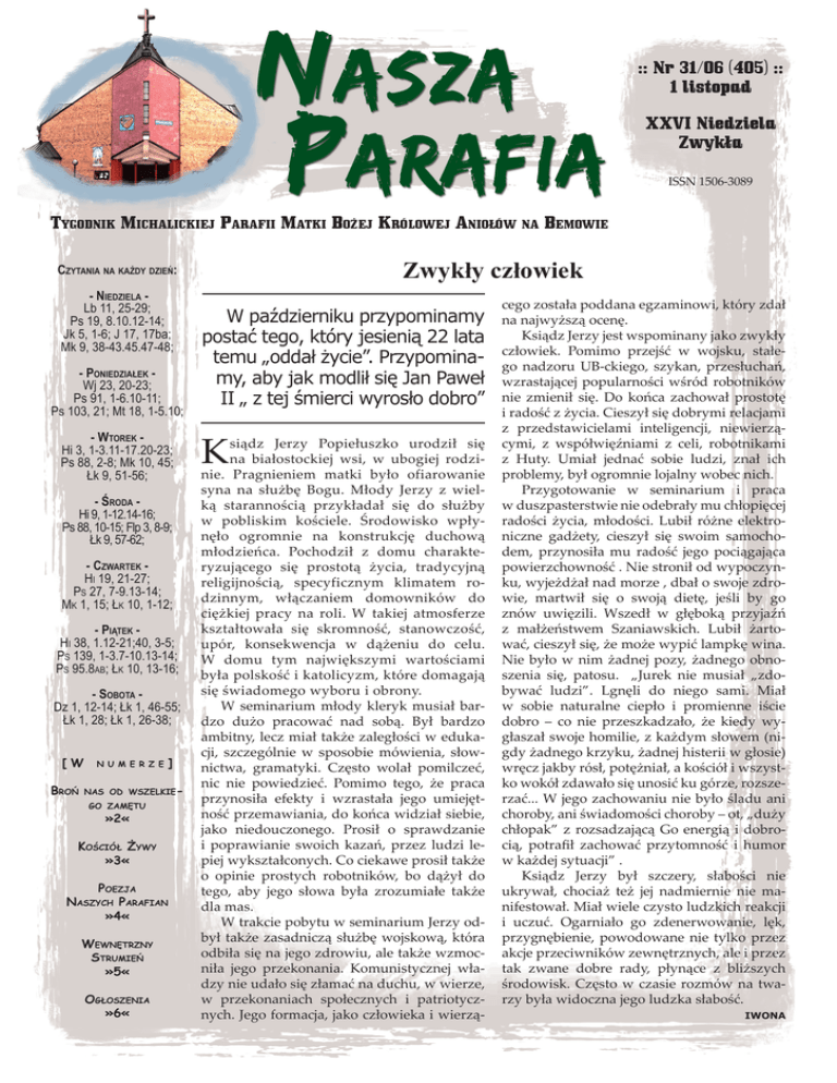 :: Nr 31/06 (405) :: 1 listopad XXVI Niedziela Zwykła ISSN 1506-3089 Tygodnik Michalickiej Parafii Matki Bożej Królowej Aniołów - Poniedziałek Wj 23, 20-23; Ps 91, 1-6.10-11; Ps 103, 21; Mt 18, 1-5.10; - Wtorek Hi 3, 1-3.11-17.20-23; Ps 88, 2-8; Mk 10, 45; Łk 9, 51-56; - Środa Hi 9, 1-12.14-16; Ps 88, 10-15; Flp 3, 8-9; Łk 9, 57-62; - Czwartek Hi 19, 21-27; Ps 27, 7-9.13-14; Mk 1, 15; Łk 10, 1-12; - Piątek Hi 38, 1.12-21;40, 3-5; Ps 139, 1-3.7-10.13-14; Ps 95.8ab; Łk 10, 13-16; - Sobota Dz 1, 12-14; Łk 1, 46-55; Łk 1, 28; Łk 1, 26-38; [W Broń n u m e r z e ] nas od wszelkiego zamętu »2« Kościół Żywy »3« Poezja Naszych Parafian »4« Wewnętrzny Strumień »5« Ogłoszenia »6« Bemowie Zwykły człowiek Czytania na każdy dzień: - Niedziela Lb 11, 25-29; Ps 19, 8.10.12-14; Jk 5, 1-6; J 17, 17ba; Mk 9, 38-43.45.47-48; na W październiku przypominamy postać tego, który jesienią 22 lata temu „oddał życie”. Przypominamy, aby jak modlił się Jan Paweł II „ z tej śmierci wyrosło dobro” K siądz Jerzy Popiełuszko urodził się na białostockiej wsi, w ubogiej rodzinie. Pragnieniem matki było ofiarowanie syna na służbę Bogu. Młody Jerzy z wielką starannością przykładał się do służby w pobliskim kościele. Środowisko wpłynęło ogromnie na konstrukcję duchową młodzieńca. Pochodził z domu charakteryzującego się prostotą życia, tradycyjną religijnością, specyficznym klimatem rodzinnym, włączaniem domowników do ciężkiej pracy na roli. W takiej atmosferze kształtowała się skromność, stanowczość, upór, konsekwencja w dążeniu do celu. W domu tym największymi wartościami była polskość i katolicyzm, które domagają się świadomego wyboru i obrony. W seminarium młody kleryk musiał bardzo dużo pracować nad sobą. Był bardzo ambitny, lecz miał także zaległości w edukacji, szczególnie w sposobie mówienia, słownictwa, gramatyki. Często wolał pomilczeć, nic nie powiedzieć. Pomimo tego, że praca przynosiła efekty i wzrastała jego umiejętność przemawiania, do końca widział siebie, jako niedouczonego. Prosił o sprawdzanie i poprawianie swoich kazań, przez ludzi lepiej wykształconych. Co ciekawe prosił także o opinie prostych robotników, bo dążył do tego, aby jego słowa była zrozumiałe także dla mas. W trakcie pobytu w seminarium Jerzy odbył także zasadniczą służbę wojskową, która odbiła się na jego zdrowiu, ale także wzmocniła jego przekonania. Komunistycznej władzy nie udało się złamać na duchu, w wierze, w przekonaniach społecznych i patriotycznych. Jego formacja, jako człowieka i wierzą- cego została poddana egzaminowi, który zdał na najwyższą ocenę. Ksiądz Jerzy jest wspominany jako zwykły człowiek. Pomimo przejść w wojsku, stałego nadzoru UB-ckiego, szykan, przesłuchań, wzrastającej popularności wśród robotników nie zmienił się. Do końca zachował prostotę i radość z życia. Cieszył się dobrymi relacjami z przedstawicielami inteligencji, niewierzącymi, z współwięźniami z celi, robotnikami z Huty. Umiał jednać sobie ludzi, znał ich problemy, był ogromnie lojalny wobec nich. Przygotowanie w seminarium i praca w duszpasterstwie nie odebrały mu chłopięcej radości życia, młodości. Lubił różne elektroniczne gadżety, cieszył się swoim samochodem, przynosiła mu radość jego pociągająca powierzchowność . Nie stronił od wypoczynku, wyjeżdżał nad morze , dbał o swoje zdrowie, martwił się o swoją dietę, jeśli by go znów uwięzili. Wszedł w głęboką przyjaźń z małżeństwem Szaniawskich. Lubił żartować, cieszył się, że może wypić lampkę wina. Nie było w nim żadnej pozy, żadnego obnoszenia się, patosu. „Jurek nie musiał „zdobywać ludzi”. Lgnęli do niego sami. Miał w sobie naturalne ciepło i promienne iście dobro – co nie przeszkadzało, że kiedy wygłaszał swoje homilie, z każdym słowem (nigdy żadnego krzyku, żadnej histerii w głosie) wręcz jakby rósł, potężniał, a kościół i wszystko wokół zdawało się unosić ku górze, rozszerzać... W jego zachowaniu nie było śladu ani choroby, ani świadomości choroby – ot, „duży chłopak” z rozsadzającą Go energią i dobrocią, potrafił zachować przytomność i humor w każdej sytuacji” . Ksiądz Jerzy był szczery, słabości nie ukrywał, chociaż też jej nadmiernie nie manifestował. Miał wiele czysto ludzkich reakcji i uczuć. Ogarniało go zdenerwowanie, lęk, przygnębienie, powodowane nie tylko przez akcje przeciwników zewnętrznych, ale i przez tak zwane dobre rady, płynące z bliższych środowisk. Często w czasie rozmów na twarzy była widoczna jego ludzka słabość. IWONA broń nas od wszelkiego zamętu Wizja Księgi K iedy byłem dzieckiem, ojciec pouczył mnie, że muszę bardzo uważać na to co robię, bo wszystkie moje czyny zapisywane są w wielkiej księdze i przyjdzie czas, że będzie się trzeba z tego wytłumaczyć. Była to wiadomość fatalna, oznaczała, ni mniej ni więcej, że niczego nie da się ukryć, i za niektóre sprawy można się najeść wstydu co niemiara. Po wielu latach, najpierw z prostej ciekawości, potem już jakby z konieczności znalezienia odpowiedzi na rozliczne pytania, zacząłem wgłębiać się w nauki, które ludzie enigmatycznie nazywają psychologią. Psyche to po łacinie, o ile wiem, dusza - logia to nauka. Czyli chodzi, ni mniej ni więcej tylko o naukę o duszy. Lata mijały, wizja księgi pozostała jako naiwne wspomnienie dzieciństwa. Aż kiedyś otrzymałem dziwne napomnienie. Trafiłem na lekturę, którą z marszu odrzuciłem, aby dopiero po pięciu latach do niej powrócić. Autorem był profesor biologii, ksiądz. I co się okazało - jest taka wielka księga, w której zapisane są wszystkie moje czyny. Ba, więcej bo wszystko cokolwiek do mnie dotarło jako słowo, dźwięk, wrażenie, ból, radość, nuda, zwątpienie. Profesor ut