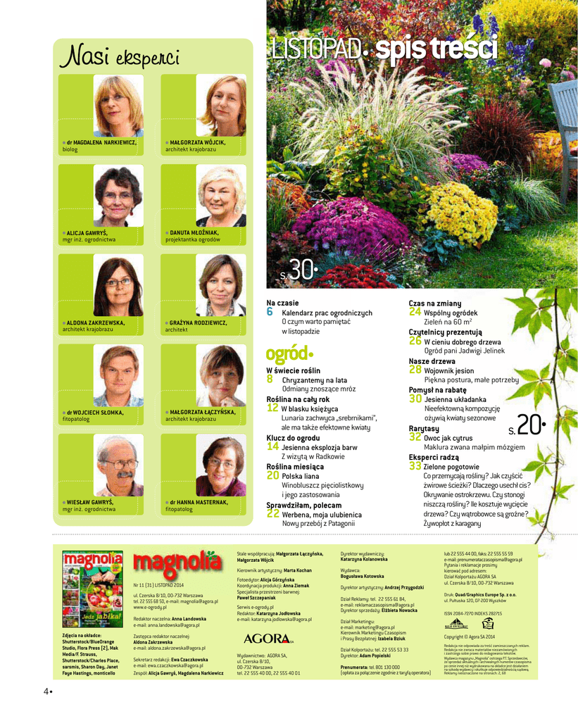 Nasi eksperci dr MAGDALENA NARKIEWICZ, biolog MAŁGORZATA WÓJCIK, architekt krajobrazu ALICJA GAWRYŚ, mgr inż. ogrodnictwa DANUTA MŁOŹNIAK, projektantka ogrodów LISTOPAD. spis treści s. 30. Na czasie 6 ALDONA ZAKRZEWSKA, architekt krajobrazu GRAŻYNA RODZIEWICZ, architekt Czas na zmiany Kalendarz prac ogrodniczych O czym warto pamiętać w listopadzie ogród. Ogród pani Jadwigi Jelinek Nasze drzewa 28 Wojownik jesion Chryzantemy na lata Odmiany znoszące mróz MAŁGORZATA ŁĄCZYŃSKA, architekt krajobrazu Piękna postura, małe potrzeby Pomysł na rabatę 30 Jesienna układanka Roślina na cały rok dr WOJCIECH SŁOMKA, fitopatolog Zieleń na 60 m2 Czytelnicy prezentują 26 W cieniu dobrego drzewa W świecie roślin 8 24 Wspólny ogródek 12 W blasku księżyca Lunaria zachwyca „srebrnikami”, ale ma także efektowne kwiaty Klucz do ogrodu 14 Jesienna eksplozja barw Z wizytą w Radkowie Nieefektowną kompozycję ożywią kwiaty sezonowe Rarytasy 32 Owoc jak cytrus 20 Polska liana Maklura zwana małpim mózgiem Eksperci radzą Winobluszcz pięciolistkowy i jego zastosowania WIESŁAW GAWRYŚ, mgr inż. ogrodnictwa dr HANNA MASTERNAK, fitopatolog Sprawdziłam, polecam 22 Werbena, moja ulubienica Nowy przebój z Patagonii Nr 11 (31) LISTOPAD 2014 ul. Czerska 8/10, 00-732 Warszawa tel. 22 555 68 50, e-mail: [email protected] www.e-ogrody.pl Redaktor naczelna: Anna Landowska e-mail: [email protected] Zdjęcia na okładce: Shutterstock/BlueOrange Studio, Flora Press [2], Mak Media/F. Strauss, Shutterstock/Charles Place, sarsmis, Sharon Day, Janet Faye Hastings, monticello 4 . Stale współpracują: Małgorzata Łączyńska, Małgorzata Wójcik Dyrektor wydawniczy: Katarzyna Kolanowska Kierownik artystyczny: Mar ta Kochan Wydawca: Bogusława Kotowska Fotoedytor: Alicja Górzyńska Koordynacja produkcji: Anna Ziemak Specjalista przestrzeni barwnej: Paweł Szczepaniak Serwis e-ogrody.pl Redaktor: Katarzyna Jodłowska e-mail: [email protected] Zastępca redaktor naczelnej: Aldona Zakrzewska e-mail: [email protected] Sekretarz redakcji: Ewa Czaczkowska e-mail: [email protected] Zespół: Alicja Gawryś, Magdalena Narkiewicz Wydawnictwo: AGORA SA, ul. Czerska 8/10, 00-732 Warszawa tel. 22 555 40 00, 22 555 40 01 20. 33 Zielone pogotowie Roślina miesiąca s. Co przemycają rośliny? Jak czyścić żwirowe ścieżki? Dlaczego usechł cis? Okrywanie ostrokrzewu. Czy stonogi niszczą rośliny? Ile kosztuje wycięcie drzewa? Czy wątrobowce są groźne? Żywopłot z karagany Dyrektor artystyczny: Andrzej Przygodzki Dział Reklamy: tel. 22 555 61 84, e-mail: [email protected] Dyrektor sprzedaży: Elżbieta Nowacka Dział Marketingu: e-mail: [email protected] Kierownik Marketingu Czasopism i Prasy Bezpłatnej: Izabela Bziuk Dział Kolportażu: tel. 22 555 53 33 Dyrektor: Adam Popielski Prenumerata: tel. 801 130 000 (opłata za połączenie zgodnie z taryfą operatora) lub 22 555 44 00, faks: 22 555 55 59 e-mail: [email protected] Pytania i reklamacje prosimy kierować pod adresem: Dział Kolportażu AGORA SA ul. Czerska 8/10, 00-732 Warszawa Druk: Quad/Graphics Europe Sp. z o.o. ul. Pułtuska 120, 07-200 Wyszków ISSN 2084-7270 INDEKS 282715 Copyright © Agora SA 2014 Redakcja nie odpowiada za treść zamieszczanych reklam. Redakcja nie zwraca materiałów niezamówionych i zastrzega sobie prawo do redagowania tekstów. Wydawca magazynu „Magnolia” ostrzega P.T. Sprzedawców, że sprzedaż aktualnych i archiwalnych numerów czasopisma po cenie innej niż wydrukowana na okładce jest działaniem na szkodę wydawcy i skutkuje odpowiedzialnością sądową. Reklamy nieoznaczone na stronach: 2, 68 s. 58. s. Fot. Mak Media/F. Strauss, Mateusz Irek, Zofia Herman/fiolekafrykanski.eu, Shutterstock/Alex Kuzovlev, fotoknips, Pablo77, materiały producentów i dystrybutorów, archiwa prywatne Klinika roślin 36 Nagłe zamieranie roślin Groźny objaw wymagający szybkiej interwencji Metamorfoza 38 Na dwóch stopniach Efektowny, łatwy w pielęgnacji ogród z przestrzenią do zabaw Ze smakiem 40 Jabłka w zasięgu ręki – można je uprawiać nawet na balkonie! 42 Tęgie głowy Najbardziej wartościowe odmiany kapusty oraz przepisy na smakowite dania Serwis ogrodowy 44 Dalie idą spać Jak zabezpieczyć karpy, by zdrowo przezimowały Męska robota 46 Czyszczenie, ostrzenie, oliwienie Na co zwrócić uwagę przy konserwacji narzędzi ogrodniczych s. Obserwatorium 48 Kacze miss piękności Kaczki ozdobne – niewymagające i łatwe do oswojenia balkon itaras. Na medal 50 A balkon ciągle w kwiatach... Kolorowe dekoracje na jesienne dni 54 Dla singla Jak zagospodarować długi i wąski taras dom. Rarytas 56 Rogaty storczyk Masdewalia, miniaturka o oryginalnych kwiatach Parapetówka 58 Kwiaty na etacie Rośliny, które stworzą dobry klimat do pracy 8. 54. Zrób to sam 60 Szyszki w rozkwicie Robimy ozdoby na stół – krok po kroku Rozrywka 53 Krzyżówka ogrodnicza z nagrodami s. 12. Wasze sukcesy 62 Pochwalcie się swoim ogrodem, balkonem, rośliną! Wasz temat: Hortensje nie tracą urody Co w trawie piszczy 64 Warto zobaczyć: Rogów – królestwo klonów. A także ciekawostki, nowości, kalendarium imprez ogrodniczych 66 Za miesiąc w „Magnolii” s. 50. 5 .