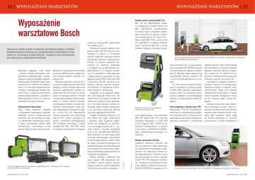 22 | WYPOSAŻENIE WARSZTATÓW WYPOSAŻENIE WARSZTATÓW | 23 Wyposażenie warsztatowe Bosch Diagnozowanie sterowników Pracą niemal wszystkich zespołów i podzespołów nowoczesnych pojazdów zarządzają obecnie mikroprocesorowe sterowniki. One też kontrolują na bieżą co prawidłowość realizowanych funkcji, a zapisy ewentualnych usterek, także mechanicznych, przechowują w swej pamięci. Stąd też odczyt informacji zako dowanych w odpowiednich sterownikach za pomocą elektronicznych urządzeń sta nowi postawę wszelkich czynności dia gnostycznych. Najnowsza generacja znanej od lat li nii testerów diagnostycznych Bosch KTS obsługuje nie tylko wszystkie dotychczas stosowane diagnostyczne interfejsy po jazdów, lecz również przyszłe ich wersje, oparte na standardzie Ethernet. Ponadto nowa generacja testerów KTS jest wypo sażona w funkcję PassThru-Interface, umożliwiającą korzystanie z portali inter netowych samochodowych marek pod czas programowania sterowników zgod nie z normą Euro 5/6. Równocześnie znacznie poprawiono moc obliczeniową testerów KTS, istotnie zwiększono ich pamięć i umożliwiono równoległą pracę kilku interfejsów. Korzystając z nowych modułów KTS 560 i KTS 590, można na przykład wykorzystywać do diagnozy Nowe urządzenia do diagnozy sterowników z interfejsem Ethernet oraz PassThru-Interface Autonaprawa | Luty 2017 rotnice przednich kół, co przy wykorzy staniu przyrządu FWA 4630/50 pozwala na badanie geometrii podwozi w techno logii 3D. Warsztaty mogą za jego pomocą przeprowadzać pomiary ustawienia kół i osi oraz określać geometryczną oś toru jazdy. To z kolei stwarza warunki do kalibro wania w warsztacie za pomocą przyrzą du DAS 1000 systemów wspomagania kierowcy, takich jak samoczynne zacho wywanie odległości od poprzedzającego pojazdu lub rozpoznawanie znaków dro gowych. Warsztatowa stacja badania spalin Bosch BEA 750 nuje współpracująca z nimi przystawka BEA 030. System BEA 750 może być dodatkowo wyposażony w moduł KTS 515 do diagnozy OBD. Całość jest już fabrycznie skonfigurowana, co pozwala na jej użycie w warsztacie bez dodatko wego, czasochłonnego pierwszego uru chamiania. Fot. Bosch Najnowsze osiągnięcia marki Bosch z dziedziny techniki warsztatowej, opro gramowania diagnostycznego i specjali stycznych usług dla warsztatów zaprezen towane zostały na ostatnich targach Auto mechanika we Frankfurcie nad Menem. Część z nich stanowiły niekwestionowane innowacje, wykorzystujące dorobek inży nierski innych, rozwijanych przez Boscha działów światowej techniki, a pozostałe to kolejne generacje znanych już i wciąż do skonalonych firmowych systemów. Wypoziomowane stanowisko do diagnostyki podwozi i kontroli ustawienia reflektorów samochodu Fot. Bosch Aktualna oferta firmy w zakresie motoryzacyjnego sprzętu warsztatowego pozwala na kompleksowe wyposażenie usługowych placówek serwisowych i naprawczych stosowne do obecnych i przyszłych potrzeb nawet trzy interfejsy CAN i jednocześnie trzy interfejsy linii K. Wdrażany do seryjnej produkcji zinte growany tester KTS 350 typu all-in-one (wszystko w jednym) z 10-calowym ekranem dotykowym dysponuje również pełną gamą możliwości nowej generacji KTS-ów. To poręczne urządzenie prze znaczone do mobilnych zastosowań w warsztacie ma już zainstalowany pro gram ESI[tronic] 2.0. Znacznie mocniej szy niż w poprzednim modelu tego typu urządzeń procesor, wyposażony w cztery gigabajty pamięci RAM i szybki dysk SSD o pojemności 256 GB, zapewnia w po łączeniu z obecnym systemem operacyj nym Windows 10 bezzwłoczne urucha mianie programu i szybką pracę. Zwiększyła się też wydajność tabletu DCU 100 Diagnostic Control Unit. Ten solidny tester z 10-calowym ekranem do zastosowań mobilnych został wyposażo ny w mocniejszy procesor. Zamiast tra dycyjnego dysku twardego zastosowano w nim dysk SSD o pojemności 256 GB oraz cztery gigabajty pamięci RAM. Program warsztatowy ESI[tronic] 2.0 firmy Bosch jest ciągle udoskonalany i rozwijany. Jeżeli urządzenie diagno styczne jest podłączone do Internetu, to od pierwszego kwartału 2017 r. po zwala pobierać wszystkie aktualizacje w tle on-line. Ponadto dzięki ESI[tronic] Web użytkownik ma teraz dostęp także do portalu internetowego z informacjami na temat diagnozowania i napraw. Portal ten będzie umożliwiał otrzymywanie na przykład brakującej informacji dotyczącej danej naprawy, bez konieczności instalo wania dodatkowego oprogramowania na urządzeniu warsztatowym. Kolejną nowością w ESI[tronic] jest nowy program EBR (Experienced Based Repair), który po wykryciu podczas diagnozy znanej mu usterki podpowiada mechanikowi sprawdzone rozwiązanie. Badanie spalin za pomocą BEA 750 BEA 750 jest udoskonalonym następ cą analogicznych urządzeń Bosch serii BEA 150/250/350, przystosowanym do badania spalin w pojazdach spełnia jących normę Euro 6, zgodnie z wytycz nymi obowiązującymi od 1 lipca 2015 r. Nowy model BEA 750 w wersji kombi jest wyposażony w 4-gazowy analizator spalin i dymomierz BEA 070, a pomiar prędkości obrotowej i temperatury wyko Mobilne stanowisko LTB 300 Urządzenie oznaczone symbolem LTB 300 jest specjalnym, łatwo poziomowa nym stanowiskiem warsztatowym, dosto sowanym do wykonywania różnych za dań diagnostycznych. Umożliwia ono za pomocą przyrządu do kontroli i regulacji świateł HTD 815 precyzyjne sprawdze nie i ustawienie samochodowych reflek torów, zgodnie z aktualnymi przepisami. Ponadto LTB 300 jest wyposażone w ob Pomiar głębokości bieżnika opon TTM Nowy system TTM (Tire Tread Measurement) służy do szybkiego pomiaru głębo kości bieżników opon. Uruchamia się on automatycznie, gdy pojazd przejeżdża po elemencie pomiarowym z maksymalną prędkością 8 km/h. Kilka sekund później jest wyświetlana na monitorze dokładna głębokość bieżników ogumienia wszyst kich czterech kół. W systemie tym za stosowano metod