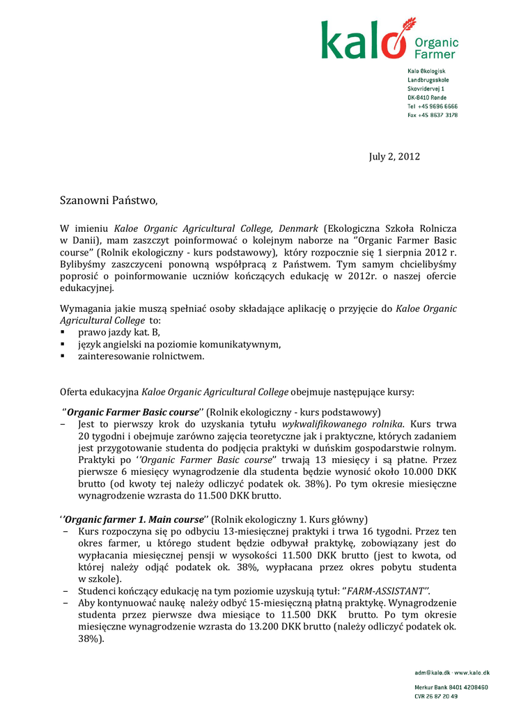 July 2, 2012 Szanowni Państwo, W imieniu Kaloe Organic Agricultural College, Denmark (Ekologiczna Szkoła Rolnicza w Danii), mam zaszczyt poinformować o kolejnym naborze na ‘’Organic Farmer Basic course’’ (Rolnik ekologiczny - kurs podstawowy), który rozpocznie się 1 sierpnia 2012 r. Bylibyśmy zaszczyceni ponowną współpracą z Państwem. Tym samym chcielibyśmy poprosić o poinformowanie uczniów kończących edukację w 2012r. o naszej ofercie edukacyjnej. Wymagania jakie muszą spełniać osoby składające aplikację o przyjęcie do Kaloe Organic Agricultural College to: prawo jazdy kat. B, język angielski na poziomie komunikatywnym, zainteresowanie rolnictwem. Oferta edukacyjna Kaloe Organic Agricultural College obejmuje następujące kursy: ‘’Organic Farmer Basic course’’ (Rolnik ekologiczny - kurs podstawowy) − Jest to pierwszy krok do uzyskania tytułu wykwalifikowanego rolnika. Kurs trwa 20 tygodni i obejmuje zarówno zajęcia teoretyczne jak i praktyczne, których zadaniem jest przygotowanie studenta do podjęcia praktyki w duńskim gospodarstwie rolnym. Praktyki po ‘’Organic Farmer Basic course’’ trwają 13 miesięcy i są płatne. Przez pierwsze 6 miesięcy wynagrodzenie dla studenta będzie wynosić około 10.000 DKK brutto (od kwoty tej należy odliczyć podatek ok. 38%). Po tym okresie miesięczne wynagrodzenie wzrasta do 11.500 DKK brutto. ‘’Organic farmer 1. Main course’’ (Rolnik ekologiczny 1. Kurs główny) − Kurs rozpoczyna się po odbyciu 13-miesięcznej praktyki i trwa 16 tygodni. Przez ten okres farmer, u którego student będzie odbywał praktykę, zobowiązany jest do wypłacania miesięcznej pensji w wysokości 11.500 DKK brutto (jest to kwota, od której należy odjąć podatek ok. 38%, wypłacana przez okres pobytu studenta w szkole). − Studenci kończący edukację na tym poziomie uzyskują tytuł: ‘’FARM-ASSISTANT’’. − Aby kontynuować naukę należy odbyć 15-miesięczną płatną praktykę. Wynagrodzenie studenta przez pierwsze dwa miesiące to 11.500 DKK brutto. Po tym okresie miesięczne wynagrodzenie wzrasta do 13.200 DKK brutto (należy odliczyć podatek ok. 38%). ‘’Organic Farmer 2. Main course’’ (Rolnik ekologiczny 2. Kurs główny) − Kurs trwa 20 tygodni, i tak jak poprzednio student będzie otrzymywał od farmera miesięczne wynagrodzenie w wysokości 13.200 DKK brutto (należy odliczyć podatek ok. 38%). − Po ukończeniu tego kursu studenci otrzymują tytuł ‘’SKILLED FARMER’’. Koszty jakie ponosi student podczas pobytu Kaloe Organic Agricultural College to koszty związane z: zakwaterowaniem, wyżywieniem i materiałami szkolnymi. Miesięczny pobyt w naszym Collegu to opłaty w wysokości 2.800 DKK tj. 1.500 zł. Przed przyjazdem każdy student zobowiązany jest wpłacić depozyt w wysokości 730 EURO - opłata „z góry” za połowę kursu podstawowego. Kwota 2.800 DKK obejmuje następujące koszty: wyżywienie i zakwaterowanie - 550 DKK tygodniowo, materiały szkolne -70 DKK tygodniowo, wycieczki, etc. - 75 DKK tygodniowo. Przedstawione kwoty dotyczą opłat za kurs w 2011 r. - mogą ulec zmianie. Student tylko za ’’Organic Farmer Basic course’’ (Rolnik ekologiczny - kurs podstawowy) musi płacić z własnych pieniędzy. Część kosztów pokryta będzie z depozytu (730 EURO) resztę student odda jak rozpocznie płatną praktykę w gospodarstwie duńskim. Pozostałe koszty związane z nauką w Kaloe Organic Agricultural College student będzie mógł pokryć bez problemu z pensji, którą będzie otrzymywał od farmera. Cały kurs z praktykami trwa ok. 3,5 roku. Tabela poniżej przedstawia wstępny kosztorys oraz przychód. 1DKK=0.56 gr Koszty całkowite Kurs podstawowy 20 tygodni Praktyki Kurs główny 1 Praktyki Kurs główny 2. 13 miesięcy 16 tygodni 15 miesięcy 20 tygodni 13.900 DKK (ceny w roku 2011 - mogą ulec zmianie) 11.120 DKK (ceny w roku 2011 - mogą ulec zmianie) 13.900 DKK (ceny w roku 2011 - mogą ulec zmianie) Pensja miesięczna* Pierwsze 6 miesięcy: ok. 10.000 DKK - pensja będzie rosła w następnych miesiącach. Pozostałe miesiące: 11.500 DKK 11.500 DKK - jest to pensja minimalna może być większa. Pierwsze 2 miesiące: 11.500 DKK. Pozostałe miesiące: 13.200 DKK 13.200 DKK - jest to pensja minimalna może być większa Razem (przychody) 140.500 DKK 46.000 DKK 194.600 DKK 66.000 DKK Koszty 13.900 DKK 11.200 DKK * Podane wynagrodzenie brutto, od którego należy odjąć podatek ok. 38% 13.900 DKK Przychód minus koszty: 447.100 DKK- 39.000DKK=408.100 DKK (przychód brutto od którego należy odjąć podatek ok. 38%) Każdy student po rozpoczęciu edukacji otrzymuje pozwolenie na pobyt w Danii oraz dostęp do bezpłatnej opieki medycznej (nie obejmuje opieki dentystycznej). Wielu absolwentów Kaloe Organic Agricultural College zarządza farmami w Danii otrzymując wysokie wynagrodzenie. Duża część naszych studentów po powrocie do Polski rozwija własne gospodarstwa wykorzystując zdobytą wiedzę i doświadczenie. Prosimy również o przekazaniu uczniom słów zachęty i wyjaśnień. Znajomość języka angielskiego jest barierą, której uczniowie obawiają się najbardziej. Aby rozwiać wątpliwości i uniknąć problemów, z każdym kandydatem przeprowadzona będzie rozmowa kwalifikacyjna (w kwietniu) i każdy dowie się czy da sobie radę, czy też poziom znajomości języka jest niewystarczający. Angielska gramatyka, wymowa i poprawny akcent nie mają dla nas znaczenia. Chodzi o ustalenie, czy poziom komunikacji jest wystarczajacy. Wszystkich chętnych uczniów do podjęcia nauki Kaloe Organic Agricultural College z Państwa szkoły prosimy o bezzwłoczne nadsyłanie aplikacji (w języku angielskim bądź polskim) na adres: Kaloe - Organic Agricultural College - Skovridervej 1, 8410 Rønde Denmark Formularz zgloszeniowy można znaleźć na www.kalo.dk klikając polską flagę. Kandydaci zobowiązani są do przesłania nastę