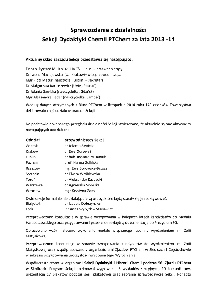 Sprawozdanie z działalności Sekcji Dydaktyki Chemii PTChem za lata 2013 -14 Aktualny skład Zarządu Sekcji przedstawia się następująco: Dr hab. Ryszard M. Janiuk (UMCS, Lublin) – przewodniczący Dr Iwona Maciejowska (UJ, Kraków)– wiceprzewodnicząca Mgr Piotr Mazur (nauczyciel, Lublin) – sekretarz Dr Małgorzata Bartoszewicz (UAM, Poznań) Dr Jolanta Sawicka (nauczycielka, Gdańsk) Mgr Aleksandra Reder (nauczycielka, Zamość) Według danych otrzymanych z Biura PTChem w listopadzie 2014 roku 149 członków Towarzystwa deklarowało chęć udziału w pracach Sekcji. Na podstawie dokonanego przeglądu działalności Sekcji stwierdzono, że aktualnie są one aktywne w następujących oddziałach: Oddział przewodniczący Sekcji Gdańsk Kraków Lublin Poznań Rzeszów Szczecin Toruń Warszawa Wrocław dr Jolanta Sawicka dr Ewa Odrowąż dr hab. Ryszard M. Janiuk prof. Hanna Gulińska mgr Ewa Borowska-Brzoza dr Elwira Wróblewska dr Aleksander Kazubski dr Agnieszka Siporska mgr Krystyna Gans Dwie sekcje formalnie nie działają, ale są osoby, które będą starały się je reaktywować. Białystok dr Izabela Dobrzyńska Łódź dr Anna Wypych – Stasiewicz Przeprowadzono konsultacje w sprawie wytypowania w kolejnych latach kandydatów do Medalu Harabaszewskiego oraz przygotowano i przesłano niezbędną dokumentację do Prezydium ZG. Opracowano wzór i zlecono wykonanie medalu wręczanego razem z wyróżnieniem im. Zofii Matysikowej. Przeprowadzono konsultacje w sprawie wytypowania kandydatów do wyróżnieniem im. Zofii Matysikowej oraz współpracowano z organizatorami Zjazdów PTChem w Siedlcach i Częstochowie w zakresie przygotowania uroczystości wręczenia tego Wyróżnienia. Współuczestniczono w organizacji Sekcji Dydaktyki i Historii Chemii podczas 56. Zjazdu PTChem w Siedlcach. Program Sekcji obejmował wygłoszenie 5 wykładów sekcyjnych, 10 komunikatów, prezentację 17 plakatów podczas sesji plakatowej oraz zebranie sprawozdawcze Sekcji. Ponadto zorganizowane zostały warsztaty metodyczne dla nauczycieli chemii „Chemia życia codziennego”, które poprowadził dr hab. Ryszard M. Janiuk. W trakcie tego Zjazdu Medal Harabaszewskiego otrzymał dr Michał Poźniczek, a następującym nauczycielom wręczone zostało wyróżnienie im. Zofii Matysikowej: 1. mgr Grażyna Makles, Grodzisko Wielkopolskie 2. mgr Elżbieta Wiesława Żeberkiewicz, Łódź 3. dr Barbara Pac, Kraków 4. mgr inż. Dymitr Malec, Leżajsk 5. mgr inż. Hanna Rokita, Warszawa 6. mgr Piotr Jakubiec, Janów Lubelski 7. mgr Dorota Gerlach, Kwidzyń 8. dr Gabriela Osiecka, Tarnobrzeg 9. dr Izabela Dobrzyńska, Białystok 10. mgr Ewa Kowańska, Stargard Szczeciński 11. dr Ludmiła Szterenberg, Wrocław. Przeprowadzono w ramach Sekcji dyskusję zainicjowaną dwoma artykułami K. Pazdro opublikowanymi w „Chemii w Szkole”: „Nazwy substancji w podręcznikach: anarchia czy ignorancja" oraz „O niedoskonałościach podstawy programowej”. Przewodniczący Sekcji wziął udział w II Łódzkiej Konferencji "Problemy Dydaktyki Fizyki", która odbyła się w czerwcu 2013r. Zorganizowano XVI Szkołę Problemów Dydaktyki Chemii, która odbyła się w dniach 20 - 22.06. 2014 w Janowie Lubelskim. W Szkole wzięło udział 56 osób, z czego większość stanowili nauczyciele. Pozostali uczestnicy reprezentowali wyższe uczelnie, wśród których oprócz wykładowców, tradycyjnie byli obecni dydaktycy chemii. Program Szkoły obejmował 9 wykładów, warsztaty, sesję plakatową oraz dyskusję plenarną „Co możemy wspólnie zrobić dla edukacji chemicznej?”. Na stosunkowo niewielką liczbę nauczycieli biorących udział w Szkole, jeśli porównać ją z poprzednimi latami, wpłynęła niewątpliwe konieczność wniesienia dość wysokiej opłaty. Niestety, ze względów formalnych nie było możliwości uzyskania dofinansowania ze środków Ministerstwa Edukacji Narodowej, natomiast Ministerstwo Nauki i Szkolnictwa Wyższego, mimo zgłoszenia odpowiedniego wniosku, nie uznało, że tego typu spotkania środowisk nauczycielskich i naukowych są dostatecznie ważne dla upowszechniania promowania i popularyzacji osiągnięć naukowych. Było to dużą stratą dla realizacji jednego z najważniejszych celów Szkoły, który kilkadziesiąt lat temu miał istotne znaczenie dla pojęcia idei jej organizacji. Obecnie przygotowywana jest publikacja w której znajdą się artykuły uczestników Szkoły. Współuczestniczono w organizacji Sekcji Dydaktyki i Historii Chemii podczas 57. Zjazdu PTChem w Częstochowie. Program Sekcji obejmował wygłoszenie 4 wykładów sekcyjnych, 3 komunikatów, prezentację 10 plakatów podczas sesji plakatowej oraz zebranie sprawozdawcze Sekcji. W trakcie tego Zjazdu Medal Harabaszewskiego otrzymał dr Krzysztof Pazdro, a następującym nauczycielom wręczone zostało wyróżnienie im. Zofii Matysikowej: 1. mgr Jolanta Kociuba, Oddział Lubelski 2. mgr Lidia Zarańska, Oddział Poznański 3. mgr Jolanta Żmuda, Oddział Gdański 4. mgr Monika Stęślik, Oddział Warszawski 5. mgr Bożena Cabaj- Miciak, Oddział Krakowski 6. mgr inż. Jolanta Pietrasz, Oddział Rzeszowski 7. mgr Dorota Czarnecka, Oddział Wrocławski 8. mgr Wiesława Goździk, Oddział Łódzki 9. mgr Aneta Wilczewska, Oddział Białostocki 10. mgr Hanna Górska, Oddział Szczeciński Wszystkie ważniejsze informacje dotyczące działalności Sekcji na bieżąco są umieszczane na stronie internetowej: http://www.ptchem-d.amu.edu.pl/ Wybrane przykłady działalności oddziałowych Sekcji (na podstawie nadesłanych sprawozdań) Gdańsk • Organizacja konferencji:” Chemia ma wiele twarzy” • Przygotowanie artykułu: ”Chemia między nauczycielami i naukowcami- konferencje w Gdańsku” Zorganizowanie etapu wojewódzkiego Konkursu Chemicznego im. A. Swinarskiego wspólnie z Wydziałem Chemii UMK. Konferencja dla nauczycieli: " Chemia w kulturze i sztuce" (2014) Rekomendacja nauczycieli do wyróżnienia Z. M