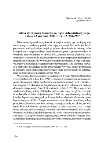 Glosa Rejent * rok 11 * nr 12(128) grudzieñ 2001 r. Glosa do wyroku Naczelnego S¹du Administracyjnego z dnia 22 sierpnia 2000 r. IV SA 2582/98* Glosowany wyrok dotyczy kwestii niezwykle wa¿nej z perspektywy nierozwi¹zanych do dzisiaj problemów reprywatyzacji. Od wielu ju¿ lat do parlamentu trafiaj¹ kolejne projekty, jednak nieuchwalenie ustawy, która kompleksowo uregulowa³aby zagadnienia zwi¹zane z przejmowaniem na w³asnoœæ pañstwa mienia w okresie PRL, zmusza by³ych (niekiedy tylko formalnie) w³aœcicieli do dochodzenia swych praw na podstawie przepisów nacjonalizacyjnych z lat 40-tych, które nadal obowi¹zuj¹. Z tego typu spraw¹ mamy do czynienia w analizowanym przypadku. Aby starannie rozwa¿yæ problemy powstaj¹ce na tle glosowanego wyroku, nale¿y przeœledziæ te elementy stanu faktycznego i prawnego, które doprowadzi³y do ostatecznego rozstrzygniêcia podjêtego przez NSA. Wojewoda, decyzj¹ wydan¹ na podstawie § 5 rozp. Ministra Rolnictwa i Reform Rolnych z dnia 1.03.1945 r., odmówi³ stwierdzenia, ¿e nieruchomoœæ obejmuj¹ca cztery wydzielone na mapach sprzed 1939 r. dzia³ki o ³¹cznej pow. 3,73 ha wraz ze znajduj¹cym siê na nich pa³acem nie podlega dzia³aniu przepisu art. 2 ust. 1 lit. e dekretu z dnia 6.09.1944 r. o przeprowadzeniu reformy rolnej (dalej jako: dekret), a to z tego wzglêdu, i¿ dzia³ki te wchodzi³y w sk³ad maj¹tku o pow. 2.658 ha, uregulowanego w jednej ksiêdze hipotecznej (maj¹tek po³o¿ony by³ na obszarze dzia³ania prawa hipotecznego z 1818 r.). Przepis ten stanowi³ m.in., i¿ na cele reformy rolnej przechodz¹ bezzw³ocznie bez ¿adnego wynagrodzenia, w ca³oœci, na w³asnoœæ Skarbu Pañstwa, z przeznaczeniem na cele wskazane w art. 1 czêœæ druga dekretu, nieruchomoœci ziemskie stanowi¹ce w³asnoœæ albo wspó³w³asnoœæ osób fizycznych lub prawnych, je¿eli ich rozmiar ³¹czny przekracza b¹dŸ 100 ha powierzchni ogólnej, b¹dŸ 50 ha u¿ytków rolnych. Uzasadnieniem dla takiego rozstrzygniêcia by³o stwierdzenie, i¿ przejêty maj¹tek * Zob. Przegl¹d orzecznictwa, Rejent 2001, nr 12, s. 193. 124 Maciej Kaliñski, Glosa do wyroku Naczelnego S¹du Administracyjnego... obejmowa³ dzia³kê stanowi¹c¹ jego oœrodek, na terenie której znajdowa³ siê pa³ac oraz budynki folwarczne i gospodarskie, zatem by³a to nieruchomoœæ funkcjonalnie i gospodarczo zwi¹zana z ca³ym maj¹tkiem jako jego integralna czêœæ. Minister Rolnictwa i Gospodarki ¯ywnoœciowej utrzyma³ tê decyzjê w mocy. Naczelny S¹d Administracyjny uwzglêdni³ skargê i uchyli³ obie decyzje. W uzasadnieniu wyró¿niæ mo¿na kilka momentów, które zas³uguj¹ na staranne rozwa¿enie. NSA s³usznie zaznaczy³, i¿ dekret o reformie rolnej nie zosta³ dotychczas uchylony i obowi¹zuje. To oczywiste poniek¹d stwierdzenie by³o wymuszone przez zarzut strony skar¿¹cej, i¿ ustawa z dnia 28.07.1990 r. o zmianie kodeksu cywilnego uchyli³a dekret. Nic takiego nie mia³o miejsca. Ponadto jednak NSA przyj¹³ tak¿e, i¿ nie utraci³o mocy obowi¹zuj¹cej rozporz¹dzenie Ministra Rolnictwa i Reform Rolnych z dnia 1.03.1945 r. w sprawie wykonania dekretu. Z twierdzeniem tym mo¿na zgodziæ siê tylko o tyle, ¿e rozporz¹dzenie to nie mog³o utraciæ mocy obowi¹zuj¹cej, gdy¿ nigdy jej nie uzyska³o. Dekret nie przewidywa³ bowiem wydania rozporz¹dzenia o tak szerokim zakresie normowania, a stwierdzenie w art. 8 ust. 3 dekretu, i¿ minister „ustali w rozporz¹dzeniu wykonawczym sposób powo³ania pe³nomocników powiatowych i gminnych, gminnych komisyj reformy rolnej i komisyj podzia³u ziemi oraz zakres ich dzia³ania” nie dawa³o ¿adnych podstaw do ustanowienia normy § 5 rozporz¹dzenia, wedle której orzekanie w sprawach, czy dana nieruchomoœæ „podpada” pod dzia³anie przepisów art. 2 ust. 1 lit. e dekretu nale¿y w I instancji do kompetencji wojewódzkich urzêdów ziemskich. Takiej podstawy nie stanowi³ tak¿e art. 20 dekretu, który jego wykonanie powierza³ Ministrowi Rolnictwa i Reform Rolnych. Tak ogólne sformu³owanie w ¿adnym wypadku nie realizuje wymagania szczegó³owego upowa¿nienia ustanowionego w art. 92 ust. 1 Konstytucji z dnia 2.04.1997 r. Kwestiê tê podnoszono w literaturze jeszcze przed wejœciem w ¿ycie obowi¹zuj¹cej Konstytucji1, a to ze wzglêdu na treœæ art. 27 Konstytucji z dnia 23.04.1935 r., obowi¹zuj¹cej w dniu wydania rozporz¹dzenia. Pierwszy krok w kierunku uznania nielegalnoœci rozporz¹dzenia poczyni³ NSA jeszcze w wyroku z dnia 1.12.1995 r.2, uznaj¹c jego 1 Tak B. W i e r z b o w s k i w obszernej i ca³kiem przekonuj¹cej glosie do wyroku NSA z dnia 2 wrzeœnia 1994 r. II SA 2486/92, OSP 1995, nr 6, poz. 126. 2 II SA 1499/94, Wokanda 1996, nr 3, s. 32. 125 Glosa § 11 za wykraczaj¹cy poza delegacjê dekretow¹. Sprawa ta ma zasadnicze znaczenie dla oceny s³usznoœci wyroku NSA. Skoro bowiem uznamy, i¿ dla wydania decyzji przez wojewodê i ministra nie by³o podstawy prawnej, gdy¿ nie by³o takiej podstawy do wydania § 5 rozporz¹dzenia, musimy równie¿ przyj¹æ, i¿ nie dosz³o, zgodnie z art. 2 § 3 k.p.c., do wy³¹czenia drogi s¹dowej w sprawach ustalenia, czy dana nieruchomoœæ podlega dzia³aniu przepisów dekretu. Przecie¿ nie powinno pozostawiaæ w¹tpliwoœci, ¿e sprawa o prawo w³asnoœci nieruchomoœci ziemskiej jest spraw¹ cywiln¹, zatem podlega rozpoznaniu przez s¹dy powszechne, a nie przez organy administracji. Tylko legalny przepis szczególny móg³by doprowadziæ do przekazania takiej sprawy do w³aœciwoœci organów administracji. Przepisu takiego brak w obowi¹zuj¹cym prawodawstwie. Rozstrzyganie zatem, czy nieruchomoœæ podlega³a w dniu 13.09.1944 r. (a co do Ziem Odzyskanych – w dniu 27.11.1945 r.)3 dzia³aniu art. 2 ust. 1 lit.e dekretu powinno nastêpowaæ tylko w postêpowaniu s¹dowym, nigdy zaœ – w administracyjnym. Nale¿y, moim zdaniem, stanowczo odrzuciæ orzecznictwo s¹dowe z okresu PRL, w którym jednoznacznie 