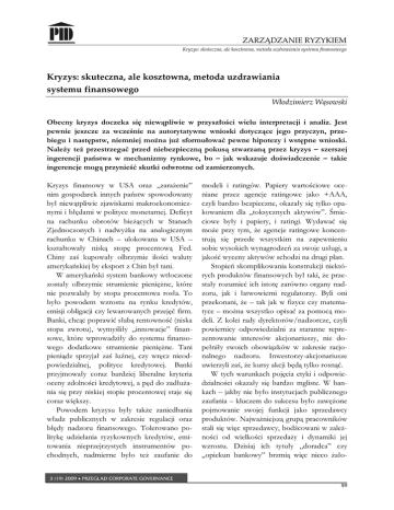 ZARZ&DZANIEȱRYZYKIEM Kryzys:ȱskuteczna,ȱaleȱkosztowna,ȱmetodaȱuzdrawianiaȱsystemuȱfinansowego Kryzys:ȱskuteczna,ȱaleȱkosztowna,ȱmetodaȱuzdrawianiaȱ systemuȱfinansowegoȱ WÙodzimierzȱWsowskiȱ ȱ Obecny kryzys doczeka się niewĊpliwie w przyszâoœci wielu interpretacji i analiz. Jest pewnie jeszcze za wczeœnie na autorytatywne wnioski dotyczĊce jego przyczyn, przebiegu i następstw, niemniej moůna juů sformuâowaý pewne hipotezy i wstępne wnioski. Naleůy teů przestrzegaý przed niebezpiecznĊ pokusĊ stwarzanĊ przez kryzys – szerszej ingerencji paľstwa w mechanizmy rynkowe, bo – jak wskazuje doœwiadczenie – takie ingerencje mogĊ przynieœý skutki odwrotne od zamierzonych. Kryzys finansowy w USA oraz „zaraůenie” nim gospodarek innych paľstw spowodowany byâ niewĊtpliwie zjawiskami makroekonomicznymi i bâędami w polityce monetarnej. Deficyt na rachunku obrotów bieůĊcych w Stanach Zjednoczonych i nadwyůka na analogicznym rachunku w Chinach – ulokowana w USA – ksztaâtowaây niskĊ stopę procentowĊ Fed. Chiny zaœ kupowaây olbrzymie iloœci waluty amerykaľskiej by eksport z Chin byâ tani. W amerykaľski system bankowy wtâoczone zostaây olbrzymie strumienie pienięůne, które nie pozwalaây by stopa procentowa rosâa. To byâo powodem wzrostu na rynku kredytów, emisji obligacji czy lewarowanych przejęý firm. Banki, chcĊc poprawiý sâabĊ rentownoœý (niska stopa zwrotu), wymyœliây „innowacje” finansowe, które wprowadziây do systemu finansowego dodatkowe strumienie pienięůne. Tani pieniĊdz sprzyjaâ zaœ luŭnej, czy wręcz nieodpowiedzialnej, polityce kredytowej. Banki przyjmowaây coraz bardziej liberalne kryteria oceny zdolnoœci kredytowej, a pęd do zadâuůania się przy niskiej stopie procentowej staje się coraz większy. Powodem kryzysu byây takůe zaniedbania wâadz publicznych w zakresie regulacji oraz bâędy nadzoru finansowego. Tolerowano politykę udzielania ryzykownych kredytów, emitowania nieprzejrzystych instrumentów pochodnych, nadmierne byâo teů zaufanie do modeli i ratingów. Papiery wartoœciowe oceniane przez agencje ratingowe jako +AAA, czyli bardzo bezpieczne, okazaây się tylko opakowaniem dla „toksycznych aktywów”. Œmieciowe byây i papiery, i ratingi. Wydawaý się moůe przy tym, ůe agencje ratingowe koncentrujĊ się przede wszystkim na zapewnieniu sobie wysokich wynagrodzeľ za swoje usâugi, a jakoœý wyceny aktywów schodzi na drugi plan. Stopieľ skomplikowania konstrukcji niektórych produktów finansowych byâ taki, ůe przestaây rozumieý ich istotę zarówno organy nadzoru, jak i âatwowierni regulatorzy. Byli oni przekonani, ůe – tak jak w fizyce czy matematyce – moůna wszystko opisaý za pomocĊ modeli. Z kolei rady dyrektorów/nadzorcze, czyli powiernicy odpowiedzialni za staranne reprezentowanie interesów akcjonariuszy, nie dopeâniây swoich obowiĊzków w zakresie racjonalnego nadzoru. Inwestorzy-akcjonariusze uwierzyli zaœ, ůe kursy akcji będĊ tylko rosnĊý. W tych warunkach pojęcia etyki i odpowiedzialnoœci okazaây się bardzo mgliste. W bankach – jakby nie byâo instytucjach publicznego zaufania – kluczem do sukcesu byâo zawęůone pojmowanie swojej funkcji jako sprzedawcy produktów. NajwaůniejszĊ grupĊ pracowników stali się więc sprzedawcy, bodŭcowani w zaleůnoœci od wielkoœci sprzedaůy i dynamiki jej wzrostu. Dzisiaj ich tytuây „doradca” czy „opiekun bankowy” brzmiĊ więc nieco ůaâo- 3 (19) 2009 x PRZEGLðD CORPORATE GOVERNANCE 59 ZARZ&DZANIEȱRYZYKIEM Kryzys:ȱskuteczna,ȱaleȱkosztowna,ȱmetodaȱuzdrawianiaȱsystemuȱfinansowego œnie w sytuacji, gdy w funduszach inwestycyjnych klienci „utopili” znaczne kwoty. Wydaje się więc, ůe gâówny cel dziaâania doradców to po prostu zwiększanie obrotów, a wartoœý ich porad moůna uznaý za iluzorycznĊ – przeciętny doradca opiera się bowiem na wiedzy, którĊ kaůdy moůe znaleŭý w oficjalnie opublikowanych dokumentach. IstotĊ bankowoœci jest pozyskiwanie depozytów i zamiana ich w kredyt. Ten schemat nie dotyczy jednak banków inwestycyjnych, które otrzymany kapitaâ inwestujĊ w przejęcia i fuzje, papiery wartoœciowe, spekulowanie na rynku walutowym, surowcowym, obrót instrumentami pochodnymi. W celu inwestowania banki na olbrzymiĊ skalę wylewarowaây kwoty kilkadziesiĊt razy przekraczajĊce ich kapitaây. Lewarowanie podgrzewa zaœ koniunkturę. Co więcej, usuwanie ograniczeľ w dziaâalnoœci instytucji finansowych – jako rozpowszechniona doktryna – w największym stopniu dotyczyâo wâaœnie banków inwestycyjnych, które w efekcie dziaâaây niemal bez ůadnego nadzoru paľstwa. One teů staây się pierwszymi ofiarami kryzysu finansowego. Zdrowa proporcja kredytów do depozytów byâa samoczynnie regulujĊcym się mechanizmem, ale z czasem stworzono nowoczesne instrumenty finansowe, które umoůliwiây bankom poůyczanie więcej pieniędzy niů pozyskiwaây od deponentów. Te produkty nowoczesnej inůynierii finansowej znieksztaâcajĊ jednak relacje pomiędzy kredytobiorcĊ a kredytodawcĊ. Kredytobiorcom wmówiono, ůe moůna kreowaý strumienie pienięůne z niczego, a oni chętnie uwierzyli, ůe mogĊ poprawiý swój standard ůycia dzięki poůyczkom, a nie wzrostowi dochodów. W efekcie system bankowy staâ się czymœ w rodzaju globalnej piramidy finansowej, która zaczęâa się chwiaý gdy wyczerpaây się jej moůliwoœci. W proces ratowania systemu bankowego zostaây wciĊgnięte rzĊdy, które dostar- czajĊ pieniędzy na neutralizację toksycznych aktywów. WalĊcych się piramid finansowych zwykle się nie ratuje, w tym jednak przypadku rachunek ma zapâaciý caâe spoâeczeľstwo – czyli podatnicy. Niewykluczone, ůe wâaœciwsze byâoby bankructwo zagroůonych banków. Uœpiona czujnoœý Znamienne, ůe amerykaľski bank centralny od lat dawaâ bankom sygnaây, ůe jeůeli będzie ŭle, to przyjdzie im z pomoc