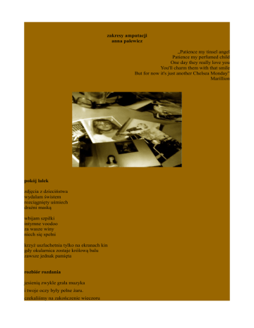 zakresy amputacji anna palewicz „Patience my tinsel angel Patience my perfumed child One day they really love you You'll charm them with that smile But for now it's just another Chelsea Monday” Marillion pokój lalek zdjęcia z dzieciństwa wydalam świstem rozciągnięty uśmiech drażni maską wbijam szpilki intymne voodoo za wasze winy niech się spełni krzyż uszlachetnia tylko na ekranach kin gdy okularnica zostaje królową balu zawsze jednak pamięta rozbiór rozdania jesienią zwykle grała muzyka i twoje oczy były pełne żaru. czekaliśmy na zakończenie wieczoru jak na początek naszej historii. mówiłeś dużo, a ja myślałam, kiedy zamkniesz mnie wykrzyknikiem. wspólny mianownik złociejących liści w zadymionym wieczorze listopada. powiedziałeś, mógłbym się w tobie zakochać. odtąd szaroburą chlapę biorę za dobrą monetę i umieram z miłości razem z końcem roku. zaklęta w deszczu spiralnie układam życie choć chciałoby się wiecznego teraz lecz to już tylko resztki z pańskiego stołu wspomnienia niewymienne na ślubną fotografię gromadkę dzieci i spacer do tesco szczyty romantyzmu twardzieli w bejsbolówkach tylko kot się łasi a jesień dobija się i dobija z wirem ostatnich liści kropla po kropli zamarzam dzielnica znów zasnęłam na prochach nad ranem, świeże bułki jak łut szczęścia przeszły koło nosa. w radio grają to samo od tygodni, to i tak, o niebo, lepiej niż u sąsiadów. kawę z mleczkiem podaję sobie sama, w małej czarnej nie mieści się mania mej wielkości. przesuwając butem buca na klatce schodowej, podążam wśród kamienic w jesiennej szarudze. sklepowe wystawy w pobliskiej galerii oglądam z nabożnością od lat bezrobotnej. zbieram żniwo chwały brzękiem szklanek i kieliszków skrzącej się przeszłości w skrzynce kilka listów, żaden z nich miłosny, na stole rachunki, popiół, sztuczne kwiaty. donikąd nie zmierzam już, bo nie mam siły, pustka z lękiem się miesza, gdy ci, co zostali, odejdą ze świata. resztki na dobranoc marzeń (których marzeń?) przerywa życie nocne spod piątki, bumtarara. jeszcze nie dziś, wytrzymam. (zima 2013) w tym domu nikt nie mieszka okiennice odbijają światło, nie zanosi się jednak na pogodę, ducha tym bardziej, więc gdyby tak zawetować porządek, choć częściej to po prostu jest burdel i oko za oko losie, któryś dostroił mnie do pieśni: ave hikikomori, wszystko marność. wysoki sądzie ten Łazarz nie będzie zbawiony, przygotuj szubienicę, skoro i tak oszczędzasz. katem będę sobie sama. na przedmieściach zegar nie wybił jutra nastrój? on - czerwień młodych ust ubierze w celebrację spojrzeń i zniknie sadza smutku na pękniętym murze zostaną apartamenty czas nada znaczenie kolejności ale na razie przeklęte starością podszewki na wszelki dopust boży zostają kobiety jak dęby spróchniałe czekaniem królestwo vanitas skłamię, gdy głowę rozedrze krzyk, nieznośny jęk zawodzących wdów. pajęcze nici rozciągnę, plotąc trzy po trzy i na krzyż dziergając znaczenia. pokażę ci sinusoidę losu. wieszczka – powiesz, wydymając usta. ja pozostanę zadumana w dwuznaczności. zmęczę cię, pamięcią wyrzeczeń i filozoficznym panta rhei. któregoś dnia odlecę. nieopodal. moje nieporadne anioły będą zdobić pokoje dzieci, a Mikołaj da papierosa podczas skromnej Wigilii. jeszcze tylko przywłaszczę sobie poezje jakiegoś mistrza i rozpocznę nowy rozdział. tylko odwilż mnie na powiekach, a kluczem słów zaplątana przeczekam do wiosny. projekcje odpalam papierosa - spróbuj zdmuchnąć płomień. zobacz, co się stanie. niepotrzebne będą usłużne zapalniczki. drże z zimna, a mówią, że złocieję z czasem, jednak tętnice nadal wabią. coraz więcej słów wycinam. tylko milczenie do ostatniej kropli. wina moja lub twoja. przegadana opowieść toczy się, gdy parkiet wiruje w głowach. to fantasmagoria z neonem młodość. powiadają zostawia rachunki. z odroczoną płatnością, nie do wyrównania przed wielkim komornikiem. to jednak potem, teraz, pracujemy na permanentną niewydolność mięśnia coraz częsciej składanego ze znaków matematycznych solo na baśnie mydlane (opublikowane jako „smyki i wiolonczele”) Akant 11/2016 kiedy szarówka zasnuwa przestrzenie, myślę nutami, łuskając znaczenia jak niedojrzałe orzechy. płomieni winorośl usta, lecz stracony weekend trwa o wiele dłużej. rozumu niespelna pół-boginka błaga – nalej do pełna i zatańcz mnie do ostatniej złotówki. odpowiadam jej echem snów, zgrzytając nad ranem goryczą zawieszonej płyty. barwy podstawowe coraz bardziej blakną. cienie przeszłości szykują się do manewrow na sumieniu, a żałobny kir coraz szczelniej otula resztki młodośni. gry zespołowe łowię zmiany kursu i wymiany płynów za garść dolarów zostawionych barmanowi a ty krążysz cały wieczór po mojej orbicie mebla dziś wyjątkowo udekorowanego widzę że masz ten styl wyprawy w nieznane zakamarki nietanich pokoi hotelowych gdzie słodkie dziewczęta spływają kroplami kradnąc po wszystkim mydełko z umywalki nad ranem płacisz rachunek złotą kartą dając na taksówkę na otarcie łez monopol nie wchodzi w grę lecz koncesja byłaby do załatwienia jedną ręką skiniesz i bierzesz co twoje i co się nawija więc nawijasz i owijasz całkiem nieźle aż wielkookie siksy zapominają że miały wrócić o 22 i odrobić lekcje być może ty również odrobisz dziś swoją czarną polewkę zlizując z mych ust odbitki i ołtarze wolę osobno każdy w swoją stronę i delete na drogę, choć częściej chciałoby się z czapki, ale cóż robić w epoce techno(nie)logicznej będąc kobietą drugiej świeżości nie zaproszę cię na wino choć jak wino ponoć starzeją się te nieładne oj nieładnie śmiać się się z pierwszoligowych diw koleżanek od kieliszka do kieliszka przecież męża znalazły pomiędzy łóżkami więc śmiej się gł