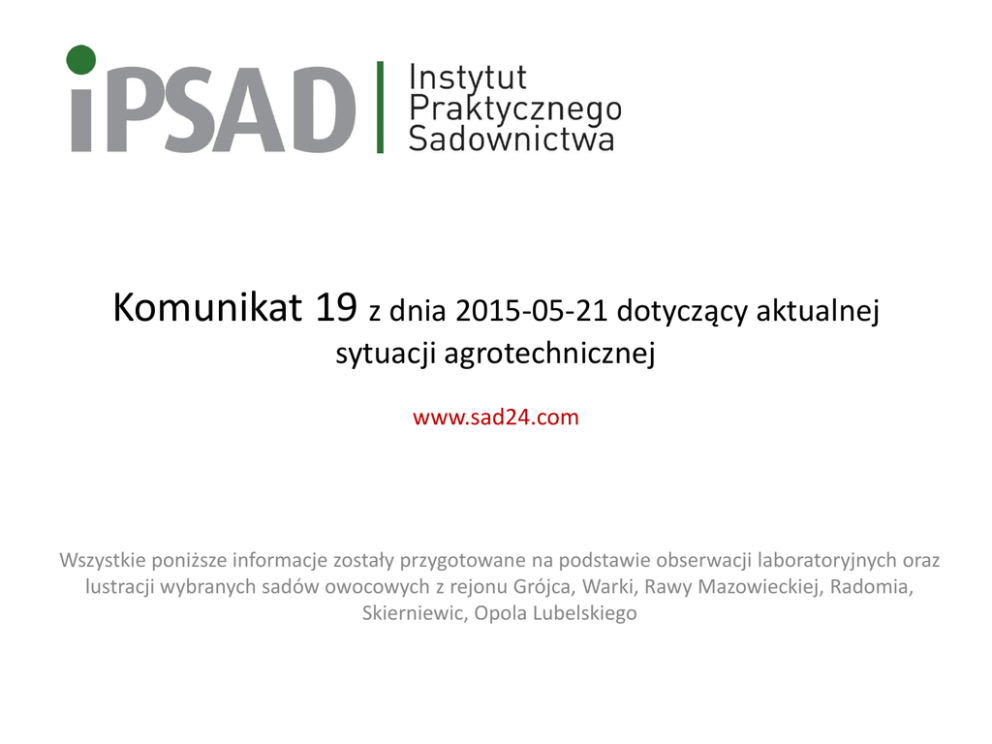 Komunikat 19 z dnia 2015-05-21 dotyczący aktualnej sytuacji agrotechnicznej www.sad24.com Wszystkie poniższe informacje zostały przygotowane na podstawie obserwacji laboratoryjnych oraz lustracji wybranych sadów owocowych z rejonu Grójca, Warki, Rawy Mazowieckiej, Radomia, Skierniewic, Opola Lubelskiego Prawie we wszystkich rejonach opady doprowadziły do wysiewów zarodników workowych. Tam, gdzie ilość pozostałych jeszcze zarodników była większa, lub występują plamy parcha, infekcje były silniejsze. W niektórych lokalizacjach infekcja osiągnęła wartość 900 RIM, co wymaga bezwzględnego zastosowanie produktów interwencyjnych (Goliany, Borek, Dobiecin i inne). W pozostałych regionach, gdzie infekcja jest na poziomie 500-800 RIM, również zalecamy wykonanie zabiegu produktem o działaniu interwencyjnym. Ze względu na dodatkową ochronę przed zgnilizna gniazda nasiennego i rakiem drew owocowych (regiony gdzie wystąpił grad), polecamy jeden z produktów opartych na tebukonazolu. Oczywiście przed kolejnymi opadami wszędzie powinniśmy odnowić ochronę zapobiegawczą stosując jeden z produktów kontaktowych (kaptan, Delan, mancozeb), ewentualnie (przy infekcjach na poziomie 300-400 RIM) w mieszaninie z produktami strobilurynowymi. INFEKCJA SŁABA (bez plam parcha) bez gradu mancozeb lub kaptan INFEKCJA ŚREDNIA lub infekcja słaba, a występują plamy parcha grad bez gradu grad kaptan, (mancozeb lub kaptan + tebu, gdy grad uszkodził gdy grad uszkodził kaptan lub korę dodajemy korę dodajemy do Delan) + strobi. mieszaniny tebu+Topsin. Gdy występuje Topsin. Gdy grad nie odporność na uszkodził kory Gdy grad nie uszkodził kory, dodajemy Chorus strobi, zamiast dodajemy do lub Mythos strobi tebu. mieszaniny INFEKCJA SILNA lub infekcja słaba/średnia, a występują plamy parcha bez gradu grad Delan + (Score kaptan + tebu, gdy grad uszkodził lub tebu) Chorus/Mythos Chorus/Mythos korę dodajemy do mieszaniny Topsin. Gdy grad nie uszkodził kory, dodajemy do mieszaniny UWAGI: 1. Tebukonazol dodatkowo zwalcza zgniliznę gniazda nasiennego 2. Mancozeb zwalcza dodatkowo opadzinę liści (nekrotyczna plamistości liści na Goldenie, Gali) 3. Należy liczyć się z możliwością występowania odporności na preparaty strobilurynowe 4. Anilinopirymidyny (Mythos, Chorus), słabo zwalczają parcha na zawiązkach 5. Stosujac Topsin należy liczyć się z wystąpieniem pozostałości w owocach 6. W przypadku występowania zarodnikujących plam, poziom zagrożenia infekcyjnego znacznie wzrasta 7. Dodatek do fungicydów kontaktowych preparatu Protector, istotnie zwiększa ich odporność na zmywanie W kilku rejonach spadł grad uszkadzając zawiązki, liście, a nawet korę drzew. Po gradobiciu wzrasta zagrożenie zwłaszcza ze strony raka drzew owocowych (Nectria galligena powoduje choroby kory, może porażać uszkodzone zawiązki). Uszkodzone zawiązki może zaatakować również szara pleśń. Uszkodzone liście i młode przyrosty zaczynają intensywnie produkować etylen, a to prowadzi zwykle do silniejszego opadu czerwcowego. Efekt nadmiernego produkowania etylenu przez uszkodzone zawiązki, liście i młode pędy można zredukować stosując Regalis w dawce 0,3-0,5kg/ha. Jeśli regulator ten był już stosowany, zabieg taki nie jest konieczny. Dla szybszej regeneracji drzew, w celu osłabienia opadu zawiązków, gdy wzrośnie temperatura, można wykonać zabieg produktem zawierającym gibereliny – 0,5l/ha gib1% (zachować kilkudniowy odstęp od zabiegów Regalisem). Przez najbliższe dni nie stosować nawozów dolistnych. Po tygodniu można rozpocząć nawożenie jedynie mocznikiem. Po kolejnych kilku dniach można używać już pozostałe nawozy. W przypadku wystąpienia uszkodzeń gradowych, należy wykonać zabieg preparatem opartym na kaptanie, w dawce rekomendowanej do zwalczania parcha jabłoni lub nieco wyższej. W przypadku niewielkich uszkodzeń ochroni on zawiązki przed szarą pleśnią czy brunatną zgnilizną. Na odmiany wrażliwe na ww. choroby, lub gdy została uszkodzona skórka owoców, można do kaptanu dodać cyprodynil (Chorus). Niestety wymienione preparaty nie chronią skutecznie przed chorobami kory. To można wprawdzie zastosować Topsin, ale należy liczyć się z pozostałościami karbendazymu w owocach. Dobre wyniki lecznicze na owocach wykazują Signum i Bellis. Dobre efekty w zwalczaniu grzyba wywołującego raka drzew owocowych (Nectria galligena), wykazują preparaty oparte na tebukonazolu. Zabieg takim preparatem będzie chronił również przed zgnilizna gniada nasiennego, a poinfekcyjnie przed parchem jabłoni. PROGRAM NAWOŻENIA DOLISTNEGO JABŁONI w sezonie 2015, część druga: wzrost zawiązków-wzrost owoców Faza rozwojowa Uwagi agrotechniczne Produkt 1: MAP Produkt 2: Azot Produkt 3: Zn/Mg Produkt 4: Bor/Mangan Dawka na 1000 l wody Dawka na hektar dla drzew o wysokości 2,5m Dawka na hektar dla drzew o wysokości 2,5m Dawka na hektar dla drzew o wysokości 2,5m mocznik 4kg/ha lub cynk 0,2kg/ha Mantrac 0,7l/ha to odpowiada: Polyram lub Antrcol 1,0kg/ha, lub 0,4kg/metr wys. drzewa/ha Zintrac 0,3litr/ha lub 0,12litr/metr wys. drzewa/ha lub 0,28l/metr wysokości drzewa/ha siarczan magnezu 7H2O Solubor 1,0kg/ha Przy dawce 350-400l wody/ha II-III tydzień po kwitnieniu Czynnikiem precyzującym termin zabiegu jest temperatura, która podczas aplikacji powinna wynosić 120C-240C III-IV tydzień po kwitnieniu Czynnikiem precyzującym termin zabiegu jest temperatura, która podczas aplikacji powinna wynosić 120C-240C MAP 4,0kg/1tys.litr. wody Bufor. Umożliwia bezpieczne mieszanie substancji. Stabilizuje pH roztworu na poziomie 4,2 - 6,0, wartości optymalnej dla szybkiego pobierania substancji przez liście MAP 4,0kg/1tys.litr. wody Bufor. Umożliwia bezpieczne mieszanie substancji. Stabilizuje pH roztworu na poziomie 4,2 - 6,0, wartości optymalnej dla szybkiego pobierania substancji przez liście V tydzień po kwitnieniu MAP Czyn