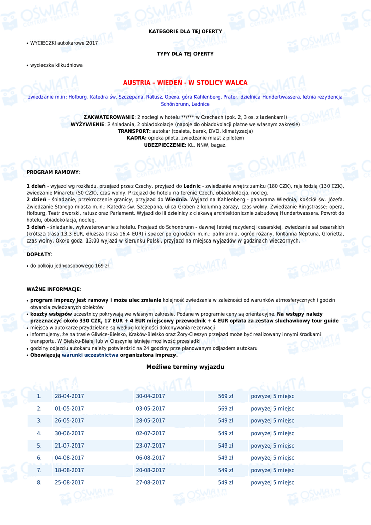 KATEGORIE DLA TEJ OFERTY ● WYCIECZKI autokarowe 2017 TYPY DLA TEJ OFERTY ● wycieczka kilkudniowa AUSTRIA - WIEDEŃ - W STOLICY WALCA zwiedzanie m.in: Hofburg, Katedra św. Szczepana, Ratusz, Opera, góra Kahlenberg, Prater, dzielnica Hundertwassera, letnia rezydencja Schőnbrunn, Lednice ZAKWATEROWANIE: 2 noclegi w hotelu **/*** w Czechach (pok. 2, 3 os. z łazienkami) WYŻYWIENIE: 2 śniadania, 2 obiadokolacje (napoje do obiadokolacji płatne we własnym zakresie) TRANSPORT: autokar (toaleta, barek, DVD, klimatyzacja) KADRA: opieka pilota, zwiedzanie miast z pilotem UBEZPIECZENIE: KL, NNW, bagaż. PROGRAM RAMOWY: 1 dzień - wyjazd wg rozkładu, przejazd przez Czechy, przyjazd do Lednic - zwiedzanie wnętrz zamku (180 CZK), rejs łodzią (130 CZK), zwiedzanie Minaretu (50 CZK), czas wolny. Przejazd do hotelu na terenie Czech, obiadokolacja, nocleg. 2 dzień - śniadanie, przekroczenie granicy, przyjazd do Wiednia. Wyjazd na Kahlenberg - panorama Wiednia, Kościół św. Józefa. Zwiedzanie Starego miasta m.in.: Katedra św. Szczepana, ulica Graben z kolumną zarazy, czas wolny. Zwiedzanie Ringstrasse: opera, Hofburg, Teatr dworski, ratusz oraz Parlament. Wyjazd do III dzielnicy z ciekawą architektonicznie zabudową Hundertwassera. Powrót do hotelu, obiadokolacja, nocleg. 3 dzień - śniadanie, wykwaterowanie z hotelu. Przejazd do Schonbrunn - dawnej letniej rezydencji cesarskiej, zwiedzanie sal cesarskich (krótsza trasa 13,3 EUR, dłuższa trasa 16,4 EUR) i spacer po ogrodach m.in.: palmiarnia, ogród różany, fontanna Neptuna, Glorietta, czas wolny. Około godz. 13:00 wyjazd w kierunku Polski, przyjazd na miejsca wyjazdów w godzinach wieczornych. DOPŁATY: ● do pokoju jednoosobowego 169 zł. WAŻNE INFORMACJE: ● ● ● ● ● ● program imprezy jest ramowy i może ulec zmianie kolejność zwiedzania w zależności od warunków atmosferycznych i godzin otwarcia zwiedzanych obiektów koszty wstępów uczestnicy pokrywają we własnym zakresie. Podane w programie ceny są orientacyjne. Na wstępy należy przeznaczyć około 330 CZK, 17 EUR + 4 EUR miejscowy przewodnik + 4 EUR opłata za zestaw słuchawkowy tour guide miejsca w autokarze przydzielane są według kolejności dokonywania rezerwacji informujemy, że na trasie Gliwice-Bielsko, Kraków-Bielsko oraz Żory-Cieszyn przejazd może być realizowany innymi środkami transportu. W Bielsku-Białej lub w Cieszynie istnieje możliwość przesiadki godziny odjazdu autokaru należy potwierdzić na 24 godziny prze planowanym odjazdem autokaru Obowiązują warunki uczestnictwa organizatora imprezy. Możliwe terminy wyjazdu Lp. Data początku Data końca Cena Wolne miejsca 1. 28-04-2017 30-04-2017 569 zł powyżej 5 miejsc 2. 01-05-2017 03-05-2017 569 zł powyżej 5 miejsc 3. 26-05-2017 28-05-2017 549 zł powyżej 5 miejsc 4. 30-06-2017 02-07-2017 549 zł powyżej 5 miejsc 5. 21-07-2017 23-07-2017 549 zł powyżej 5 miejsc 6. 04-08-2017 06-08-2017 549 zł powyżej 5 miejsc 7. 18-08-2017 20-08-2017 549 zł powyżej 5 miejsc 8. 25-08-2017 27-08-2017 549 zł powyżej 5 miejsc Lp. Data początku Data końca Cena Wolne miejsca 9. 29-09-2017 01-10-2017 549 zł powyżej 5 miejsc 10. 13-10-2017 15-10-2017 549 zł powyżej 5 miejsc 11. 10-11-2017 12-11-2017 549 zł powyżej 5 miejsc Możliwe miejsca wyjazdu Lp. Miasto Adres Dopłata Wyjazd 1. Katowice CH U Belga, ul.Przemysłowa 3 /stacja SHELL +0 zł 07:00 2. Kraków ul. Kałuży za hotelem CRACOVIA +0 zł 06.00 3. Bielsko-Biała Dworzec PKS (dolny plac) +0 zł 08:30 4. Bytom Pl. Wolskiego za stacją paliw BLISKA +0 zł 06:20 5. Gliwice Pl. Piastów obok sklepu PIAST +0 zł 05:40 6. Kęty Dworzec PKS +0 zł 07:40 7. Wadowice Dworzec PKP +0 zł 07:00 8. Zabrze Parking obok C.H. Kaufland ul. Korfantego 5 +0 zł 06:00