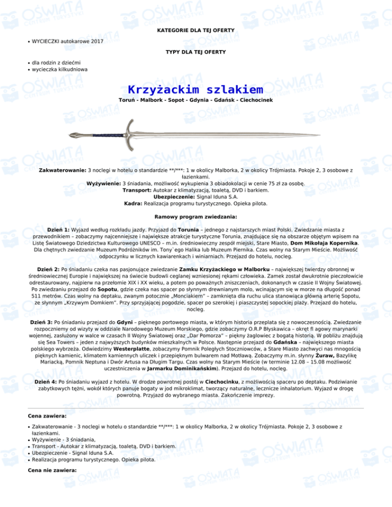 KATEGORIE DLA TEJ OFERTY ● WYCIECZKI autokarowe 2017 TYPY DLA TEJ OFERTY ● ● dla rodzin z dziećmi wycieczka kilkudniowa Krzyżackim szlakiem Toruń - Malbork - Sopot - Gdynia - Gdańsk - Ciechocinek Zakwaterowanie: 3 noclegi w hotelu o standardzie **/***: 1 w okolicy Malborka, 2 w okolicy Trójmiasta. Pokoje 2, 3 osobowe z łazienkami. Wyżywienie: 3 śniadania, możliwość wykupienia 3 obiadokolacji w cenie 75 zł za osobę. Transport: Autokar z klimatyzacją, toaletą, DVD i barkiem. Ubezpieczenie: Signal Iduna S.A. Kadra: Realizacja programu turystycznego. Opieka pilota. Ramowy program zwiedzania: Dzień 1: Wyjazd według rozkładu jazdy. Przyjazd do Torunia – jednego z najstarszych miast Polski. Zwiedzanie miasta z przewodnikiem – zobaczymy najcenniejsze i największe atrakcje turystyczne Torunia, znajdujące się na obszarze objętym wpisem na Listę Światowego Dziedzictwa Kulturowego UNESCO – m.in. średniowieczny zespół miejski, Stare Miasto, Dom Mikołaja Kopernika. Dla chętnych zwiedzanie Muzeum Podróżników im. Tony`ego Halika lub Muzeum Piernika. Czas wolny na Starym Mieście. Możliwość odpoczynku w licznych kawiarenkach i winiarniach. Przejazd do hotelu, nocleg. Dzień 2: Po śniadaniu czeka nas pasjonujące zwiedzanie Zamku Krzyżackiego w Malborku – największej twierdzy obronnej w średniowiecznej Europie i największej na świecie budowli ceglanej wzniesionej rękami człowieka. Zamek został dwukrotnie pieczołowicie odrestaurowany, najpierw na przełomie XIX i XX wieku, a potem po poważnych zniszczeniach, dokonanych w czasie II Wojny Światowej. Po zwiedzaniu przejazd do Sopotu, gdzie czeka nas spacer po słynnym drewnianym molo, wcinającym się w morze na długość ponad 511 metrów. Czas wolny na deptaku, zwanym potocznie „Monciakiem” – zamknięta dla ruchu ulica stanowiąca główną arterię Sopotu, ze słynnym „Krzywym Domkiem”. Przy sprzyjającej pogodzie, spacer po szerokiej i piaszczystej sopockiej plaży. Przejazd do hotelu, nocleg. Dzień 3: Po śniadaniu przejazd do Gdyni – pięknego portowego miasta, w którym historia przeplata się z nowoczesnością. Zwiedzanie rozpoczniemy od wizyty w oddziale Narodowego Muzeum Morskiego, gdzie zobaczymy O.R.P Błyskawica – okręt fl agowy marynarki wojennej, zasłużony w walce w czasach II Wojny Światowej oraz „Dar Pomorza” – piękny żaglowiec z bogatą historią. W pobliżu znajdują się Sea Towers – jeden z najwyższych budynków mieszkalnych w Polsce. Następnie przejazd do Gdańska – największego miasta polskiego wybrzeża. Odwiedzimy Westerplatte, zobaczymy Pomnik Poległych Stoczniowców, a Stare Miasto zachwyci nas mnogością pięknych kamienic, klimatem kamiennych uliczek i przepięknym bulwarem nad Motławą. Zobaczymy m.in. słynny Żuraw, Bazylikę Mariacką, Pomnik Neptuna i Dwór Artusa na Długim Targu. Czas wolny na Starym Mieście (w terminie 12.08 – 15.08 możliwość uczestniczenia w Jarmarku Dominikańskim). Przejazd do hotelu, nocleg. Dzień 4: Po śniadaniu wyjazd z hotelu. W drodze powrotnej postój w Ciechocinku, z możliwością spaceru po deptaku. Podziwianie zabytkowych tężni, wokół których panuje bogaty w jod mikroklimat, tworzący naturalne, lecznicze inhalatorium. Wyjazd w drogę powrotną. Przyjazd do wybranego miasta. Zakończenie imprezy. Cena zawiera: ● ● ● ● ● Zakwaterowanie - 3 noclegi w hotelu o standardzie **/***: 1 w okolicy Malborka, 2 w okolicy Trójmiasta. Pokoje 2, 3 osobowe z łazienkami. Wyżywienie - 3 śniadania, Transport - Autokar z klimatyzacją, toaletą, DVD i barkiem. Ubezpieczenie - Signal Iduna S.A. Realizacja programu turystycznego. Opieka pilota. Cena nie zawiera: ● ● ● ● ● możliwość wykupienia 3 obiadokolacji w cenie 75 zł za osobę. kosztów realizacji programu turystycznego (wstępy, przewodnicy lokalni, system Alma Tour Guide), orientacyjny koszt: ok. 135 zł, programu fakultatywnego: Toruń - Muzeum Tony Halika ok. 9 zł, Toruń - Żywe Muzeum Piernika ok. 12 zł, opłat za pozostałe posiłki nie ujęte w programie, opłat za dojazdy z wybranych miejscowości, podanych w rozkładzie jazdy. Informacje praktyczne: ● ● ● ● ● ● Pilot rozlicza się z grupą z pobranych kwot na realizację programu. Koszty płacone za całą grupę (np. za lokalnych przewodników) są dzielone na wszystkich jej uczestników. Pilot nie oprowadza po obiektach muzealnych i centrach historycznych. Kolejność realizacji programu może ulec zmianie. Przejazd: Katowice - Toruń (ok. 370 km) - ok. 5,5 godz. Warunki uczestnictwa i Informacje dodatkowe Możliwe terminy wyjazdu Lp. Data początku Data końca Cena Wolne miejsca 1. 22-06-2017 25-06-2017 799 zł powyżej 5 miejsc 2. 12-08-2017 15-08-2017 799 zł powyżej 5 miejsc 3. 31-08-2017 03-09-2017 799 zł powyżej 5 miejsc Możliwe miejsca wyjazdu Lp. Miasto Adres 1. Katowice ul. Piotra Skargi 4, Dworzec Autobusowy, stanowiska 1-4 (obok Supersamu) 2. Kraków 3. Dopłata Wyjazd +130 zł 07:00 ul. Reymonta 22, parking dla autokarów przed wejściem na stadion Wisły (od ul. Reymonta) +150 zł 05:30 Opole ul. Dubois 9, parking na rogu ulic Dubois i 1 Maja (wjazd od ulicy Dubois) +150 zł 05:00 4. Wrocław ul. Joannitów 13, Tymczasowy Dworzec Autobusowy (za budynkiem dyrekcji PKP), stanowiska 12,13 +150 zł 03:30 5. Łódź al. Włókniarzy 227, Dworzec PKS Łódź Kaliska, przy stanowiskach 4,5,6 (wjazd od ulicy Karolewskiej) +80 zł 10:30
