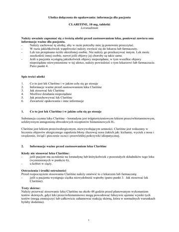Ulotka dołączona do opakowania: informacja dla pacjenta CLARITINE, 10 mg, tabletki Loratadinum Należy uważnie zapoznać się z treścią ulotki przed zastosowaniem leku, ponieważ zawiera ona informacje ważne dla pacjenta. Należy zachować tę ulotkę, aby w razie potrzeby móc ją ponownie przeczytać. W razie jakichkolwiek wątpliwości należy zwrócić się do lekarza lub farmaceuty. Lek ten przepisano ściśle określonej osobie. Nie należy go przekazywać innym. Lek może zaszkodzić innej osobie, nawet jeśli objawy jej choroby są takie same. Jeśli u pacjenta wystąpią jakiekolwiek objawy niepożądane, w tym wszelkie objawy niepożądane niewymienione w tej ulotce, należy powiedzieć o tym lekarzowi lub farmaceucie. Patrz punkt 4. Spis treści ulotki 1. 2. 3. 4. 5. 6. Co to jest lek Claritine i w jakim celu się go stosuje Informacje ważne przed zastosowaniem leku Claritine Jak stosować lek Claritine Możliwe działania niepożądane Jak przechowywać lek Claritine Zawartość opakowania i inne informacje 1. Co to jest lek Claritine i w jakim celu się go stosuje Substancja czynna leku Claritine - loratadyna jest trójpierścieniowym lekiem przeciwhistaminowym, selektywnym antagonistą obwodowych receptorów histaminowych H1. Claritine jest lekiem przeciwalergicznym, niewywołującym senności. Claritine jest wskazany w leczeniu objawów alergicznego zapalenia błony śluzowej nosa (takich jak: kichanie, wyciek z nosa i swędzenie, świąd i pieczenie oczu) i przewlekłej pokrzywki idiopatycznej. 2. Informacje ważne przed zastosowaniem leku Claritine Kiedy nie stosować leku Claritine: jeśli pacjent ma uczulenie na loratadynę lub którykolwiek z pozostałych składników tego leku (wymienionych w punkcie 6), u kobiet w ciąży. Ostrzeżenia i środki ostrożności Przed rozpoczęciem stosowania Claritine należy omówić to z lekarzem lub farmaceutą: jeśli u pacjenta występuje ciężka niewydolność wątroby (patrz punkt 3. Jak stosować lek Claritine). Testy skórne: Należy przerwać stosowanie leku Claritine na około 48 godzin przed planowanym wykonaniem testów skórnych, gdyż leki przeciwhistaminowe mogą powodować fałszywie ujemne wyniki tych testów (mogą zmniejszyć lub całkowicie zahamować reakcję skórną, która w normalnych warunkach byłaby dodatnia). 1 Claritine a inne leki Działania niepożądane mogą nasilać się podczas jednoczesnego stosowania Claritine z lekami wpływającymi na działanie niektórych enzymów odpowiedzialnych za metabolizm leków w wątrobie. Jednak, w badaniach klinicznych nie obserwowano nasilenia działań niepożądanych podczas stosowania loratadyny z lekami wpływającymi na działanie tych enzymów. Jednoczesne podawanie loratadyny z ketokonazolem, erytromycyną lub cymetydyną powoduje zwiększenie stężenia loratadyny w osoczu, ale bez następstw klinicznych. Równoczesne stosowanie z loratadyną leków wpływających na metabolizm wątrobowy powinno odbywać się pod kontrolą lekarza. Należy powiedzieć lekarzowi lub farmaceucie o wszystkich lekach stosowanych przez pacjenta obecnie lub ostatnio, a także o lekach, które pacjent planuje stosować. Dotyczy to również leków wydawanych bez recepty. Claritine z jedzeniem, piciem i alkoholem Lek można przyjmować niezależnie od posiłków. W przeprowadzonych testach psychomotorycznych alkohol nie nasila działania loratadyny. Ciąża i karmienie piersią Jeśli pacjentka jest w ciąży lub karmi piersią, przypuszcza że może być w ciąży lub gdy planuje mieć dziecko, powinna poradzić się lekarza lub farmaceuty przed zastosowaniem tego leku. W celu zachowania ostrożności zaleca się unikanie stosowania produktu Claritine w okresie ciąży. Loratadyna przenika do mleka matki, dlatego nie zaleca się stosowania leku w okresie karmienia piersią. Prowadzenie pojazdów i obsługiwanie maszyn W badaniach klinicznych, których celem była ocena zdolności do prowadzenia pojazdów loratadyna nie powodowała upośledzenia. U niektórych osób bardzo rzadko występowała senność, która mogła upośledzać zdolność do prowadzenia pojazdów i obsługiwania maszyn. Lek Claritine zawiera laktozę. Lek zawiera jako substancję pomocniczą laktozę. Jeżeli stwierdzono wcześniej u pacjenta nietolerancję niektórych cukrów, pacjent powinien skontaktować się z lekarzem przed przyjęciem leku. 3. Jak stosować lek Claritine Ten lek należy zawsze stosować zgodnie z zaleceniami lekarza. W razie wątpliwości należy zwrócić się do lekarza. Linia podziału na tabletce tylko ułatwia jej rozkruszenie w celu łatwiejszego połknięcia. Zalecana dawka Dorośli i dzieci w wieku powyżej 12 lat: 10 mg (jedna tabletka) raz na dobę. Lek można przyjmować niezależnie od posiłków. Dzieci w wieku od 2 do 12 lat: Masa ciała większa niż 30 kg: 10 mg (jedna tabletka) raz na dobę. Nie jest wskazane stosowanie tabletek (10 mg) u dzieci, których masa ciała jest mniejsza niż 30 kg. U tych dzieci można stosować Claritine w postaci syropu. Nie ustalono bezpieczeństwa i skuteczności stosowania leku u dzieci w wieku poniżej 2 lat. 2 Pacjenci z zaburzeniami czynności wątroby: U pacjentów z ciężką niewydolnością wątroby należy zastosować mniejszą dawkę początkową, ponieważ klirens loratadyny u tych osób może być zmniejszony. W takich przypadkach, dorosłym i dzieciom o masie ciała większej niż 30 kg należy podawać 10 mg loratadyny (w postaci tabletek lub syropu), co drugi dzień, a dzieciom o masie ciała 30 kg lub mniejszej - 5 mg loratadyny (w postaci syropu), co drugi dzień. Nie ma konieczności zmiany dawki u pacjentów w podeszłym wieku i pacjentów z niewydolnością nerek. W przypadku wrażenia, że działanie leku Claritine jest za mocne lub za słabe, należy zwrócić się do lekarza. Zastosowanie większej niż zalecana dawki leku Claritine W razie przyjęcia większej niż zalecana dawki leku Claritine, należy niez