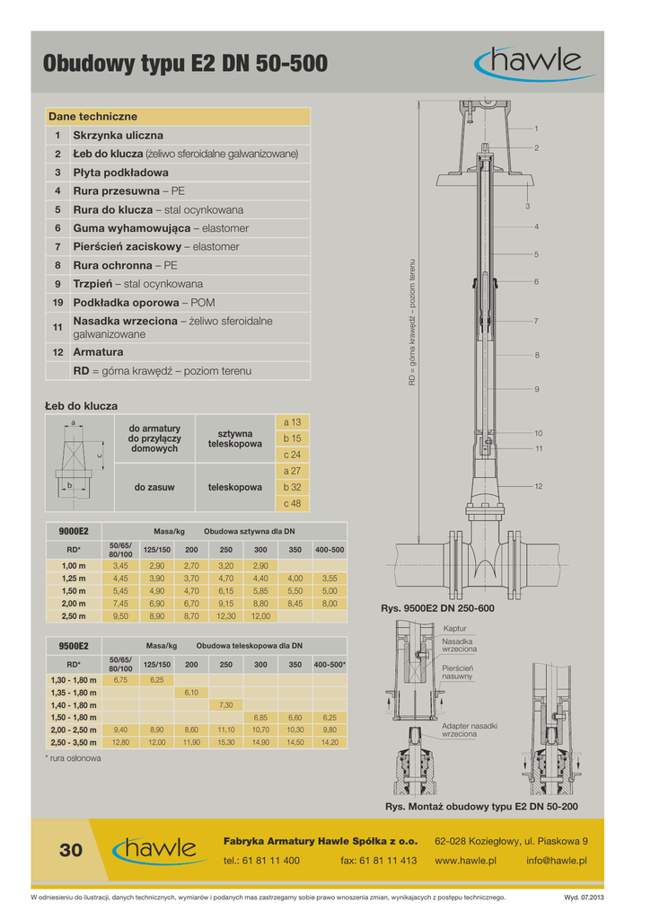 Obudowy typu E2 DN 50-500 Dane techniczne 1 1 Skrzynka uliczna 2 Łeb do klucza (żeliwo sferoidalne galwanizowane) 3 Płyta podkładowa 4 Rura przesuwna – PE 5 Rura do klucza – stal ocynkowana 6 Guma wyhamowująca – elastomer 7 Pierścień zaciskowy – elastomer 8 Rura ochronna – PE 9 Trzpień – stal ocynkowana 19 Podkładka oporowa – POM 11 Nasadka wrzeciona – żeliwo sferoidalne galwanizowane 12 Armatura 2 3 4 RD = górna krawędź – poziom terenu 5 RD = górna krawędź – poziom terenu 6 7 8 9 Łeb do klucza a do armatury do przyłączy domowych c sztywna teleskopowa a 13 10 b 15 11 c 24 a 27 b do zasuw teleskopowa b 32 12 c 48 9000E2 Masa/kg Obudowa sztywna dla DN RD* 50/65/ 80/100 125/150 200 250 300 1,00 m 3,45 2,90 2,70 3,20 2,90 1,25 m 4,45 3,90 3,70 4,70 1,50 m 5,45 4,90 4,70 6,15 2,00 m 7,45 6,90 6,70 2,50 m 9,50 8,90 8,70 350 400-500 4,40 4,00 3,55 5,85 5,50 5,00 9,15 8,80 8,45 8,00 12,30 12,00 Rys. 9500E2 DN 250-600 Kaptur 9500E2 RD* 1,30 - 1,80 m 1,35 - 1,80 m 1,40 - 1,80 m 1,50 - 1,80 m 2,00 - 2,50 m 2,50 - 3,50 m Masa/kg 50/65/ 80/100 6,75 125/150 Nasadka wrzeciona Obudowa teleskopowa dla DN 200 250 300 350 400-500* Pierścień nasuwny 6,25 6,10 7,30 6,85 6,60 6,25 9,40 8,90 8,60 11,10 10,70 10,30 9,80 12,80 12,00 11,90 15,30 14,90 14,50 14,20 Adapter nasadki wrzeciona * rura osłonowa Rys. Montaż obudowy typu E2 DN 50-200 30 Fabryka Armatury Hawle Spółka z o.o. 62-028 Koziegłowy, ul. Piaskowa 9 tel.: 61 81 11 400 www.hawle.pl fax: 61 81 11 413 W odniesieniu do ilustracji, danych technicznych, wymiarów i podanych mas zastrzegamy sobie prawo wnoszenia zmian, wynikajacych z postępu technicznego. [email protected] Wyd. 07.2013 Obudowy typu E2 DN 50-500 do zasuw typu E2 DN 50-200 Cechy konstrukcyjne • Wszystkie obudowy (sztywne i teleskopowe) poszczególnych typów i średnic są zabezpieczone przed dostaniem się zanieczyszczeń i wody powierzchniowej • Obudowa teleskopowa umożliwia dokładne zrównanie pokrywy skrzynki z powierzchnią terenu dzięki rozsuwaniu lub wsuwaniu rur teleskopowych i trzpienia • Wszystkie pionowe naciski przejmuje konstrukcja teleskopu, przez co unika się uszkodzeń rury i armatury • Jedna obudowa dla kilku średnic • Kaptur ochronny ze integrowanym mechanizmem blokującym • Zbędne dodatkowe mocowanie (śruba/kołek) • Dostępne z lub bez skrzynki ulicznej i płyty podkładowej Nr kat. 9000E2 9500E2 Głębokość zabudowy Wykonanie sztywna teleskopowa Średnica nominalna/DN 50/65/80/100 125/150 200 1,00 m 1,25 m 1,50 m 2,00 m 2,50 m 1,30 - 1,80 m 1,35 - 1,80 m 2,00 - 2,50 m 2,50 - 3,50 m sztywna teleskopowa sztywna teleskopowa Przedłużenie do obudowy „sztywnej” Nr kat. 7830 cena za 1 m Nr kat. 7831 cena za każde kolejne 0,5 m Przy zamówieniu należy podać nr kat., DN zasuwy i głębokość zabudowy RD do zasuw typu E2 DN 250-500 Nr kat. Wykonanie 9000E2 sztywna 9500E2 teleskopowa Głębokość zabudowy 250 Średnica nominalna/DN 300 350 400-500* 1,00 m 1,25 m 1,50 m 2,00 m 2,50 m 1,40 - 1,80 m 1,50 - 1,80 m 2,00 - 2,50 m 2,50 - 3,50 m * korpus DN 400, z przyłączem kołnierzowym DN 500 Wyd. 07.2013 Fabryka Armatury Hawle Spółka z o.o. 62-028 Koziegłowy, ul. Piaskowa 9 tel.: 61 81 11 400 www.hawle.pl fax: 61 81 11 413 [email protected] 31 W odniesieniu do ilustracji, danych technicznych, wymiarów i podanych mas zastrzegamy sobie prawo wnoszenia zmian, wynikajacych z postępu technicznego. Obudowy DN ¾′′-2′′ do armatury do przyłączy domowych z połączeniem śrubowym Nr kat. Wykonanie 9101 sztywna 9601 teleskopowa Głębokość zabudowy 0,75 m 1,00 m 1,25 m 1,50 m 2,00 m 2,50 m 0,60 - 0,80 m 0,80 - 1,20 m 1,30 - 1,80 m 2,00 - 2,50 m 2,50 - 3,50 m Przedłużenie do obudowy „sztywnej” Nr kat. 7830 – cena za 1m Nr kat. 7831 – cena za każde kolejne 0,5 m Przy zamówieniu należy podać nr kat., DN zasuwy i głębokość zabudowy RD sztywna teleskopowa Zabezpieczenie przed przekręceniem zasuwy nr kat. 7839 – (wersja standardowa) 32 Fabryka Armatury Hawle Spółka z o.o. 62-028 Koziegłowy, ul. Piaskowa 9 tel.: 61 81 11 400 www.hawle.pl fax: 61 81 11 413 W odniesieniu do ilustracji, danych technicznych, wymiarów i podanych mas zastrzegamy sobie prawo wnoszenia zmian, wynikajacych z postępu technicznego. [email protected] Wyd. 07.2013