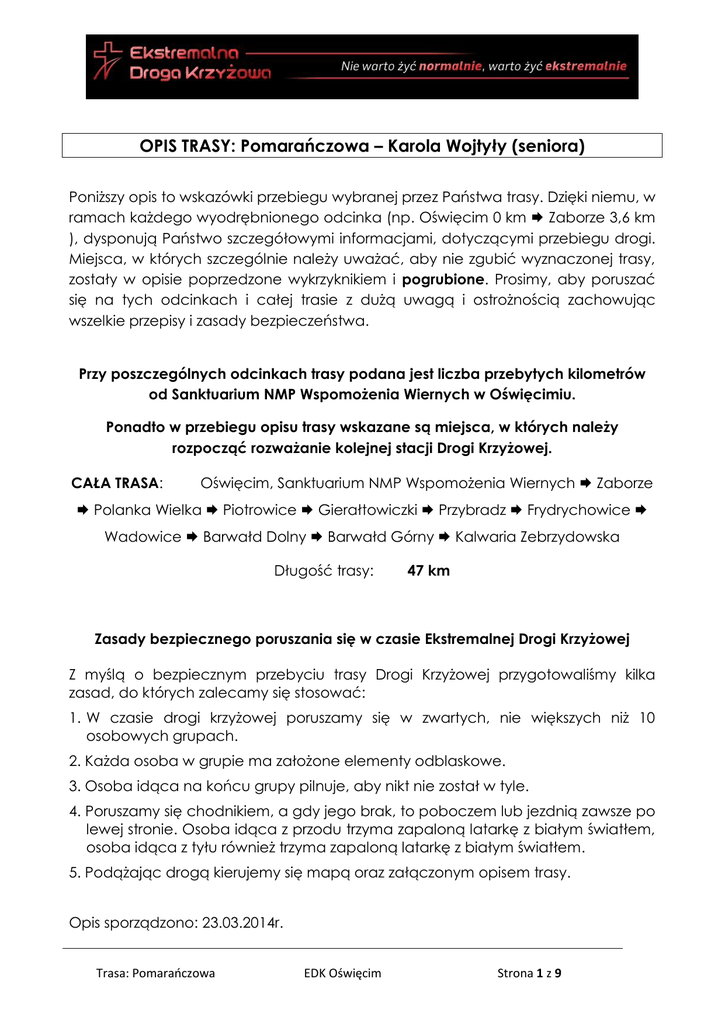 OPIS TRASY: Pomarańczowa – Karola Wojtyły (seniora) Poniższy opis to wskazówki przebiegu wybranej przez Państwa trasy. Dzięki niemu, w ramach każdego wyodrębnionego odcinka (np. Oświęcim 0 km Zaborze 3,6 km ), dysponują Państwo szczegółowymi informacjami, dotyczącymi przebiegu drogi. Miejsca, w których szczególnie należy uważać, aby nie zgubić wyznaczonej trasy, zostały w opisie poprzedzone wykrzyknikiem i pogrubione. Prosimy, aby poruszać się na tych odcinkach i całej trasie z dużą uwagą i ostrożnością zachowując wszelkie przepisy i zasady bezpieczeństwa. Przy poszczególnych odcinkach trasy podana jest liczba przebytych kilometrów od Sanktuarium NMP Wspomożenia Wiernych w Oświęcimiu. Ponadto w przebiegu opisu trasy wskazane są miejsca, w których należy rozpocząć rozważanie kolejnej stacji Drogi Krzyżowej. CAŁA TRASA: Oświęcim, Sanktuarium NMP Wspomożenia Wiernych Zaborze Polanka Wielka Piotrowice Gierałtowiczki Przybradz Frydrychowice Wadowice Barwałd Dolny Barwałd Górny Kalwaria Zebrzydowska Długość trasy: 47 km Zasady bezpiecznego poruszania się w czasie Ekstremalnej Drogi Krzyżowej Z myślą o bezpiecznym przebyciu trasy Drogi Krzyżowej przygotowaliśmy kilka zasad, do których zalecamy się stosować: 1. W czasie drogi krzyżowej poruszamy się w zwartych, nie większych niż 10 osobowych grupach. 2. Każda osoba w grupie ma założone elementy odblaskowe. 3. Osoba idąca na końcu grupy pilnuje, aby nikt nie został w tyle. 4. Poruszamy się chodnikiem, a gdy jego brak, to poboczem lub jezdnią zawsze po lewej stronie. Osoba idąca z przodu trzyma zapaloną latarkę z białym światłem, osoba idąca z tyłu również trzyma zapaloną latarkę z białym światłem. 5. Podążając drogą kierujemy się mapą oraz załączonym opisem trasy. Opis sporządzono: 23.03.2014r. Trasa: Pomarańczowa EDK Oświęcim Strona 1 z 9 POSZCZEGÓLNE ODCINKI TRASY Oświęcim 0 km Zaborze 3,6 km 1. 2. Z Sanktuarium kierujemy się w prawą stronę cały czas prosto ulicą Jagiełły – ok 600m aż dojdziemy do ronda. Kierujemy się na lewą stronę. Na rondzie skręcamy w lewo i wzdłuż ulicy Zatorskiej (nr DK44) idziemy chodnikiem dla pieszych i rowerzystów (razem 1,9 km). Mijamy Castoramę i dalej idziemy prosto. Dochodzimy do skrzyżowania z sygnalizacją świetlną, na którym skręcamy w prawo w ulicę Grojecką i idziemy chodnikiem ok 1 km. Kiedy kończy się chodnik idziemy prosto jeszcze ok 50 m, mijamy skrzyżowanie z ulicą Borowiec (po lewej stronie) i idziemy tą drogą jeszcze ok. 70 m do kapliczki Matki Bożej, która będzie po prawej stronie (zakręt w prawo i lewo). I STACJA – Przy kapliczce MB na Zaborzu Zaborze 3,6 km Polanka Wielka 13,3 km 3. 4. Wracamy do skrzyżowania i skręcamy w prawo w ulicę Borowiec. Po lewej stronie będzie ogrodzenie z wysokiego żywopłotu. Idziemy prosto między zabudowaniami cały czas ulicą Borowiec nigdzie nie skręcając. Po 450 m droga główna skręca w prawo, my jednak idziemy prosto! Dalej po ok 200 m dochodzimy do zakrętu w prawo. Po lewej stronie widzimy stawy rybne. Droga jest asfaltowa między brzozami. Idziemy dalej prosto (ok. 1km) Po ok 900 m droga asfaltowa przechodzi w utwardzoną (do kolejnego skrętu mamy 1,4 km), którą dochodzimy do lasu i rozwidlenia drogi między stawami. Trasa: Pomarańczowa EDK Oświęcim Strona 2 z 9 5. 6. 7. Odbijamy w lewo lekko z górki w kierunku domu, który będzie po lewej stronie. Po prawej stronie mamy las. Następnie idziemy krętą drogą (zielony szlak rowerowy) przez las. Kiedy las będziemy mieli po lewej stronie (i prostą drogę asfaltową) idziemy ok 300 m – mijamy dwa domy po prawej stronie. Skręcamy w prawo przed domem nr 29 w ulicę Roztoki – droga utwardzona. Następnie tą drogą udajemy się (1,1 km) aż do głównej drogi asfaltowej i skręcamy w lewo (na wprost jest zagajnik). Wchodzimy do Polanki Wielkiej. Początkowo będzie to ulica Tyszkiewicza, która zmieni się w ulicę Stawową. Mamy do pokonania 1,4 km w terenie zabudowanym nigdzie nie skręcając. Po ok. 1,3 km – po lewej stronie mijamy przydrożny krzyż – rozważamy II stację Drogi Krzyżowej. II STACJA – Przydrożny krzyż w Polance Wielkiej 8. Po ok. 100 m mijamy po prawej stronie mijamy staw Majcherowiec. Idziemy dalej i po ok. 280 m skręcamy w prawo na ul. Środkową – droga utwardzona. Przy ogrodzeniu po prawej stronie jest znak z podanymi szlakami rowerowymi. My kierujemy się na Polankę Wielką. 9. Idziemy do końca ul. Środkową 2,1 km (po obu stronach drogi są pola uprawne), pod koniec której jest po prawej stronie blaszana wiata. Dochodzimy do drogi asfaltowej, po prawej stronie mamy słup elektryczny z transformatorami. 10. Skręcamy w prawą stronę (ul. Północna) i tą ulicą idziemy ok. 70 m do drogi z pierwszeństwem przejazdu (ul. Długa) i następnie skręcamy w lewo. (Będziemy kierować się na Głębowice). Dalej idziemy prosto chodnikiem 1,8 km i dochodzimy do drewnianego kościoła pw. św. Mikołaja w Polance Wielkiej. Rozważamy III stację drogi krzyżowej. Trasa: Pomarańczowa EDK Oświęcim Strona 3 z 9 III STACJA – Kościół pw. św. Mikołaja w Polance Wielkiej Polanka Wielka 13,3 km Piotrowice 16,7 km 11. Spod kościoła ruszamy chodnikiem w prawą stronę na Głębowice ul. Polną 450 m do skrzyżowania, na którym skręcamy w lewo (ul. Słoneczna). Kierujemy się na Piotrowice. 12. Poruszamy się ul. Słoneczną przez 2,4 km do następnego skrętu. 13. Po przejściu ok. 750 m po prawej stronie mijamy ostatni dom (nr 88) w szeregu zabudowań, na posesji którego jest przydrożny krzyż. 14. Dalej poruszamy się drogą nigdzie nie skręcając ok 1,5 km i dochodzimy do małej „pętli” autobusowej po prawej stronie, na początku której droga w prawą stronę a za nią jest słup elektryczny z transformatorem. Idziemy główną drogą dalej prosto wzdłuż „pętli” i po ok. 80 m przed słupem telef