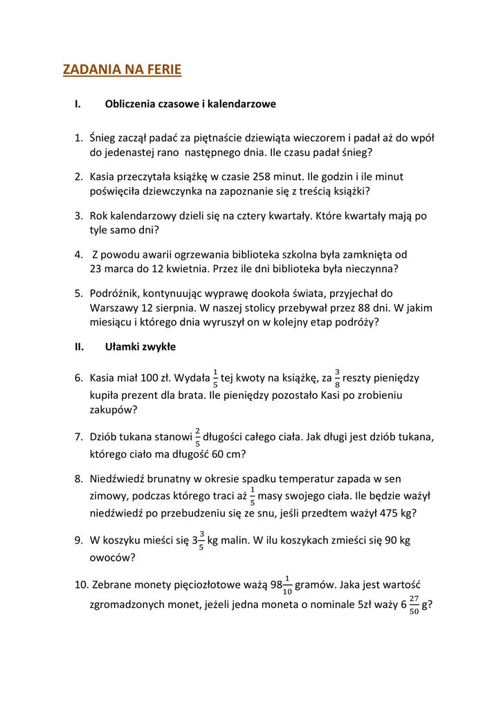 ZADANIA NA FERIE I. Obliczenia czasowe i kalendarzowe 1. Śnieg zaczął padać za piętnaście dziewiąta wieczorem i padał aż do wpół do jedenastej rano następnego dnia. Ile czasu padał śnieg? 2. Kasia przeczytała książkę w czasie 258 minut. Ile godzin i ile minut poświęciła dziewczynka na zapoznanie się z treścią książki? 3. Rok kalendarzowy dzieli się na cztery kwartały. Które kwartały mają po tyle samo dni? 4. Z powodu awarii ogrzewania biblioteka szkolna była zamknięta od 23 marca do 12 kwietnia. Przez ile dni biblioteka była nieczynna? 5. Podróżnik, kontynuując wyprawę dookoła świata, przyjechał do Warszawy 12 sierpnia. W naszej stolicy przebywał przez 88 dni. W jakim miesiącu i którego dnia wyruszył on w kolejny etap podróży? II. Ułamki zwykłe 6. Kasia miał 100 zł. Wydała tej kwoty na książkę, za reszty pieniędzy kupiła prezent dla brata. Ile pieniędzy pozostało Kasi po zrobieniu zakupów? 7. Dziób tukana stanowi długości całego ciała. Jak długi jest dziób tukana, którego ciało ma długość 60 cm? 8. Niedźwiedź brunatny w okresie spadku temperatur zapada w sen zimowy, podczas którego traci aż masy swojego ciała. Ile będzie ważył niedźwiedź po przebudzeniu się ze snu, jeśli przedtem ważył 475 kg? 9. W koszyku mieści się 3 kg malin. W ilu koszykach zmieści się 90 kg owoców? 10. Zebrane monety pięciozłotowe ważą 98 gramów. Jaka jest wartość zgromadzonych monet, jeżeli jedna moneta o nominale 5zł waży 6 g? 11. Trzy puste skrzynki do transportu gruszek ważą 6 kg, a dwie skrzynki z taką samą ilością jabłek ważą 64 . Ile waży jedna skrzynka pełna jabłek? 12. Podłoga w sali matematycznej, ma kształt prostokąta o długości 18 m. Szerokość klasy jest 3 razy mniejsza od jej długości. Za listwę przypodłogową trzeba zapłacić 9 zł za metr . Po odliczeniu 1 m na szerokość drzwi za listwę trzeba zapłacić: A) 450 zł III. B) 509 zł C) 441 zł D) 450 zł. Ułamki dziesiętne 13. Każdy ze stu zawodników turnieju koszykówki otrzymał truskawki, butelkę wody mineralnej i batonik. Ile należy zapłacić za te produkty, jeżeli butelka wody mineralnej kosztuje 0,85 zł, batonik 2, 45 zł, a truskawki dla wszystkich kosztowały 64 zł 75 gr? 14. Na giełdzie owoców można kupić jabłka do bezpośredniego spożycia i jabłka do przetwórstwa. Cena jabłek I gatunku waha się 1,87 zł do 2,53 zł za 1 kilogram. Ile złotych zaoszczędzi hurtownik, kupując 100 kg jabłek w najniższej cenie w porównaniu do ceny najwyższej? Czy zaoszczędzone pieniądze wystarczą na zakup 100 kg jabłek do przetwórstwa w cenie 0,67 zł za kilogram? 15. Wiersz „Siedmiomilowe buty” opowiada o chłopcu, który kupił specjalne buty. Każdy krok przenosił go o 7 mil dalej. Ile metrów miał krok chłopca jeżeli 1 mila (lądowa) = 1609, 344 m? 16. W puszcze znajduje się 0,33 l soku jabłkowego. W sklepie było 150 takich puszek i 25 butelek 1,5 – litrowych. Ile litrów soku znajdowało się w sklepie? 17. Jarek kupił pięć jabłek, które ważyły 0,95 kg. a) Ile zapłacił za owoce, jeżeli jeden kilogram jabłek kosztuje 2,40 zł. b) Ile otrzymał reszty, jeśli zapłacił monetą o nominale 5zł? c) Z jakiej minimalnej liczby monet mogła składać się ta reszta? 16. Serek homogenizowany sprzedawany jest w opakowania zawierających 300 g tego produktu. Na opakowaniu umieszczane są informacje o wartości odżywczej produktu: Przeciętna wartość odżywcza w 100 g wartość energetyczna 484 KJ białko 3,2 g węglowodany 4,8 g tłuszcz 14,0 g a) Ile gramów białka zawiera jedno opakowanie serka? b) Ile gramów tłuszczu zawierają łącznie trzy opakowania serka? 18. Mama kupiła 0,35 kg cukierków i z banknotu dziesięciozłotowego otrzymała 1 zł 95 gr reszty. Ile należy zapłacić za pół kilograma takich cukierków. 19. Marek chce kupić karty z piłkarzami. Ile kart w cenie 3,75 zł za sztukę może kupić jeśli udało mu się zaoszczędzić 47 zł 50 gr? 20. Każdy uczestnik wycieczki szkolnej musi być ubezpieczony. Ubezpieczenie osoby dorosłej wynosi 10 zł 35 gr, a ucznia 6 zł 40 gr. Ile będzie wynosił całkowity koszt ubezpieczenia dla grupy składającej się z 28 uczniów i czterech opiekunów. 21. Grzyby podczas suszenia tracą aż o,75 swojej masy. Ile pojemników , w których mieści się po 15 g grzybów musi przygotować Jacek do ich przechowania, jeżeli ususzy on 6 kg grzybów? 22. Tata waży 85 ,5 kg, mama 66,3 kg. Syn jest lżejszy od taty o 28, 2 kg, a córka trzy razy lżejsza od mamy. Ile kg waży każde dziecko? IV Pola figur płaskich 23. Blat kwadratowego stołu ma bok o długości 1,2 m. Paweł narysował ten blat na kartce pomniejszając jego wymiary 30 – krotnie. Jaką powierzchnię ma kwadrat narysowany na kartce przez Pawła? 24. Oblicz pole figur widocznych na rysunku: a) niebieskiej b) żółtej 25. Płyty chodnikowe mają kształt kwadratu o boku 0,5 m. Ile takich płyt potrzeba do wyłożenia chodnika o długości 25 m i szerokości 1,5 m? 26. Oblicz pola figur wiedząc, że bok małego kwadratu ma długość 2 cm a) b) c) d) IV. Graniastosłupy 27. Oblicz pole powierzchni poniższych prostopadłościanów a) b) 28. Jakie pole powierzchni mają prostopadłościany przedstawione na rysunkach a) b) 29. Pani Ola uszyła 6 nowych pokrowców na prostopadłościenne poduszki o wymiarach 40 cm X 30 cm X 30 cm. Ile metrów kwadratowych materiału zużyła, należy doliczyć, 0, 25 m2 na wszystkie szwy? 30. W łazience, której podłoga ma wymiary 4m X 3m, i której wysokość wynosi 2,5 m. należy wyłożyć płytkami podłogę i wszystkie ściany. Ile metrów kwadratowych płytek należy zakupić w tym celu, jeżeli odliczyć 3 m2 na drzwi i okno?