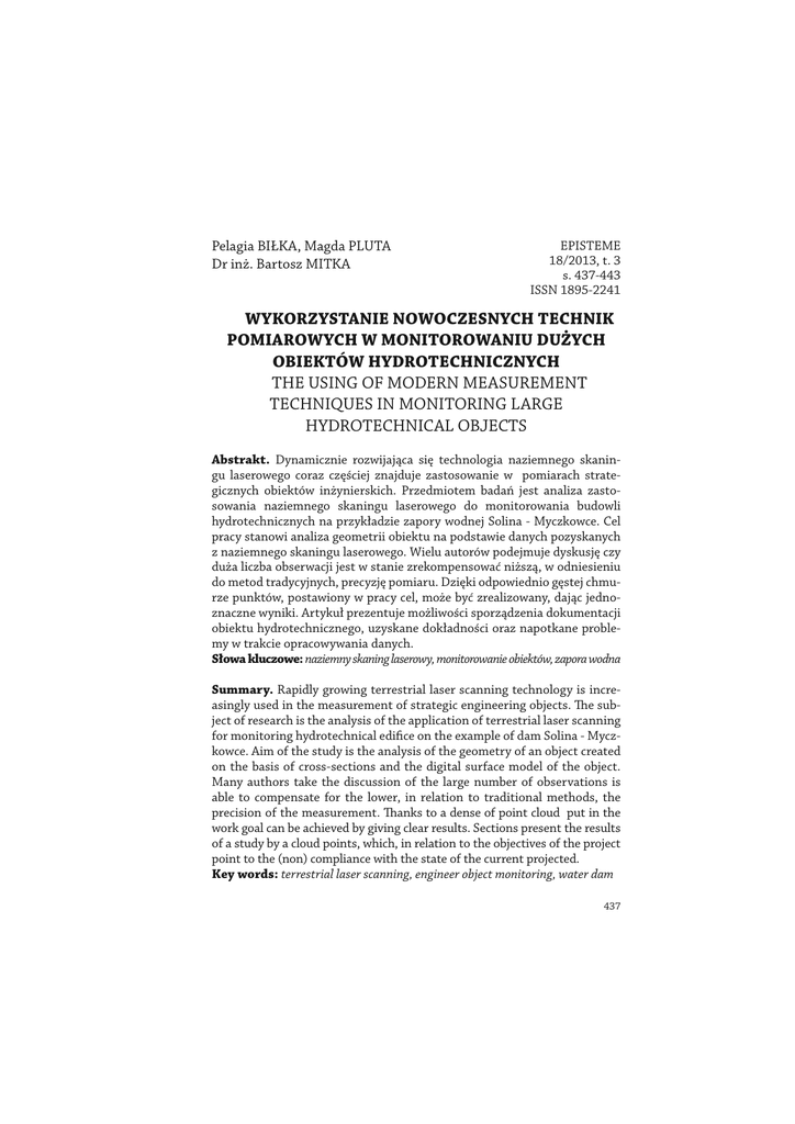 Abstrakt. Dynamicznie rozwijająca się technologia naziemnego skaningu laserowego coraz częściej znajduje zastosowanie w pomiarach strategicznych obiektów inżynierskich. Przedmiotem badań jest analiza zastosowania naziemnego skaningu laserowego do monitorowania budowli