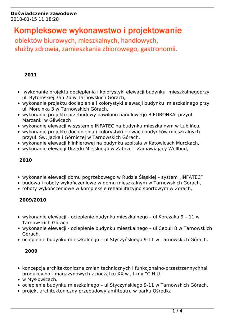 Doświadczenie zawodowe 2010-01-15 11:18:28 2011 wykonanie projektu docieplenia i kolorystyki elewacji budynku mieszkalnegoprzy ul. Bytomskiej 7a i 7b w Tarnowskich Górach, wykonanie projektu docieplenia i kolorystyki elewacji budynku mieszkalnego przy ul. Morcinka 3 w Tarnowskich Górach, wykonanie projektu przebudowy pawilonu handlowego BIEDRONKA przyul. Marzanki w Gliwicach wykonanie elewacji w systemie INFATEC na budynku mieszkalnym w Lublińcu, wykonanie projektu docieplenia i kolorystyki elewacji budynków mieszkalnych przyul. Św, Jacka i Górniczej w Tarnowskich Górach, wykonanie elewacji klinkierowej na budynku szpitala w Katowicach Murckach, wykonanie elewacji Urzędu Miejskiego w Zabrzu – Zamawiający Wellbud, 2010 wykonanie elewacji domu pogrzebowego w Rudzie Śląskiej – system „INFATEC” budowa i roboty wykończeniowe w domu mieszkalnym w Tarnowskich Górach, roboty wykończeniowe w kompleksie rehabilitacyjno sportowym w Żorach, 2009/2010 wykonanie elewacji - ocieplenie budynku mieszkalnego – ul Korczaka 9 – 11 w Tarnowskich Górach. wykonanie elewacji - ocieplenie budynku mieszkalnego – ul Cebuli 8 w Tarnowskich Górach. ocieplenie budynku mieszkalnego – ul Styczyńskiego 9-11 w Tarnowskich Górach. 2009 koncepcja architektoniczna zmian technicznych i funkcjonalno-przestrzennychhal produkcyjno - magazynowych z początku XX w., f-my ”C.H.U.” w Mysłowicach. ocieplenie budynku mieszkalnego – ul Styczyńskiego 9-11 w Tarnowskich Górach. projekt architektoniczny przebudowy amfiteatru w parku Ośrodka 1/4 Rehabilitacyjnego REPTY w Tarnowskich Górach. 2008 projekt architektoniczny i przebudowa siedziby i hal magazynowych f-my”TAHEMA” w Tarnowskich Górach. ocieplenie budynku mieszkalnego w Miedarach. 2006/2007 projekty i realizacje obiektów budownictwa mieszkaniowego jednorodzinnego i bliźniaczego w Zbrosławicach (pod klucz) i Tarnowskich Górach ( Opatowice) i w Chorzowie. wykonanie przebudowy (adaptacji) budynku socjalnego na siedzibę firmy ALSTOM – KONSTAL w Chorzowie oraz wykonanie projektu przebudowy budynku socjalnego na siedzibę firmy - realizacja „pod klucz”. adaptacja pomieszczeń pawilonu na przychodnię KRIOKOMORY w Ośrodku Rehabilitacyjnym „Repty” w Tarnowskich Górach, 2005 projekt budowlany i aranżacja wnętrz Oddziału BGK w Opolu. kompleksowa realizacja budynku podjazdu dla karetek i przychodni KRIOKOMORY w G.C.R. ”REPTY” w Tarnowskich Górach. projekt budowlano-wykonawczy przebudowy budynku mieszkalnego jednorodzinnego w Paczkowie 2003/2004 projekt budowlano-wykonawczy i realizacja generalnego remontu i przebudowy zabytkowych budynków STOWARZYSZENIA MIŁOŚNIKÓW ZIEMI TARNOGÓRSKIEJ w Tarnowskich Górach. 2003 projekt budowlano-wykonawczy i realizacja siedziby firmy „MBM Komputer”w Katowicach. projekt budowlano-wykonawczy i realizacje: sklepu jubilerskiego „Złotnictwo Pieczonka” oraz Biura Podróży „Marco Polo” w budynku „UNI-CENTRUM” w Katowicach. 2002 koncepcja skomunikowania stref gospodarczych Chorzowa. 2/4 projekt budowlano-wykonawczy wraz z realizacją : Pizzerii „Capriccio” oraz Fitness Club „LETUS” w Centrum Handlowym „PLAZA” w Rudzie Śląskiej. 2001 projekt budowlano-wykonawczy i kompleksowa realizacja Oddziału „KREDYT BANKU” S.A. w Chorzowie. projekt budowlano-wykonawczy i realizacja sklepu odzieżowego „AJK – Moda” w Sosnowcu wraz z remontem kapitalnym zabytkowej elewacji w Sosnowcu przy ul. Modrzejowskiej. 2000 projekt rozbudowy i modernizacji Hotelu „MAGURA” w Bielsku – Białej. projekt i adaptacja parteru kamienicy na sklep drogeryjno-perfumeryjny „ AMFORA” w Piekarach Śląskich. projekt budowlano-wykonawczy i aranżacja wnętrz restauracji typu „Fast – Food”w hipermarkecie „HIT” w Bytomiu. 1999 projekt budowlany i wykonawczy budynku biurowego dla Spółdzielni „ERA”w Chorzowie przy ul. Paderewskiego. 1998 projekt budowlany i wykonawczy wraz z realizacją pawilonu marketingu Zakładów Chemicznych „HAJDUKI” S.A. w Chorzowie. projekt budowlany i wykonawczy budynku biurowego Oddziału Bytomskiego Spółdzielni „ERA” w Chorzowie. 1997 projekt budowlany i wykonawczy oraz kompleksowa realizacja modelowegoOddziału „BANKU ŚLĄSKIEGO” S.A. w Chorzowie Batorym.projekt budowlano - wykonawczy oddziału Filii Stereo „Banku Śląskiego” S.A.w Świętochłowicach. projekt budowlany i wykonawczy oraz kompleksowa realizacja Filii Stereo Oddziału „Banku Śląskiego” S.A. w Bytomiu oraz w Tarnowskich Górach 1996 projekt budowlano-wykonawczy i kompleksowa realizacja Inspektoratu„PZU Życie” S.A. w Rudzie Śląskiej. 3/4 projekty aranżacji wnętrz i realizacje sklepów z odzieżą „Alkon” i „Janusz” w Sosnowcu przy ul. Modrzejowskiej. 1995 projekt budowlano-wykonawczy i realizacja siedziby Inspektoratu „ P.Z.U. Życie” S.A. w Chorzowie. projekt budowlano-wykonawczy Inspektoratu „P.Z.U. Życie” S.A. w Bytomiu. projekt budowlano-wykonawczy i kompleksowa realizacja remontu dachu orazprzebudowy budynku Banku PKO BP w Tarnowskich Górach wraz z remontem elewacji i rekonstrukcją wieży narożnej. 1994 projekt wykonawczy przebudowy Domu Kultury w Orzeszu. projekt i realizacje kompleksu sklepów Spółki „RUCH” z Chorzowa. 1993 projekt remontu dachu RATUSZA w Tarnowskich Górach. projekt budowlano-wykonawczy i realizacja „Małopolskiego Domu Maklerskiego” w Olkuszu. projekt, aranżacja wnętrz i realizacje sklepów „EXKLUSIV” w Katowicach sklepów w Katowicach i Bytomiu 1989/1992 projekty budynków wielorodzinnych na Osiedlu Mickiewicza w Dąbrowie Górniczeji Osiedlu Gałeczki w Chorzowie biuro architektoniczne