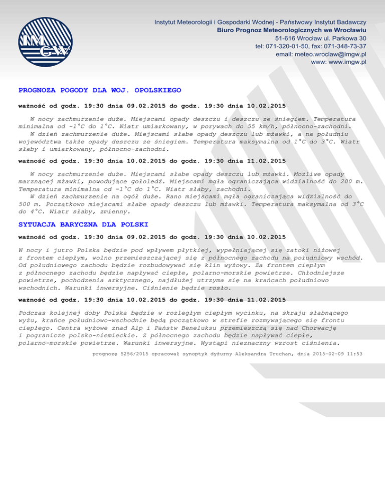 Instytut Meteorologii i Gospodarki Wodnej - Państwowy Instytut Badawczy Biuro Prognoz Meteorologicznych we Wrocławiu 51-616 Wrocław ul. Parkowa 30 tel: 071-320-01-50, fax: 071-348-73-37 email: [email protected] www: www.imgw.pl PROGNOZA POGODY DLA WOJ. OPOLSKIEGO ważność od godz. 19:30 dnia 09.02.2015 do godz. 19:30 dnia 10.02.2015 W nocy zachmurzenie duże. Miejscami opady deszczu i deszczu ze śniegiem. Temperatura minimalna od -1°C do 1°C. Wiatr umiarkowany, w porywach do 55 km/h, północno-zachodni. W dzień zachmurzenie duże. Miejscami słabe opady deszczu lub mżawki, a na południu województwa także opady deszczu ze śniegiem. Temperatura maksymalna od 1°C do 3°C. Wiatr słaby i umiarkowany, północno-zachodni. ważność od godz. 19:30 dnia 10.02.2015 do godz. 19:30 dnia 11.02.2015 W nocy zachmurzenie duże. Miejscami słabe opady deszczu lub mżawki. Możliwe opady marznącej mżawki, powodujące gołoledź. Miejscami mgła ograniczająca widzialność do 200 m. Temperatura minimalna od -1°C do 1°C. Wiatr słaby, zachodni. W dzień zachmurzenie na ogół duże. Rano miejscami mgła ograniczająca widzialność do 500 m. Początkowo miejscami słabe opady deszczu lub mżawki. Temperatura maksymalna od 3°C do 4°C. Wiatr słaby, zmienny. SYTUACJA BARYCZNA DLA POLSKI ważność od godz. 19:30 dnia 09.02.2015 do godz. 19:30 dnia 10.02.2015 W nocy i jutro Polska będzie pod wpływem płytkiej, wypełniającej się zatoki niżowej z frontem ciepłym, wolno przemieszczającej się z północnego zachodu na południowy wschód. Od południowego zachodu będzie rozbudowywać się klin wyżowy. Za frontem ciepłym z północnego zachodu będzie napływać ciepłe, polarno-morskie powietrze. Chłodniejsze powietrze, pochodzenia arktycznego, najdłużej utrzyma się na krańcach południowo wschodnich. Warunki inwersyjne. Ciśnienie będzie rosło. ważność od godz. 19:30 dnia 10.02.2015 do godz. 19:30 dnia 11.02.2015 Podczas kolejnej doby Polska będzie w rozległym ciepłym wycinku, na skraju słabnącego wyżu, krańce południowo-wschodnie będą początkowo w strefie rozmywającego się frontu ciepłego. Centra wyżowe znad Alp i Państw Beneluksu przemieszczą się nad Chorwację i pogranicze polsko-niemieckie. Z północnego zachodu będzie napływać ciepłe, polarno-morskie powietrze. Warunki inwersyjne. Wystąpi nieznaczny wzrost ciśnienia. prognozę 5256/2015 opracował synoptyk dyżurny Aleksandra Truchan, dnia 2015-02-09 11:53