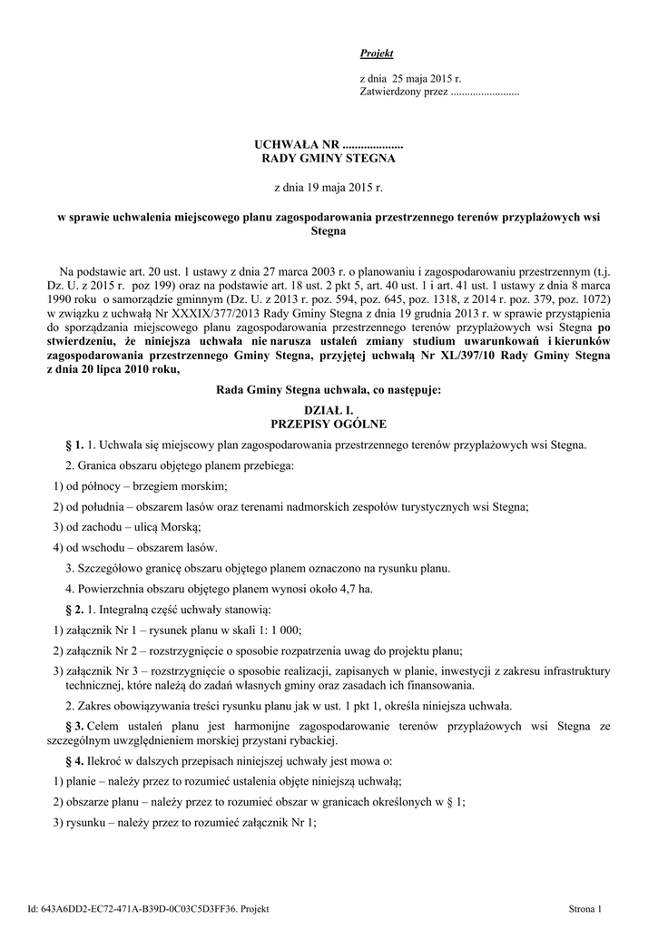 Projekt z dnia 25 maja 2015 r. Zatwierdzony przez ......................... UCHWAŁA NR .................... RADY GMINY STEGNA z dnia 19 maja 2015 r. w sprawie uchwalenia miejscowego planu zagospodarowania przestrzennego terenów przyplażowych wsi Stegna Na podstawie art. 20 ust. 1 ustawy z dnia 27 marca 2003 r. o planowaniu i zagospodarowaniu przestrzennym (t.j. Dz. U. z 2015 r. poz 199) oraz na podstawie art. 18 ust. 2 pkt 5, art. 40 ust. 1 i art. 41 ust. 1 ustawy z dnia 8 marca 1990 roku o samorządzie gminnym (Dz. U. z 2013 r. poz. 594, poz. 645, poz. 1318, z 2014 r. poz. 379, poz. 1072) w związku z uchwałą Nr XXXIX/377/2013 Rady Gminy Stegna z dnia 19 grudnia 2013 r. w sprawie przystąpienia do sporządzania miejscowego planu zagospodarowania przestrzennego terenów przyplażowych wsi Stegna po stwierdzeniu, że niniejsza uchwała nie narusza ustaleń zmiany studium uwarunkowań i kierunków zagospodarowania przestrzennego Gminy Stegna, przyjętej uchwałą Nr XL/397/10 Rady Gminy Stegna z dnia 20 lipca 2010 roku, Rada Gminy Stegna uchwala, co następuje: DZIAŁ I. PRZEPISY OGÓLNE § 1. 1. Uchwala się miejscowy plan zagospodarowania przestrzennego terenów przyplażowych wsi Stegna. 2. Granica obszaru objętego planem przebiega: 1) od północy – brzegiem morskim; 2) od południa – obszarem lasów oraz terenami nadmorskich zespołów turystycznych wsi Stegna; 3) od zachodu – ulicą Morską; 4) od wschodu – obszarem lasów. 3. Szczegółowo granicę obszaru objętego planem oznaczono na rysunku planu. 4. Powierzchnia obszaru objętego planem wynosi około 4,7 ha. § 2. 1. Integralną część uchwały stanowią: 1) załącznik Nr 1 – rysunek planu w skali 1: 1 000; 2) załącznik Nr 2 – rozstrzygnięcie o sposobie rozpatrzenia uwag do projektu planu; 3) załącznik Nr 3 – rozstrzygnięcie o sposobie realizacji, zapisanych w planie, inwestycji z zakresu infrastruktury technicznej, które należą do zadań własnych gminy oraz zasadach ich finansowania. 2. Zakres obowiązywania treści rysunku planu jak w ust. 1 pkt 1, określa niniejsza uchwała. § 3. Celem ustaleń planu jest harmonijne zagospodarowanie terenów przyplażowych wsi Stegna ze szczególnym uwzględnieniem morskiej przystani rybackiej. § 4. Ilekroć w dalszych przepisach niniejszej uchwały jest mowa o: 1) planie – należy przez to rozumieć ustalenia objęte niniejszą uchwałą; 2) obszarze planu – należy przez to rozumieć obszar w granicach określonych w § 1; 3) rysunku – należy przez to rozumieć załącznik Nr 1; Id: 643A6DD2-EC72-471A-B39D-0C03C5D3FF36. Projekt Strona 1 4) symbolu – należy przez to rozumieć oznaczenie literowe i oznaczenie literowe z cyfrą określające tereny o różnym przeznaczeniu i różnych zasadach zagospodarowania; 5) nieprzekraczalnej linii zabudowy – należy przez to rozumieć linię poza którą wyklucza się lokalizację budynków; nieprzekraczalna linia zabudowy nie dotyczy takich elementów jak: balkon, okap, wykusz, schody zewnętrzne, ganek, podcień. DZIAŁ II. USTALENIA DLA CAŁEGO OBSZARU PLANU Rozdział 1. USTALENIA W ZAKRESIE URBANISTYKI § 5. 1. Zagospodarowanie terenów następuje zgodnie z ich przeznaczeniem z uwzględnieniem ustaleń działów II i III oraz wszystkich aktualnie obowiązujących przepisów szczególnych. 2. Plan nie ustala granic terenów wymagających scalenia gruntów. 3. Dopuszcza się realizację urządzeń budowlanych, zapewniających możliwość użytkowania obiektu budowlanego zgodnie z jego przeznaczeniem. § 6. 1. Tereny o ustalonym planem przeznaczeniu lub różnych zasadach zagospodarowania zawarte są pomiędzy liniami rozgraniczającymi oznaczonymi na rysunku liniami ciągłymi. 2. Ustala się nieprzekraczalne linie zabudowy oznaczone na rysunku: 1) na terenie zabudowy usługowej U1 – w odległości 8 m od krawędzi jezdni ulicy zbiorczej KDZ, będącej w ciągu drogi powiatowej nr 2325G; 2) na terenie zabudowy usługowej U1 – po obu stronach głównych dojść; 3) na terenie morskiej przystani rybackiej MPR – od strony północnej i zachodniej na działce nr 1223/6. 3. Nieprzekraczalna linia zabudowy od strony zachodniej na terenie morskiej przystani rybackiej MPR na działce nr 1223/6, o której mowa w § 6 ust. 2 pkt 3 – nie dotyczy budynku maszynowni wyciągarki dla jednostek rybackich. 4. Nieprzekraczalna linia zabudowa od strony zachodniej na terenie morskiej przystani rybackiej MPR na działce nr 1223/6, o której mowa w § 6 ust. 2 pkt 3 – będzie mogła być przesunięta w kierunku zachodnim – po zrealizowaniu kompleksowego systemu odprowadzenia wód opadowych dla terenu zabudowy usługowej U1. 5. Na terenie morskiej przystani rybackiej MPR na działce nr 1223/6 dopuszcza się sytuowanie budynku lub budynków: 1) bezpośrednio przy wschodniej granicy działki nr 1223/6; 2) w odległości 1,5 m od południowej granicy działki nr 1223/6. 6. Pozostałe nieprzekraczalne linie zabudowy w obszarze planu – obowiązują według aktualnych przepisów szczególnych. Rozdział 2. USTALENIA W ZAKRESIE ARCHITEKTURY § 7. 1. Ustalenia szczegółowe kształtowania architektury określa dział III. 2. Przy uwzględnieniu ustaleń ust. 1 plan nie ogranicza swobody kształtowania architektury budynków. 3. Obiekty małej architektury mogą być sytuowane na terenach określonych w dalszej części niniejszej uchwały. 4. Ustala się zakaz lokalizacji wolno stojących urządzeń reklamowych. 5. Ustala się maksymalną wysokość do 1,8 m dla nowych ogrodzeń. Ustala się zakaz realizacji ogrodzeń dla terenu U1. 6. Ustala się zakaz realizacji żelbetowych wypełnień nowych ogrodzeń. 7. Zakaz, o którym mowa w ust. 6 nie dotyczy elementów konstrukcyjnych nowego ogrodzenia, takich jak słupki i podmurówki. Id: 643A6DD2-EC72-471A-B39D-0C03C5D3FF36. Projekt Strona 2 Rozdział 3. USTALENIA W ZAKRESIE OCHRONY ŚRODOWISKA, PRZYRODY I KRAJOBRAZU § 8. 1. Obszar planu położony jest w otulinie Parku Kr