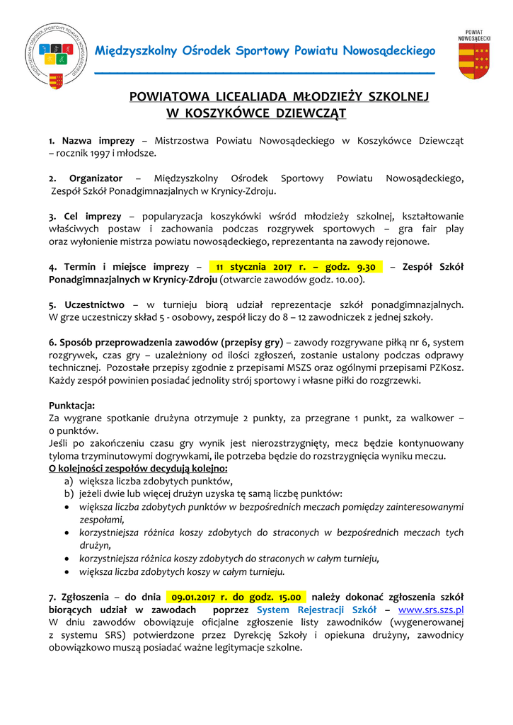 Międzyszkolny Ośrodek Sportowy Powiatu Nowosądeckiego _____________________________________________ POWIATOWA LICEALIADA MŁODZIEŻY SZKOLNEJ W KOSZYKÓWCE DZIEWCZĄT 1. Nazwa imprezy – Mistrzostwa Powiatu Nowosądeckiego w Koszykówce Dziewcząt – rocznik 1997 i młodsze. 2. Organizator – Międzyszkolny Ośrodek Sportowy Zespół Szkół Ponadgimnazjalnych w Krynicy-Zdroju. Powiatu Nowosądeckiego, 3. Cel imprezy – popularyzacja koszykówki wśród młodzieży szkolnej, kształtowanie właściwych postaw i zachowania podczas rozgrywek sportowych – gra fair play oraz wyłonienie mistrza powiatu nowosądeckiego, reprezentanta na zawody rejonowe. 4. Termin i miejsce imprezy – 11 stycznia 2017 r. – godz. 9.30 Ponadgimnazjalnych w Krynicy-Zdroju (otwarcie zawodów godz. 10.00). – Zespół Szkół 5. Uczestnictwo – w turnieju biorą udział reprezentacje szkół ponadgimnazjalnych. W grze uczestniczy skład 5 - osobowy, zespół liczy do 8 – 12 zawodniczek z jednej szkoły. 6. Sposób przeprowadzenia zawodów (przepisy gry) – zawody rozgrywane piłką nr 6, system rozgrywek, czas gry – uzależniony od ilości zgłoszeń, zostanie ustalony podczas odprawy technicznej. Pozostałe przepisy zgodnie z przepisami MSZS oraz ogólnymi przepisami PZKosz. Każdy zespół powinien posiadać jednolity strój sportowy i własne piłki do rozgrzewki. Punktacja: Za wygrane spotkanie drużyna otrzymuje 2 punkty, za przegrane 1 punkt, za walkower – 0 punktów. Jeśli po zakończeniu czasu gry wynik jest nierozstrzygnięty, mecz będzie kontynuowany tyloma trzyminutowymi dogrywkami, ile potrzeba będzie do rozstrzygnięcia wyniku meczu. O kolejności zespołów decydują kolejno: a) większa liczba zdobytych punktów, b) jeżeli dwie lub więcej drużyn uzyska tę samą liczbę punktów: większa liczba zdobytych punktów w bezpośrednich meczach pomiędzy zainteresowanymi zespołami, korzystniejsza różnica koszy zdobytych do straconych w bezpośrednich meczach tych drużyn, korzystniejsza różnica koszy zdobytych do straconych w całym turnieju, większa liczba zdobytych koszy w całym turnieju. 7. Zgłoszenia – do dnia 09.01.2017 r. do godz. 15.00 należy dokonać zgłoszenia szkół biorących udział w zawodach poprzez System Rejestracji Szkół – www.srs.szs.pl W dniu zawodów obowiązuje oficjalne zgłoszenie listy zawodników (wygenerowanej z systemu SRS) potwierdzone przez Dyrekcję Szkoły i opiekuna drużyny, zawodnicy obowiązkowo muszą posiadać ważne legitymacje szkolne. 8. Nagrody – dla zwycięzców przewidziane są pamiątkowe puchary i dyplomy. 9. Zasady finansowania – koszty organizacyjne pokrywa organizator, a uczestnictwa szkoły we własnym zakresie. Wszyscy uczestnicy otrzymują posiłek. 10. Postanowienia końcowe organizator zastrzega sobie prawo ostatecznej interpretacji niniejszego Regulaminu we wszystkich sprawach nie ujętych w niniejszym Regulaminie – prawo decydowania przysługuje organizatorowi za zachowanie, dyscyplinę i opiekę nad swoimi zawodnikami (uczniami) odpowiedzialni są ich opiekunowie uczestnicy zawodów zobowiązani są do zachowania się zgodne z „etyką sportowca", w przypadku niesportowego zachowania uczestników (zawodników, opiekuna) organizator ma prawo wykluczenia ich z zawodów (zawodnika lub całej drużyny) zgłoszenie do zawodów jest równoznaczne z akceptacją niniejszego Regulaminu. W imieniu organizatora Międzyszkolny Ośrodek Sportowy Powiatu Nowosądeckiego
