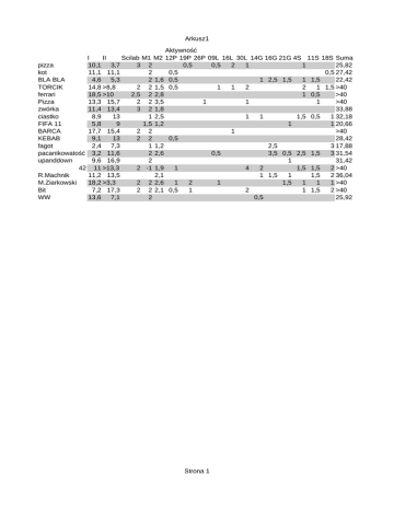 Arkusz1 Aktywność I II Scilab M1 M2 12P 19P 26P 09L 16L 30L 14G 16G 21G 4S 11S 18S Suma pizza 10,1 3,7 3 2 0,5 0,5 2 1 1 25,82 kot 11,1 11,1 2 0,5 0,5 27,42 BLA BLA 4,6 5,3 2 1,6 0,5 1 2,5 1,5 1 1,5 22,42 TORCIK 14,8 >8,8 2 2 1,5 0,5 1 1 2 2 1 1,5 >40 ferrari 18,5 >10 2,5 2 2,8 1 0,5 >40 Pizza 13,3 15,7 2 2 3,5 1 1 1 >40 zwórka 11,4 13,4 3 2 1,8 33,88 ciastko 8,9 13 1 2,5 1 1 1,5 0,5 1 32,18 FIFA 11 5,8 9 1,5 1,2 1 1 20,66 BARCA 17,7 15,4 2 2 1 >40 KEBAB 9,1 13 2 2 0,5 28,42 fagot 2,4 7,3 1 1,2 2,5 3 17,88 pacanikowatość 3,2 11,6 2 2,6 0,5 3,5 0,5 2,5 1,5 3 31,54 upanddown 9,6 16,9 2 1 31,42 42 11 >13,3 2 -1 1,9 1 4 2 1,5 1,5 2 >40 R.Machnik 11,2 13,5 2,1 1 1,5 1 1,5 2 36,04 M.Ziarkowski 18,2 >3,3 2 2 2,6 1 2 1 1,5 1 1 1 >40 Bit 7,2 17,3 2 2 2,1 0,5 1 2 1 1,5 2 >40 WW 13,6 7,1 2 0,5 25,92 Strona 1
