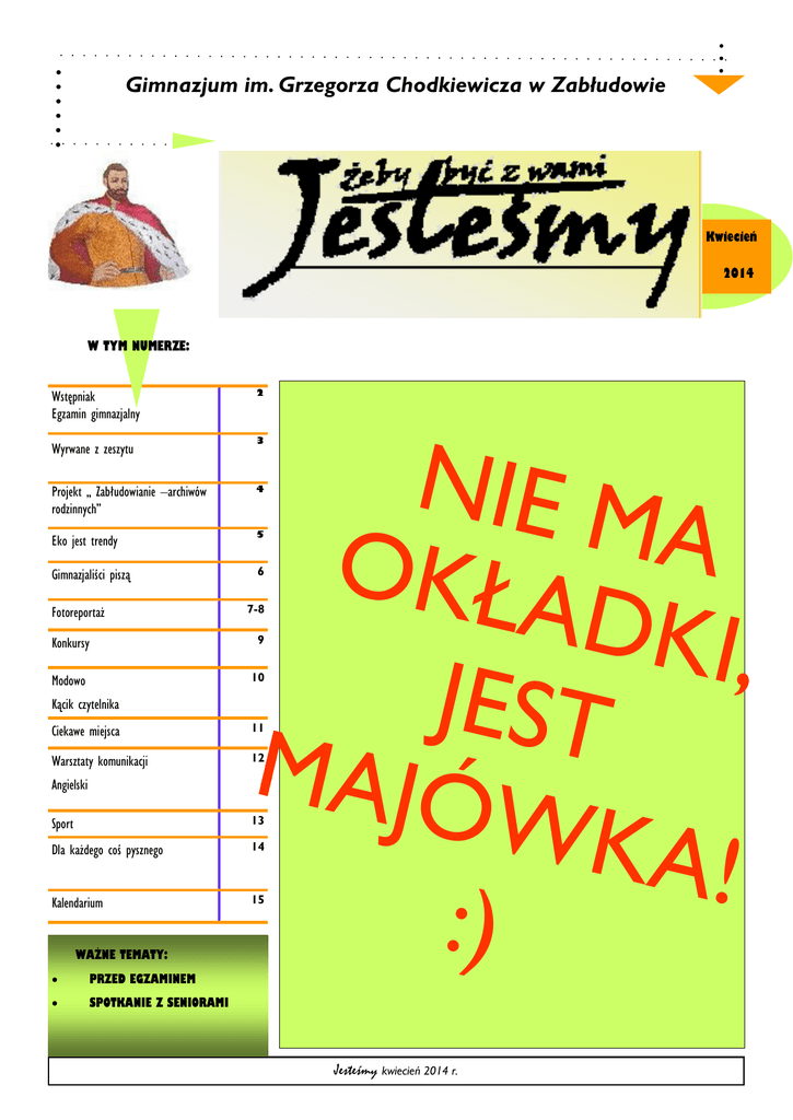 Gimnazjum im. Grzegorza Chodkiewicza w Zabłudowie Kwiecień 2014 W TYM NUMERZE: Wstępniak Egzamin gimnazjalny Wyrwane z zeszytu Projekt „ Zabłudowianie –archiwów rodzinnych” Eko jest trendy Gimnazjaliści piszą Fotoreportaż Konkursy 2 NIE M A OKŁA DKI, JEST MAJÓ WKA ! :) 3 4 5 6 7-8 9 10 Modowo Kącik czytelnika Ciekawe miejsca 11 Warsztaty komunikacji 12 Angielski Sport 13 Dla każdego coś pysznego 14 Kalendarium 15 WAŻNE TEMATY: PRZED EGZAMINEM SPOTKANIE Z SENIORAMI Jesteśmy kwiecień 2014 r. Wstępniak Z okazji nadchodzących Świąt Wielkanocy w imieniu Redakcji chciałabym złożyć Wam najserdeczniejsze życzenia. Spełnienia wszystkich marzeń, nadziei, spokoju, powodzenia we wszystkich Waszych planach! Wszystkiego dobrego! :) Całej naszej społeczności szkolnej życzymy dużo, dużo odpoczynku, radości z nadchodzącej wiosny, pogody ducha i optymizmu! :) Gimnazjalistom zdającym egzamin– powodzenia, połamania długopisów i duuuuużo spokoju! :) Egzamin gimnazjalny nie taki straszny... Każdy denerwuje się przed egzaminami, są jednak sposoby na to, aby utrzymywać swój niepokój pod kontrolą: - opowiedz o swoich lękach bliskim, wysłuchaj ich słów otuchy, - pamiętaj, że w trakcie egzaminów, jak i przed nimi musisz się dobrze odżywiać i wysypiać, - koniecznie myśl pozytywnie – badania udowadniają, że pozytywne myślenie naprawdę może pomóc w uzyskaniu lepszych wyników! 70 000 nastolatków co roku nie pojawia się na egzaminach właśnie z powodu nadmiernego zdenerwowania i niepokoju. Nie bądź jednym z nich! Jak szybko się uspokoić? Przypomnij sobie o swoim ostatnim osiągnięciu, z którego jesteś dumny. Zjedz pierniczka (imbir w nim zawarty pomaga się uspokoić). Dodaj sobie pozytywnej energii, robiąc przez godzinę coś, co sprawia Ci przyjemność. Cenna rada! Koniecznie zjedz śniadanie! Badania dowodzą, że przeciętny uczeń, który zjadł śniadanie przed podejściem do egzaminu, osiąga o 20% lepszy wynik od Monika Woronicz tego, który był na czczo. Redaktor naczelna Ciekawostki egzaminacyjne… - badania wskazują na to, że dziewczęta mają skłonność do zbyt niskiego szacowania wyników swoich egzaminów, podczas gdy chłopcy je zawyżają! - melisa słynie z tego, że pomaga skutecznie obniżyć poziom stresu - uczniowie, którzy są zestresowani, częściej chorują. Codzienna gimnastyka i zdrowa dieta mogą zapewnić skuteczną ochronę zarówno przed stresem, jak i infekcjami. Powodzenia dla wszystkich zdających egzamin gimnazjalny 2014! Ewelina Jesteśmy kwiecień 2014 r. 2 Wyrwane z zeszytu Tam ustawiano drewniane podwyższenie czyli scenę i długi stół, na którym podawano jedzenie. Czasami na weselu pojawiał się „marszałek”, który prowadził z babciami i dziadkami zabawę. Grała kapela, w której skład wchodził najczęściej akordeon, saksofon, harmonijka i perkusja. 9 kwietnia klasa I „c” miała spotkanie z babciami i Nie było wtedy ślubów cywilnych, tylko kościelne, a dziadkami w ramach projektu „Zabłudowianie- al- do samego kościoła albo szło się pieszo, albo jechało bum rodzinny”. Do szkoły zaproszeni zostali : dwie furmanką. Jednakże mimo wszystko każdy miał chop. Janowicz, p. Pokrowska, p. Węcławska i p. Boj- ciaż skrawek ziemi do uprawy i trochę trzody chlewnej lub kury. ko . Dowiedzieliśmy się, że w dawnych czasach Spotkanie było bardzo ciekawe a za trud przyjścia dzieci bawiły się w grupach, na świeżym powietrzu. do szkoły i opowiedzenie nam tego wszystkiego Głównie był to „chowany”, „palant” czy „dwa babcie i dziadek otrzymali podziękowania i czekolaognie”. Dziewczynki grały też w „gumę”, a chłopcy dę. robili proce i łuki. Zabawki były robione z papieru i Urszula Dołżyńska drewna. Czasami do miasta przyjeżdżała „beczka śmierci”, która była ogromną atrakcją. Polegało to na tym, że stawiano ogromną beczkę, a w środku po ściankach owej beczki jeździł motor. W szkole w jednej klasie mogło być nawet 60 osób i pomimo iż na lekcjach było ciasno, wszyscy się lubili i nie spra,,Życia ograniczone zasady” wiało to nikomu problemu. Dodatkowo w klasach mogły być najróżniejsze roczniki! Później, bo dopiero w wieku 18 lat można było pójść na zabawę w budynku straży pożarnej lub w GS - owskiej świetliMamy w swoim życiu za dużo do stracenia, cy. Jednakże na taką potańcówkę dziewczyna nie Mamy za mało czasu żeby coś zyskać, mogła wejść bez towarzyszącego jej chłopaka, ponieważ to nie wypadało. Jak opowiadała jedna z ba- Mamy za mało czasu żeby odważnie kochać, bć „ dziewczyny zbierały się w grupkę i łapały jaMamy za mało czasu żeby być szczęśliwymi, kiegoś chłopaka, któremu płaciły, by ten wprowadził Mamy za mało czasu żeby żyć, je na dyskotekę”. Gdy chłopak i dziewczyna mieli Mamy za mało czasu żeby go tracić. się ku sobie, znajomi brali dziewczynę „w rajki” i Mamy za krótkie życie, wozili do danego chłopaka, by ci mogli ze sobą pogadać itp. W czasie świąt cała rodzina zbierała się w Żeby stracić je z własnej woli. Relacja ze spotkania jednym domu, ubierano choinkę, pieczono ciasta, a jeden z domowników przebierał się za św. Mikołaja. Dzieci najczęściej bały się takiego przebierańca i chowały pod łóżka, ale gdy zauważały prezenty, szybko się oswajały. Na Wielkanoc zaś przynoszono dachówki i taczano na nich jajka. W sklepach produkty żywnościowe i inne towary kupowano „na kwitki”. Taki „kwitek” można było otrzymać w ramach wypłaty w pracy. Ludzie pracowali najczęściej na roli w mleczarni i rozlewni. Był też zakład krawiecki, garbarnia i piekarnia. Niektórzy zatrudnieni byli w licznych sklepikach u Żydów. Z dojechaniem do Białegostoku było trochę problemów, czasami trzeba było czekać kilka godzin do odjazdu autobusu. A sam autobus bardzo się różnił od dzisiejszego. 