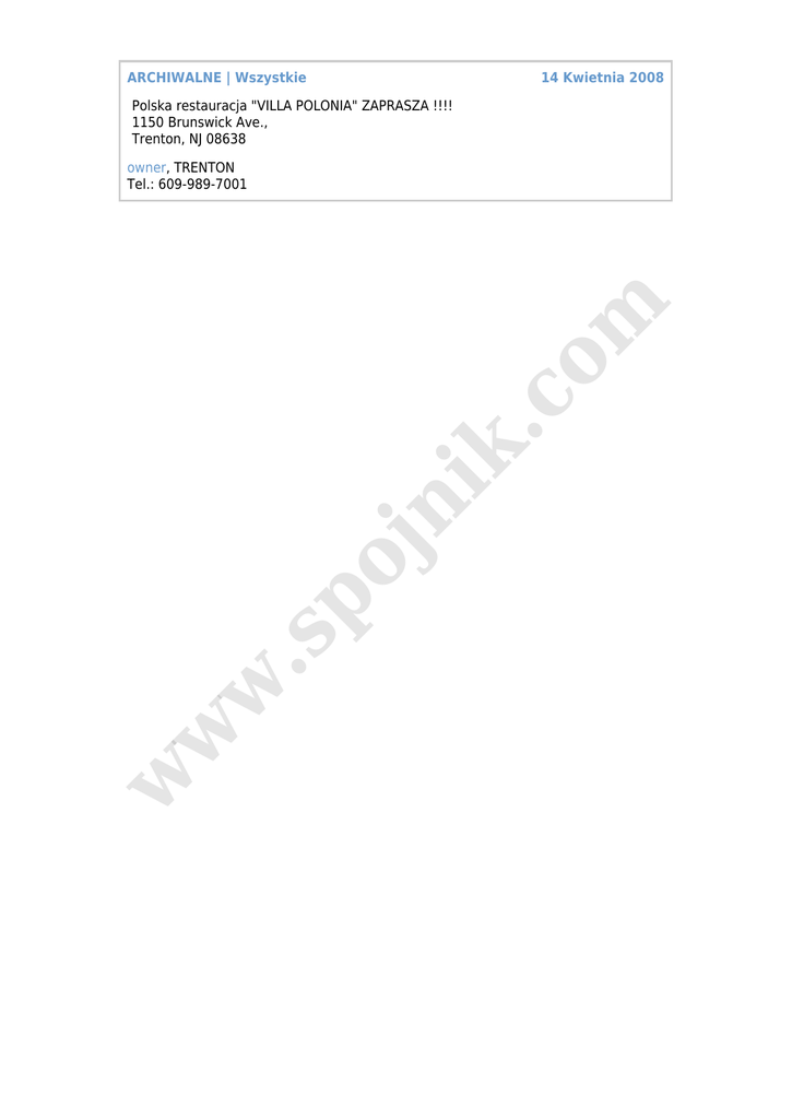 ARCHIWALNE | Wszystkie 14 Kwietnia 2008 Polska restauracja "VILLA POLONIA" ZAPRASZA !!!! 1150 Brunswick Ave., Trenton, NJ 08638 w w w .s po jn ik .c o m owner, TRENTON Tel.: 609-989-7001