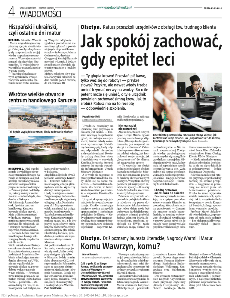 4 GAZETA OLSZTYŃSKA DZIENNIK ELBLĄSKI WIADOMOŚCI Hiszpański i ukraiński, czyli ostatnie dni matur R E G I O N . 36 osób z Warmii i Mazur zdaje dzisiaj maturę pisemną z języka ukraińskiego. Cztery osoby zdecydowały się na sprawdzenie swojej wiedzy na poziomie rozszerzonym. Wczoraj maturzyści zmagali się z językiem hiszpańskim. W województwie warmińsko-mazurskim pisały go 32 osoby. — Przebieg dotychczasowych egzaminów w województwie warmińsko-mazurskim nie został zakłóco- ny. Wszystko odbyło się zgodnie z procedurami, nie mieliśmy zgłoszeń o poważniejszych nieprawidłowościach — informuje Jolanta Gołaszewska, dyrektor Okręgowej Komisji Egzaminacyjnej w Łomży. I dodaje, że najbardziej obawiała się o ustne egzaminy z języków obcych. Matury zakończą się w piątek. Na wyniki młodzież będzie czekała ponad miesiąc, do 29 czerwca. mk Wkrótce wielkie otwarcie centrum handlowego Karuzela www.gazetaolsztynska.pl O l s z t y n . Ratusz przeszkoli urzędników z obsługi tzw. trudnego klienta Jak spokój zachować, gdy epitet leci — Ty głupia krowo! Przestań pić kawę, tylko weź się do roboty! — przykre słowa? Przykre, ale nawet wtedy trzeba umieć trzymać nerwy na wodzy. Bo o ile petent może się unieść, o tyle urzędnik powinien zachować zimną krew. Jak to zrobić? Ratusz ma na to receptę — odpowiednie szkolenia. Paweł Sobociński [email protected] Tak będzie wyglądało centrum, kiedy budowa się skończy B I S K U P I E C . Pięć tygodni zostało do wielkiego otwarcia centrum handlowego Karuzela w Biskupcu. Jak podkreślają mieszkańcy miasta, otwarcie takiego obiektu przyniesie mnóstwo korzyści. — Zamiast jechać do Olsztyna, zakupy zrobię w swoim mieście — mówi Magda, studentka z Biskupca. Jak informuje Joanna Marczak, dyrektor centrum handlowego Karuzela, otwarcie obiektu przy ul. 1 Maja w Biskupcu nastąpi w środę, 27 czerwca. — Przygotujemy mnóstwo atrakcji, zarówno dla młodszych, jak i starszych mieszkańców — zapewnia Joanna Marczak. — Karuzela będzie centrum handlowym z funkcją rekreacyjną. Każdy znajdzie tu coś dla siebie. Wielu mieszkańców Biskupca czeka na otwarcie Karuzeli z zaciekawieniem, a nawet nadziejami. Magdalena Ślebioda, mieszkająca tam studentka ekonomii na UWM, nie ma wątpliwości, że otwarcie obiektu na pewno dobrze wpłynie na życie w tym mieście. — Powstaną nowe miejsca pracy, a w tak małym mieście jest to bardzo ważne — podkreśla. — Zaoszczędzimy też czas, bo zamiast jechać do Olsztyna, za- kupy zrobimy u siebie, w Biskupcu. Magdalena Ślebioda chwali też sobie lokalizację Karuzeli. — Centrum będzie się mieściło przy jednej z głównych ulic miasta. Wystarczy dziesięć minut spaceru i będę na miejscu — mówi. Przypomnijmy, budowa Karuzeli rozpoczęła się jesienią ubiegłego roku. Na działce przy ul. 1 Maja powstanie obiekt na niemal 3,5 tysiąca metrów kwadratowych. — Tuż obok centrum handlowego Karuzela powstanie parking na 120 aut, a do dyspozycji najmłodszych mieszkańców będzie nowoczesny, ogólnodostępny plac zabaw, z huśtawką, karuzelą, zjeżdżalnią i stożkiem do wspinaczki — dodaje Joanna Marczak. Jak podkreśla dyrektor CH Karuzela, w centrum pojawią się marki, które do tej pory dostępne były tylko w Olsztynie. Będzie to m.in. sklep obuwniczy CCC, sieć supermarketów Polomarket, salon ze sprzętem elektronicznym MediaExpert i drogeria Rossmann. Lokale zajmą też Centrum Chińskie, sklep Pepco, Piekarnia Tyrolska, sklep obuwniczy Ray i Zakłady Mięsne Warmia. Piotr Sobolewski ŚRODA 23.05.2012 Urzędnicy pracujący na „pierwszej linii” przyznają, że czasami jest ciężko. — Czasami zalewają nas potokiem pytań, nie czekając na odpowiedź; trudno wtedy cokolwiek wytłumaczyć. Niektórzy denerwują się, kiedy usłyszą odpowiedź niezgodną z ich oczekiwaniami. To wtedy padają obraźliwe słowa i przekleństwa — opowiada Karolina Borawska, która od czterech lat pracuje w punkcie informacyjnym Urzędu Miasta w Olsztynie. A to wcale nie najgorsze, co może spotkać urzędnika, kiedy klient się na dobre rozsierdzi. — Raz zostałam uderzona słuchawką w twarz, kiedy dzwoniłam po strażnika — wspomina Karolina Borawska. Urzędniczka przyznaje jednak, że to była wyjątkowa sytuacja. Zwykle narastające napięcie można załagodzić opanowaniem i spokojnym podejściem do klienta. — Kiedy zdenerwowani interesanci widzą, że się staramy i chcemy im pomóc, to w końcu się uspokajają — zapewnia Ka- mila Kozłowska z referatu ewidencji gospodarczej. Nie ma nauki niepotrzebnej Aby uniknąć takich ostrych spięć, Urząd Miasta ogłosił przetarg na szkolenie pod tytułem „Obsługa trudnego interesanta, jak reagować na skargi i wzburzenia”. Czterdziestu pracowników ratusza ma zdobyć wiedzę, jak kontrolować swoje emocje, jak „dopasować się” do klienta, jak reagować na epitety. — To wszystko ma służyć podniesieniu jakości obsługi naszych mieszkańców. Szkolenie nie oznacza na pewno, że dzielimy klientów na złych i dobrych. Wszystkim chcemy pomóc w jak najlepszym załatwieniu sprawy — tłumaczy Aneta Szpaderska, rzeczniczka olsztyńskiego ratusza. Zdaniem urzędniczek, odpowiednie podejście do klienta zdobywa się przez doświadczenie. Szkolenie trwające jeden dzień może być traktowane bardziej jako uzupełnienie własnej praktyki. Jednak zdaniem Marka Sokołowskiego, profesora socjologii na UWM, takie warsztaty mogą okazać się Czterdziestu pracowników ratusza ma zdobyć wiedzę, jak kontrolować swoje emocje i jak „dopasować się” do klienta, by uniknąć nerwowych sytuacji Fot. Beata Szymańska bardzo korzystne. — Nie ma nauki niepotrzebnej. Zdobycie wiedzy psychologicznej może przydać się szczególnie urzędnikom starszej daty. Obsługują młodych ludzi, którzy mają już zupełnie inny sposób komunikowania się. Żyją szybciej n