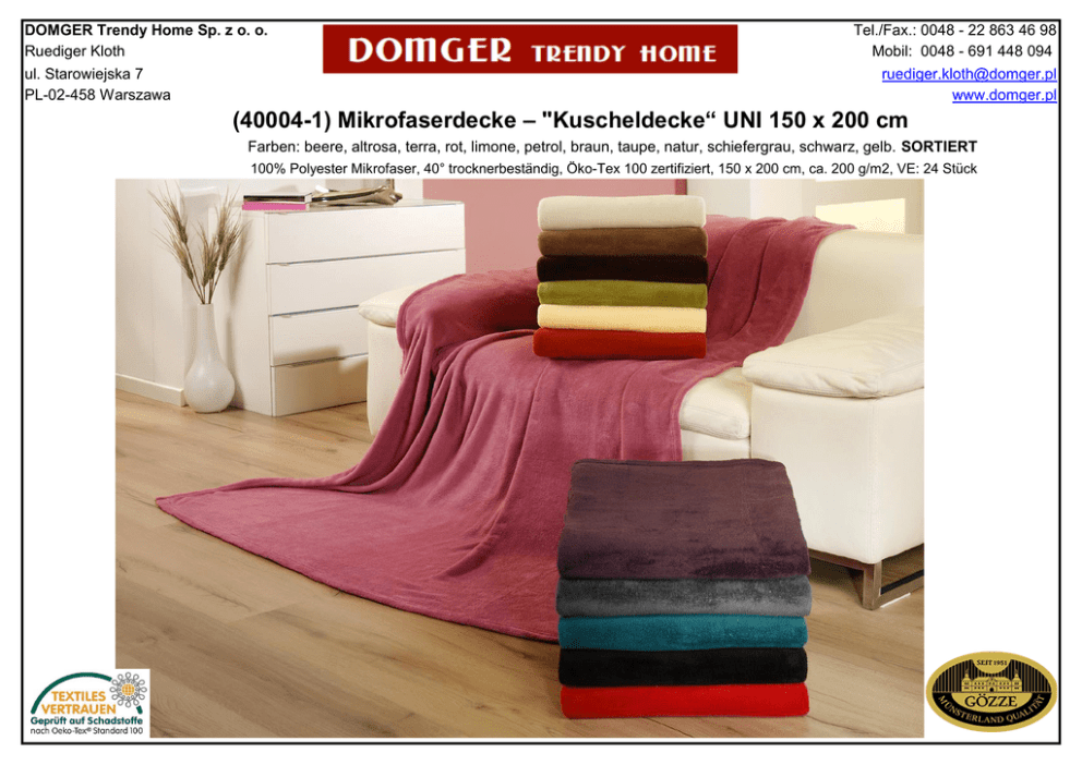 DOMGER Trendy Home Sp. z o. o. Ruediger Kloth ul. Starowiejska 7 PL-02-458 Warszawa Tel./Fax.: 0048 - 22 863 46 98 Mobil: 0048 - 691 448 094 [email protected] www.domger.pl (40004-1) Mikrofaserdecke – "Kuscheldecke“ UNI 150 x 200 cm Farben: beere, altrosa, terra, rot, limone, petrol, braun, taupe, natur, schiefergrau, schwarz, gelb. SORTIERT 100% Polyester Mikrofaser, 40° trocknerbeständig, Öko-Tex 100 zertifiziert, 150 x 200 cm, ca. 200 g/m2, VE: 24 Stück DOMGER Trendy Home Sp. z o. o. Ruediger Kloth ul. Starowiejska 7 PL-02-458 Warszawa Tel./Fax.: 0048 - 22 863 46 98 Mobil: 0048 - 691 448 094 Mikrofaserdecke "Alpha" 150 x 200 cm [email protected] www.domger.pl Farbe grau Farbe anthrazit Farbe creme Farbe petrol Farbe krokant Farbe schwarz Farbe gruen DOMGER Trendy Home Sp. z o. o. Ruediger Kloth ul. Starowiejska 7 PL-02-458 Warszawa Tel./Fax.: 0048 - 22 863 46 98 (40070) Mikrofaserdecke "STARS" 150 x 200 cm Mobil: 0048 - 691 448 094 [email protected] www.domger.pl ca. 250 g/m², 100% Polyester Mikrofaser. 40°, trocknerbeständig. Öko-Tex 100 zertifiziert 40070-91-150200 Farbe anthrazit 40070-71-150200, Farbe taupe 40070-55-150200 Farbe aqua 40070-39-150200 Farbe altrosa DOMGER Trendy Home Sp. z o. o. Ruediger Kloth ul. Starowiejska 7 PL-02-458 Warszawa Tel./Fax.: 0048 - 22 863 46 98 (40072) Mikrofaserdecke "Kitzbühel" 150 x 200 cm Mobil: 0048 - 691 448 094 [email protected] www.domger.pl ca. 250 g/m², 100% Polyester Mikrofaser. 40°, trocknerbeständig. Öko-Tex 100 zertifiziert 40072-71-150200, Farbe 71 taupe 40072-37-150200, Farbe 37 rot DOMGER Trendy Home Sp. z o. o. Ruediger Kloth ul. Starowiejska 7 PL-02-458 Warszawa Tel./Fax.: 0048 - 22 863 46 98 (40073) Mikrofaserdecke "ISCHGL" 150 x 200 cm Mobil: 0048 - 691 448 094 [email protected] www.domger.pl ca. 250 g/m², 100% Polyester Mikrofaser. 40°, trocknerbeständig. Öko-Tex 100 zertifiziert 40073-37-150200 Farbe rot 40073-71-150200 Farbe taupe DOMGER Trendy Home Sp. z o. o. Ruediger Kloth ul. Starowiejska 7 PL-02-458 Warszawa Tel./Fax.: 0048 - 22 863 46 98 (40074) Mikrofaserdecke "CORTINA" 150 x 200 cm Mobil: 0048 - 691 448 094 [email protected] www.domger.pl ca. 250 g/m², 100% Polyester Mikrofaser. 40°, trocknerbeständig. Öko-Tex 100 zertifiziert 40074-37-150200 Farbe rot 40074-71-150200 Farbe taupe DOMGER Trendy Home Sp. z o. o. Ruediger Kloth ul. Starowiejska 7 PL-02-458 Warszawa Tel./Fax.: 0048 - 22 863 46 98 (40127) Mikrofaserdecke "PUNKTE" 150 x 200 cm Mobil: 0048 - 691 448 094 [email protected] www.domger.pl ca. 250 g/m², 100% Polyester Mikrofaser. 40°, trocknerbeständig. Öko-Tex 100 zertifiziert 40127-39-150200 Farbe altrosa 40127-71-150200 Farbe taupe 40127-55-150200 Farbe aqua 40127-91-150200 Farbe anthrazit 40127-83-150200 Farbe mint DOMGER Trendy Home Sp. z o. o. Ruediger Kloth ul. Starowiejska 7 PL-02-458 Warszawa Tel./Fax.: 0048 - 22 863 46 98 Mobil: 0048 - 691 448 094 [email protected] www.domger.pl Mikrofaserdecke – „Memphis Premium“ UNI 150 x 200 cm, 180 x 220cm, 220 x 240cm 88769-150200 88769-180220 XXL 88769-220240 XXXL Farben: grün 80, kaminrot 30, gelb 12, petrol 54, dunkellila 38, anthrazit 91, creme 10, taupe 71, braun 72, schwarz 94, rot 37, marineblau 50, silber 90, dunkelgruen 85 100% Polyester Mikrofaser, Öko-Tex 100 zertifiziert, 40° trocknerbeständig, ca. 280 g/m2, VE: 6 Stück DOMGER Trendy Home Sp. z o. o. Ruediger Kloth ul. Starowiejska 7 PL-02-458 Warszawa Tel./Fax.: 0048 - 22 863 46 98 Mobil: 0048 - 691 448 094 [email protected] www.domger.pl (88772) Mikrofaserdecke "Tennessee" – „Memphis Premium“ Druck, 150 x 200 cm 100% Polyester Mikrofaser, Öko-Tex 100 zertifiziert, 40° trocknerbeständig, ca. 280 g/m2, VE: 6 Stück 88772-71-150200 Farbe taupe 88772-54-150200 Farbe petrol 88772-91-150200 Farbe anthrazit DOMGER Trendy Home Sp. z o. o. Ruediger Kloth ul. Starowiejska 7 PL-02-458 Warszawa Tel./Fax.: 0048 - 22 863 46 98 Mobil: 0048 - 691 448 094 [email protected] www.domger.pl 40067 Cord Optik Wohndecke (150x200 cm) + Kissen (50x50 cm) + Rolle (70x22 cm) 100% Polyester Mikrofaser, Öko-Tex 100 zertifiziert, 40° trocknerbeständig, ca. 1.620 gr. /Stück Decke, VE: 6 Stück DOMGER Trendy Home Sp. z o. o. Ruediger Kloth ul. Starowiejska 7 PL-02-458 Warszawa Mikrofaserdecke UNI in Cashmere-Feeling Tel./Fax.: 0048 - 22 863 46 98 Nr.: 40024 Mobil: 0048 - 691 448 094 [email protected] www.domger.pl Qualität, 130 x 170 cm, 180 x 220cm, 220 x 240cm + 50x50cm Farben: wollweiß, sand, taupe, schoko-braun, rot, anthrazit, schwarz, marine, terra/orange, bordeaux, limonegrün, gelb/orange, tannengrün, petrol 100% Polyester Mikrofaser, Öko-Tex 100 zertifiziert, 40° trocknerbeständig, ca. 500 g/m2, VE: 4 Stück DOMGER Trendy Home Sp. z o. o. Ruediger Kloth ul. Starowiejska 7 PL-02-458 Warszawa Tel./Fax.: 0048 - 22 863 46 98 Mobil: 0048 - 691 448 094 [email protected] www.domger.pl (40015) Mikrofaserdecke Antigua in Cashmere-Feeling Qualität, 150 x 200 cm 100% Polyester Mikrofaser 150 x 200 cm, ca. 500 g/m2 VE: 4 Stück, Farben: 2 Öko-Tex 100 zertifiziert 40° trocknerbeständig 40015-71 taupe DOMGER Trendy Home Sp. z o. o. Ruediger Kloth ul. Starowiejska 7 PL-02-458 Warszawa Tel./Fax.: 0048 - 22 863 46 98 Mobil: 0048 - 691 448 094 [email protected] www.domger.pl (40017) Mikrofaserdecke Borneo in Cashmere-Feeling Qualität, 150 x 200 cm 40017-30-kaminrot 100% Polyester Mikrofaser 150 x 200 cm, ca. 500 g/m2 VE: 4 Stück, Farben: 4 Öko-Tex 100 zertifiziert 40° trocknerbeständig 40017-36-orange 40017-80-limonegruen 40017-71-taupe DOMGER Trendy Home Sp. z o. o. Tel./Fax.: 0048 - 22 863 46 98 Mobil: 0048 - 691 448 094 [email protected] www.domger.pl Ruediger Kloth ul. Starowiejska 7 PL-02-458 Warszawa (40018) Mikrofaserdecke KARO in Cashmere-Feeling Qualität, 150 x 200 cm 100% Polyester Mikrofaser 150 x 200 cm, ca. 500 g/m2 VE: 4 Stück, Farben: 2 Öko-Tex 100 zertifiziert 40° trocknerbeständig 40036-51 dunkelblau DOMGER Trendy Home Sp. z o. o. Tel./Fax.: 0048 - 22 86